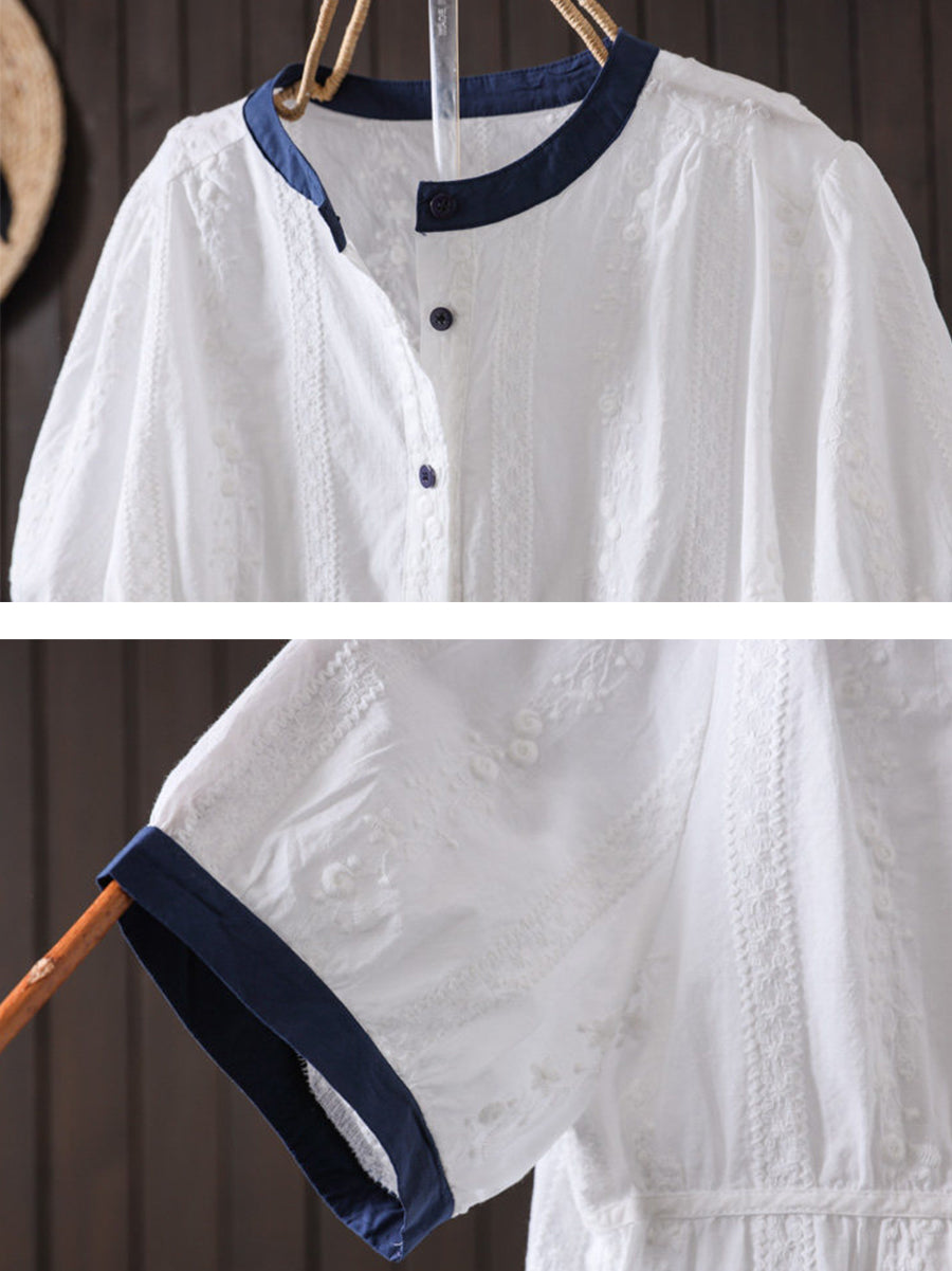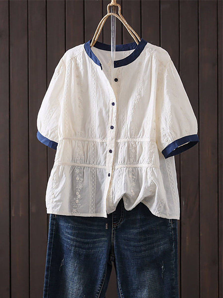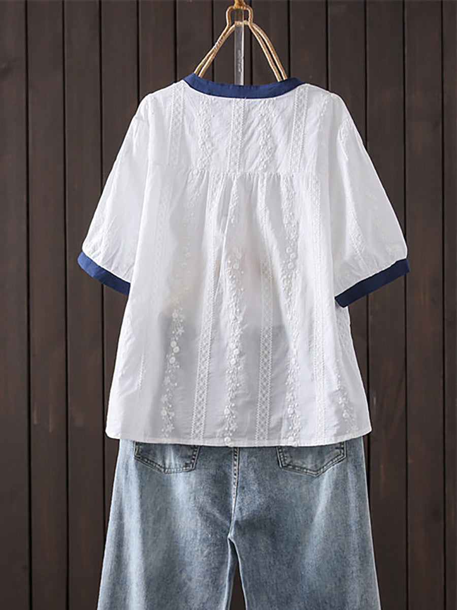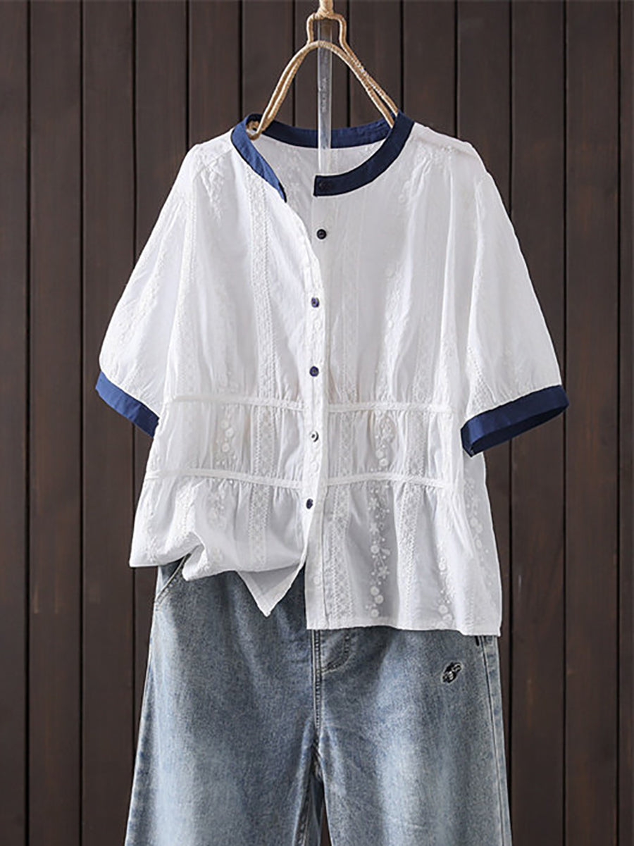 Camisa feminina de verão com bordado artístico e decote redondo em blocos de cores