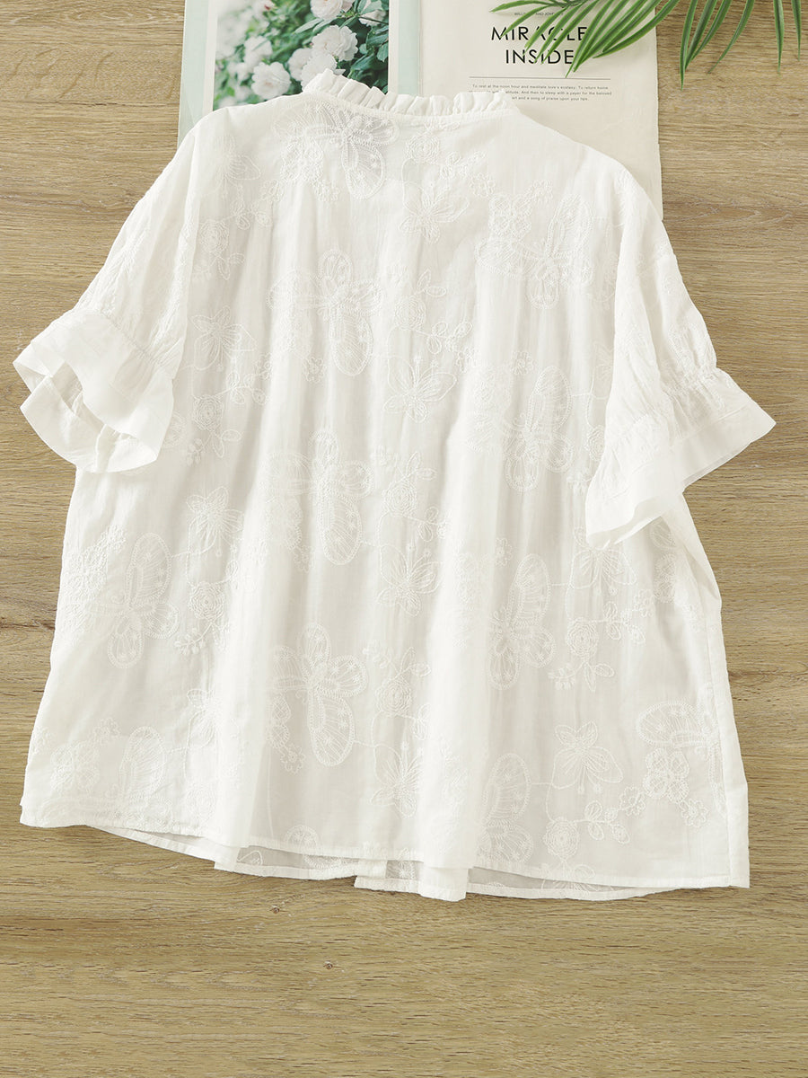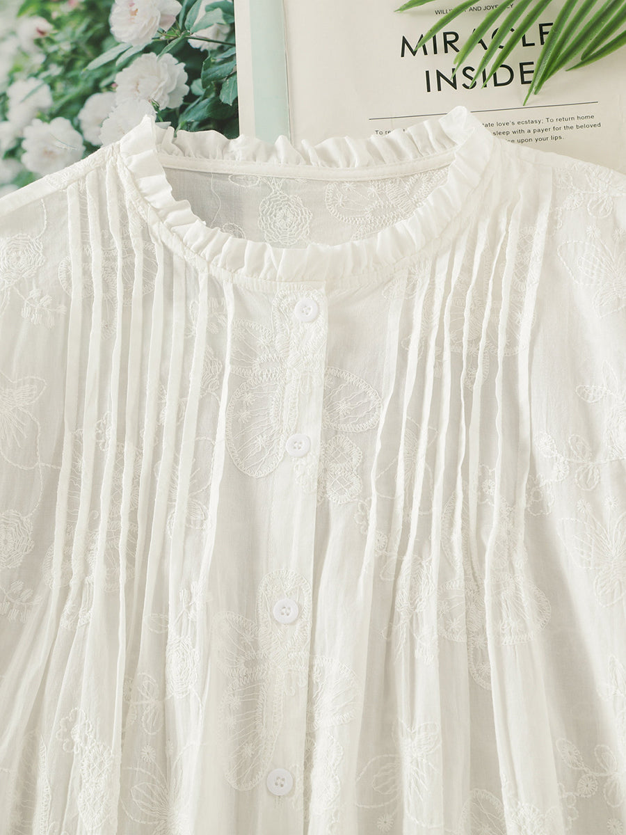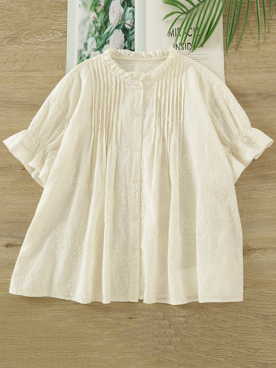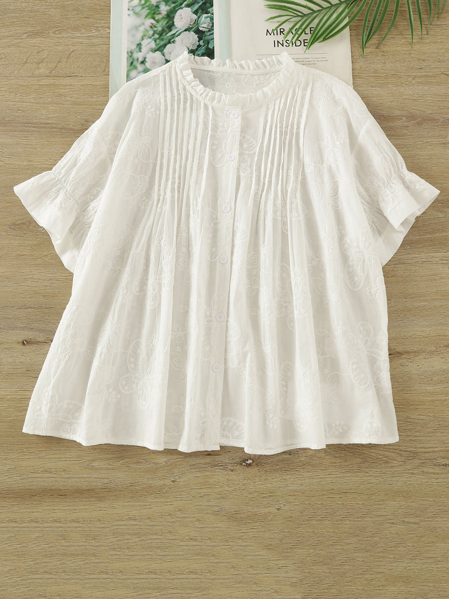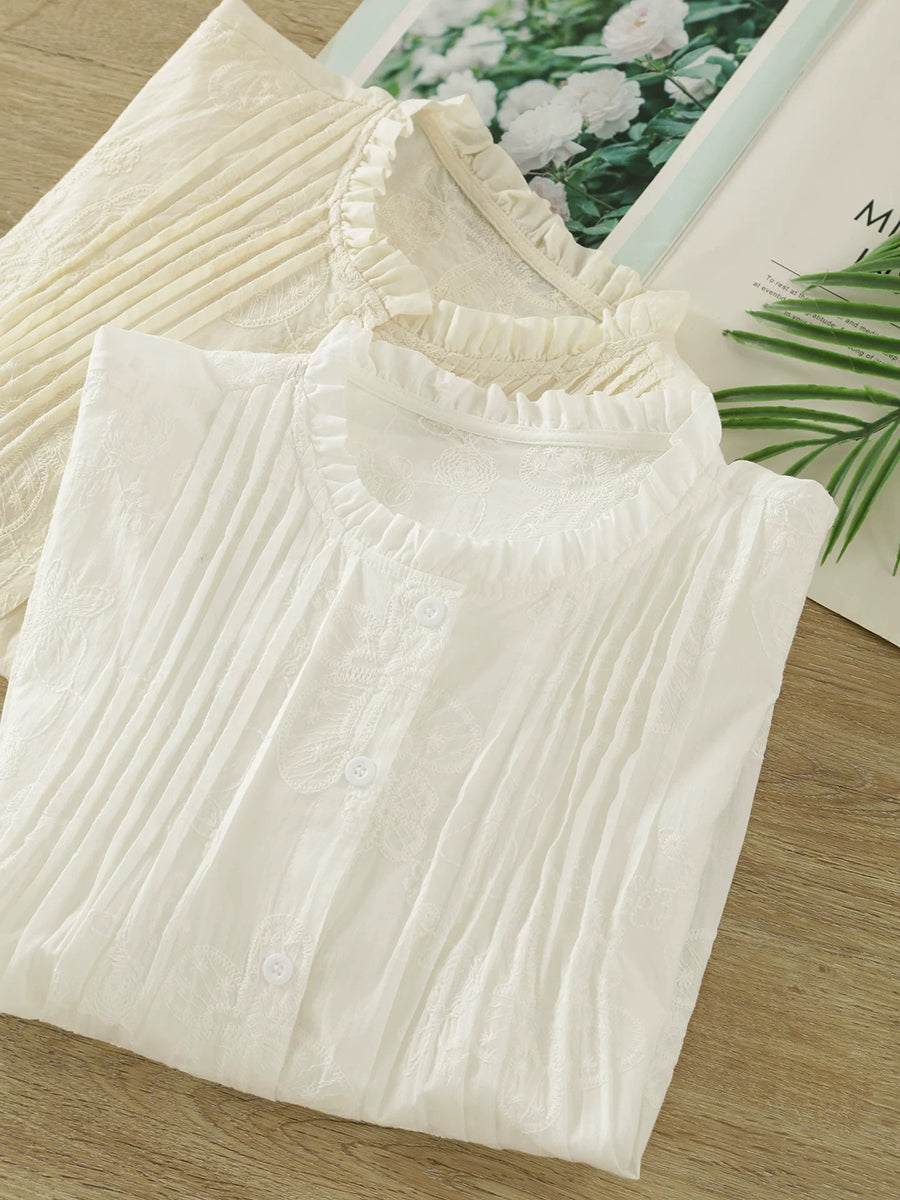 Blusa feminina de verão com bordado artístico e franzido, 100% algodão.