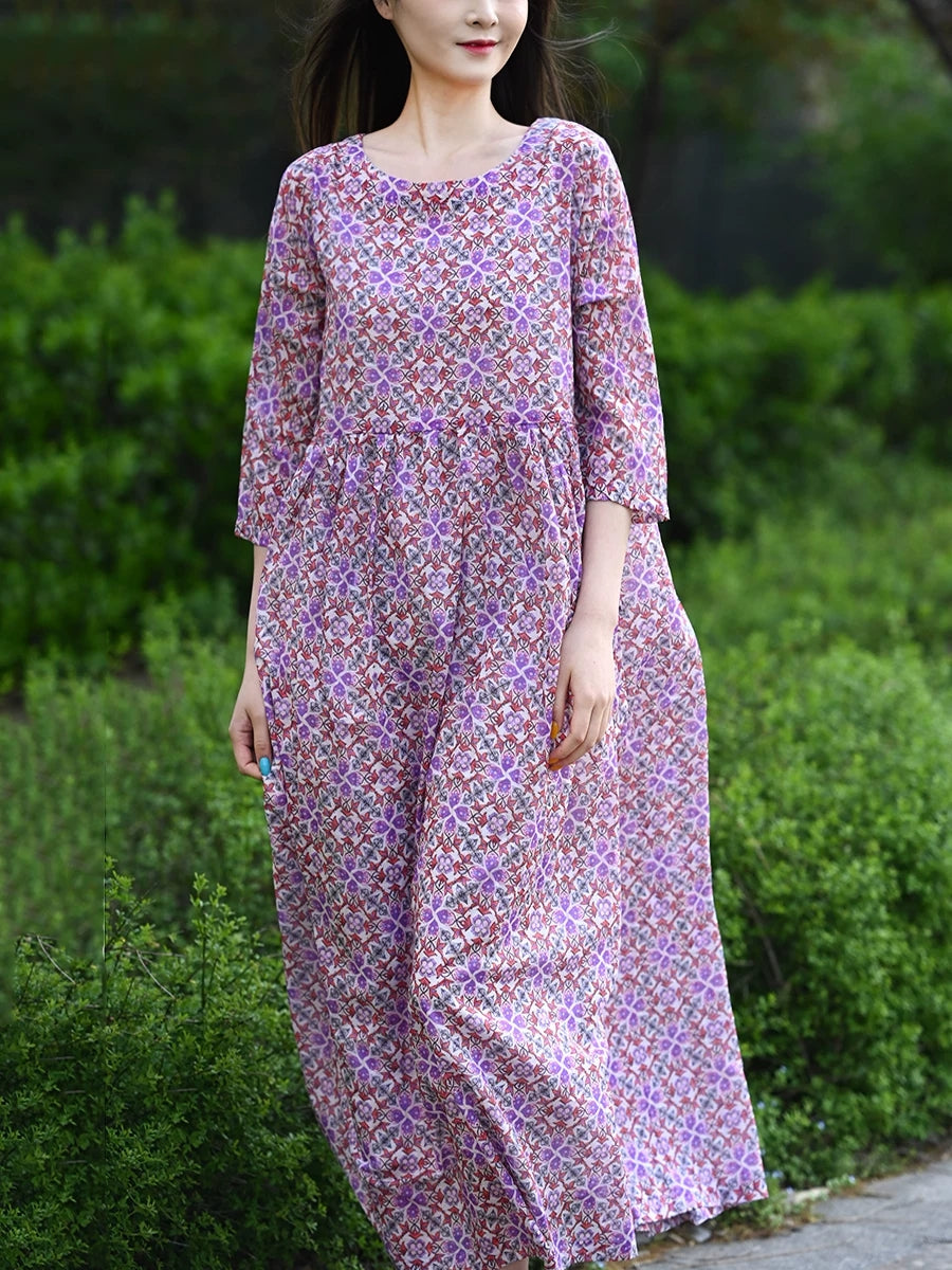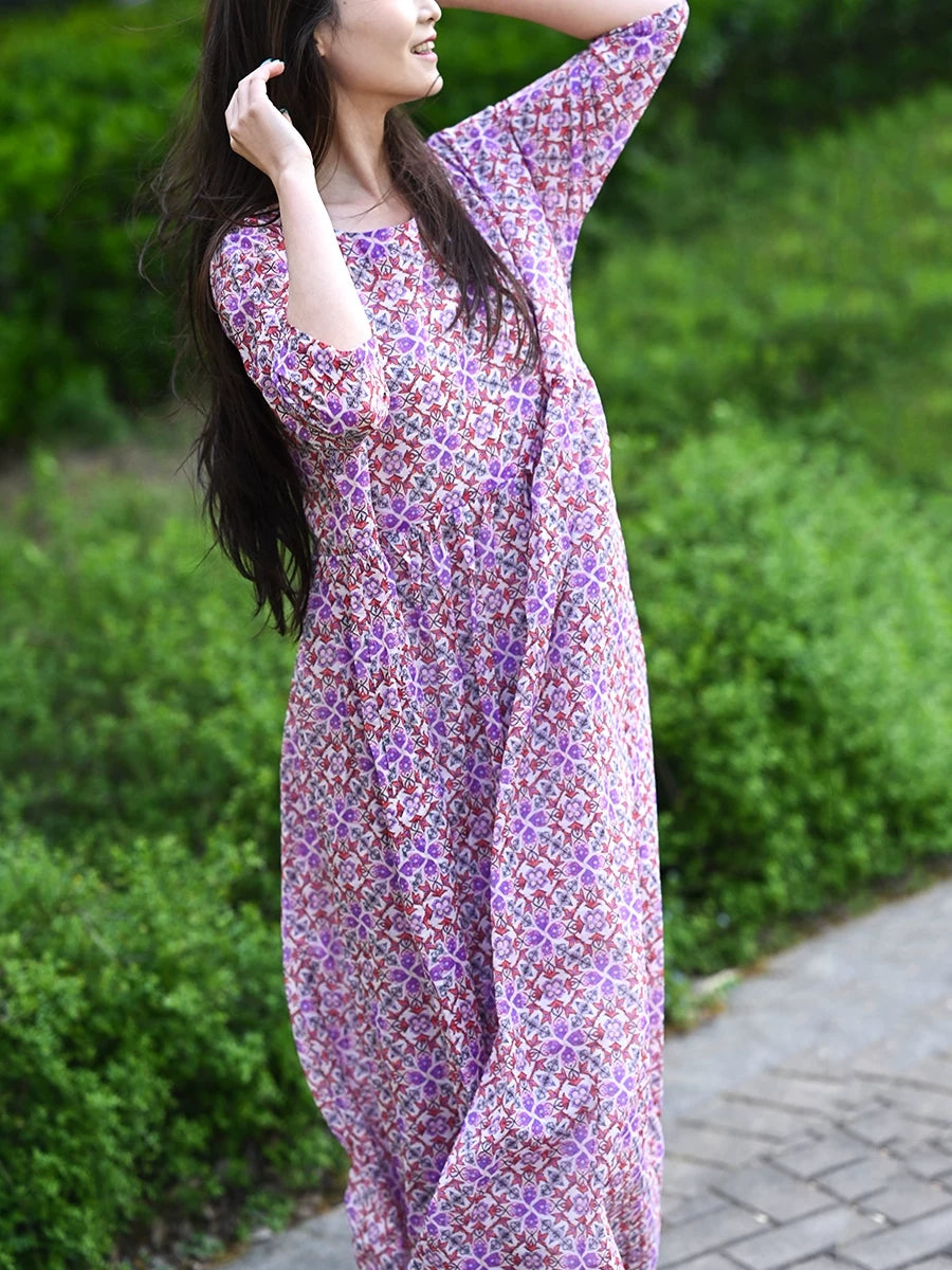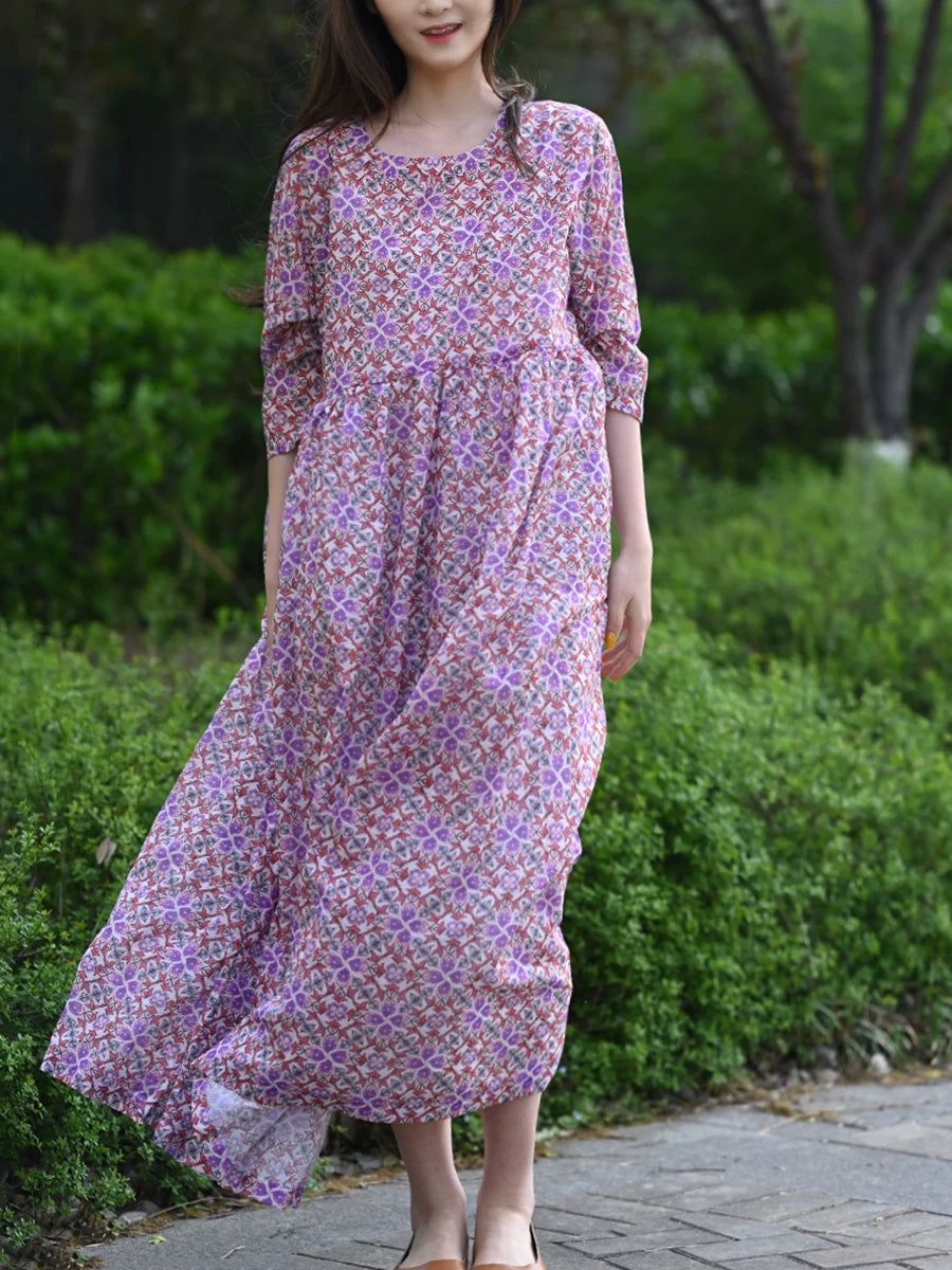 Vestido feminino de verão com estampa floral artística, 100% algodão, gola redonda.