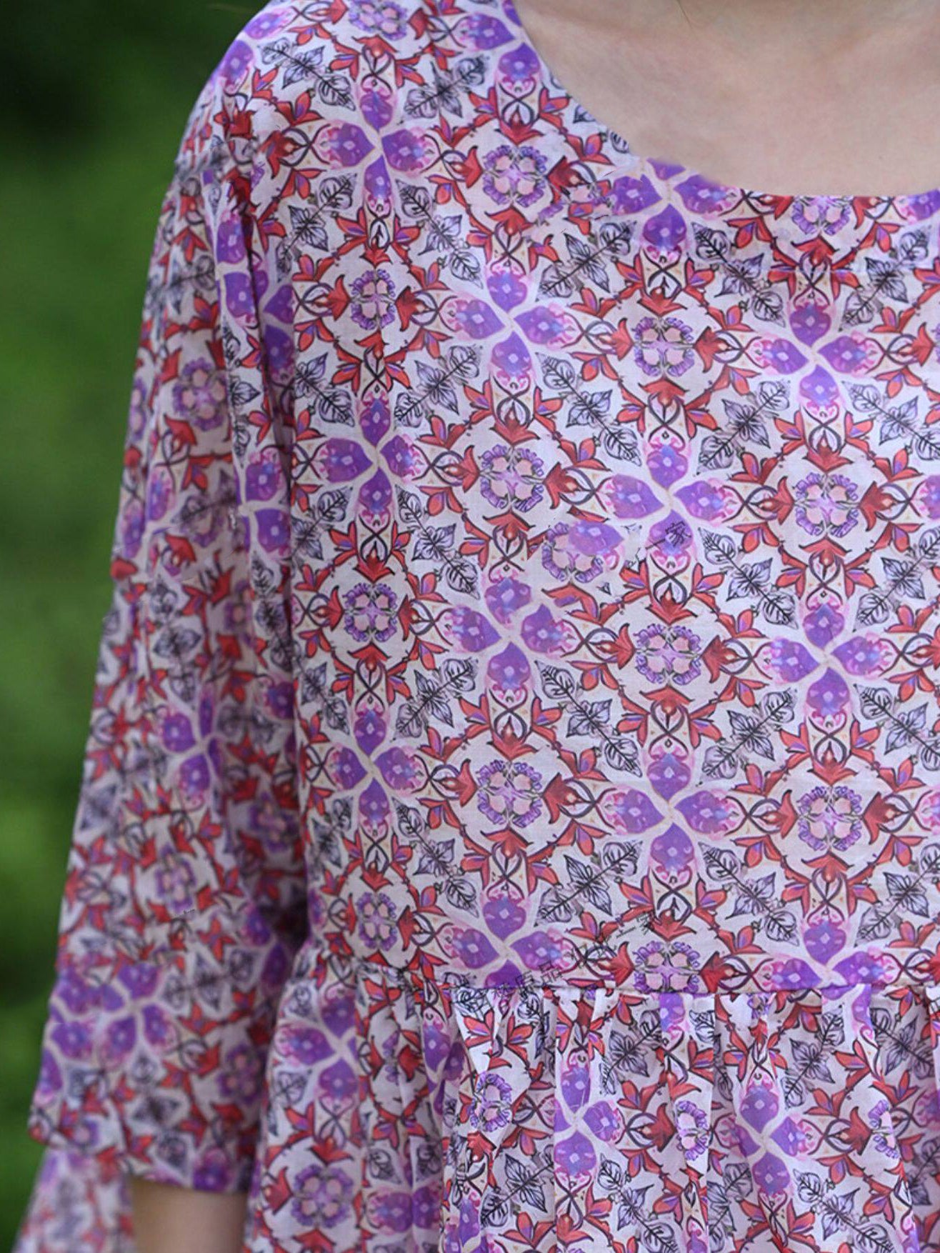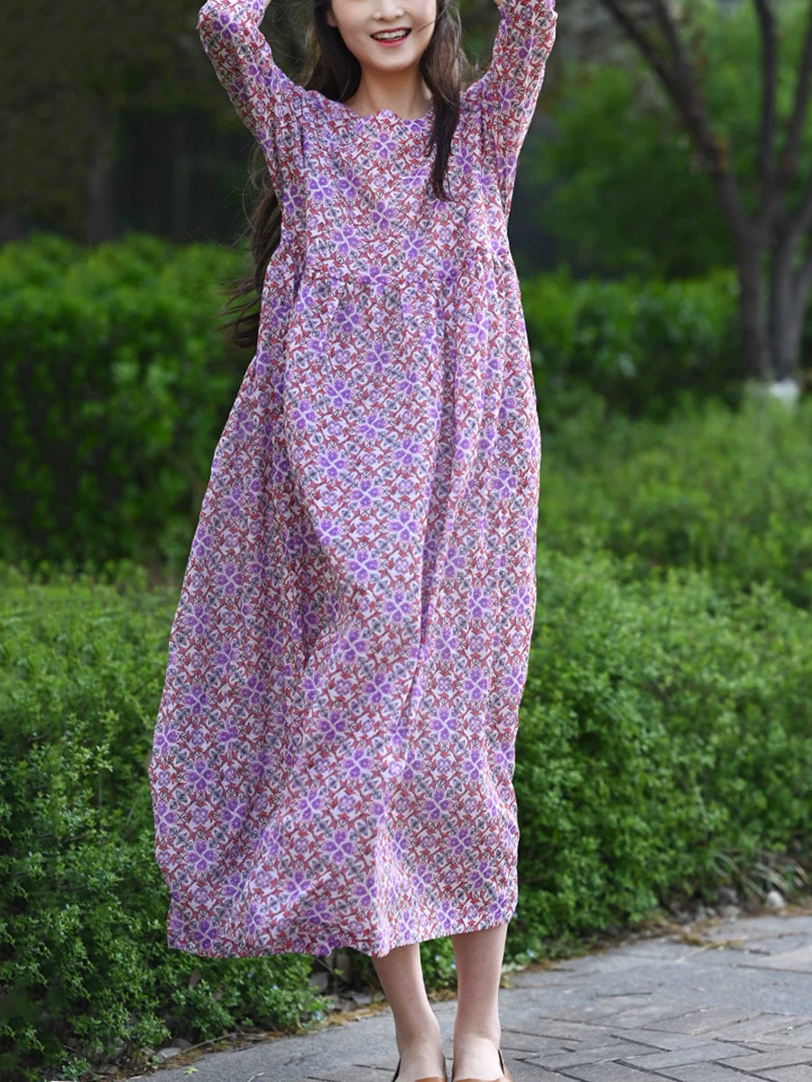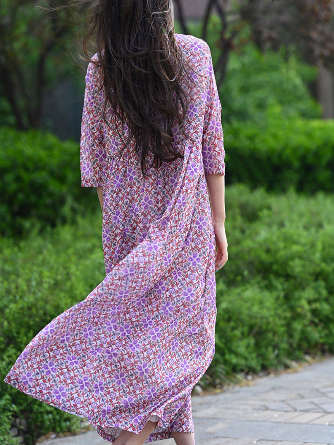 Vestido feminino de verão com estampa floral artística, 100% algodão, gola redonda.