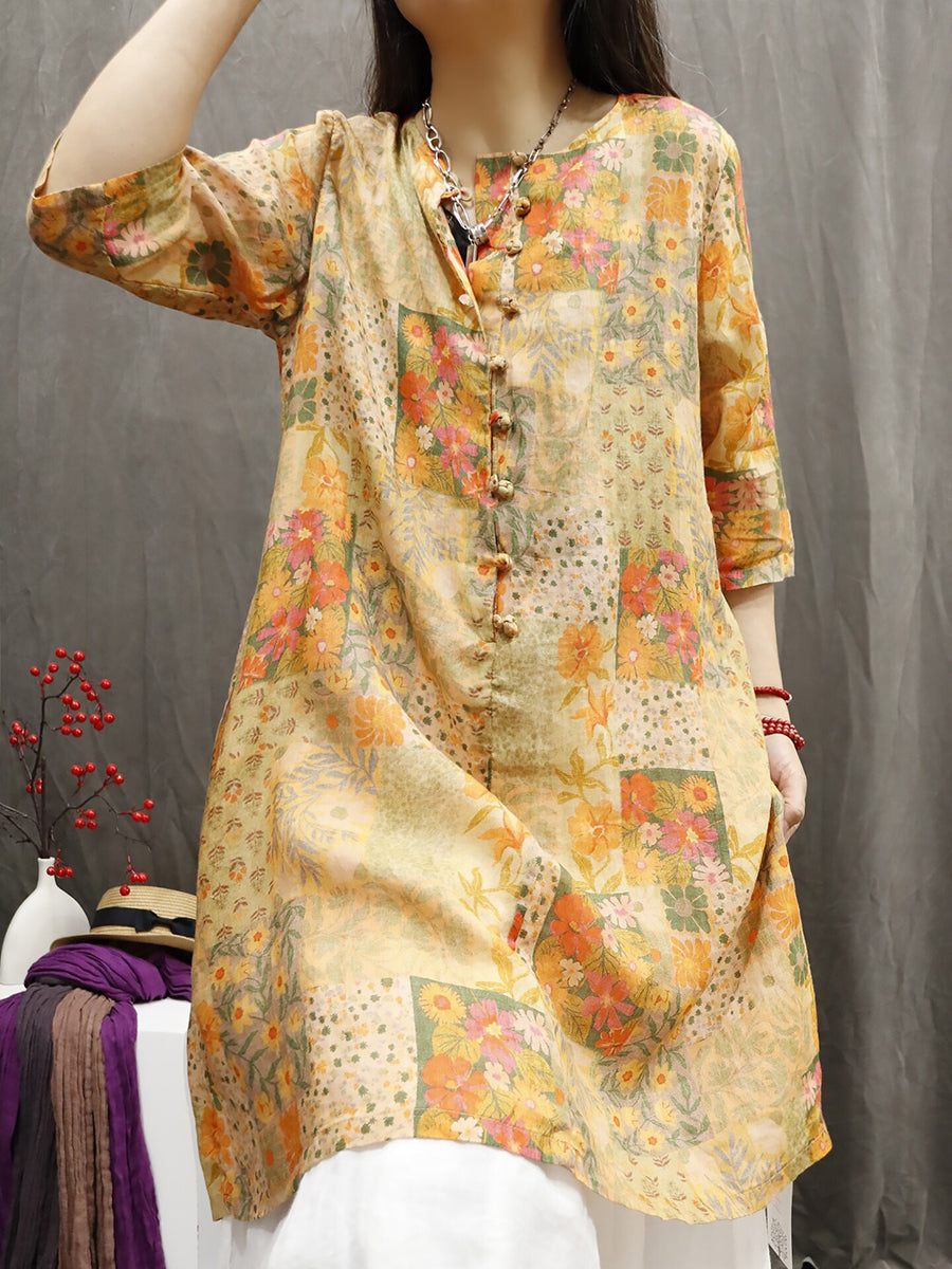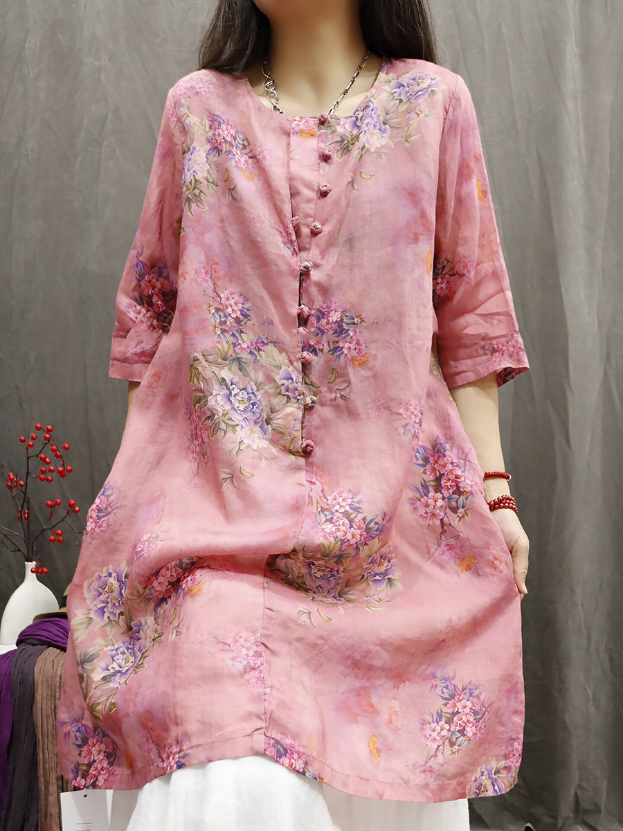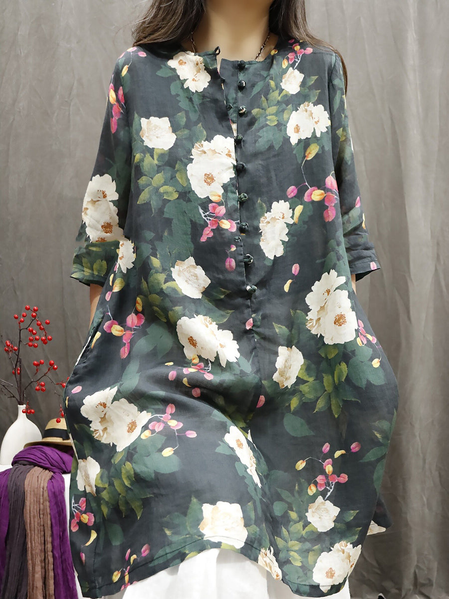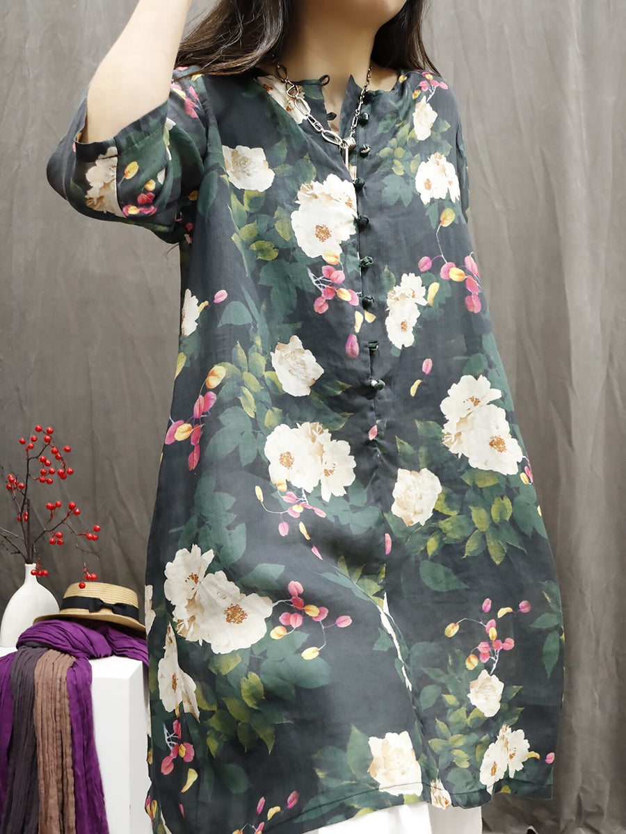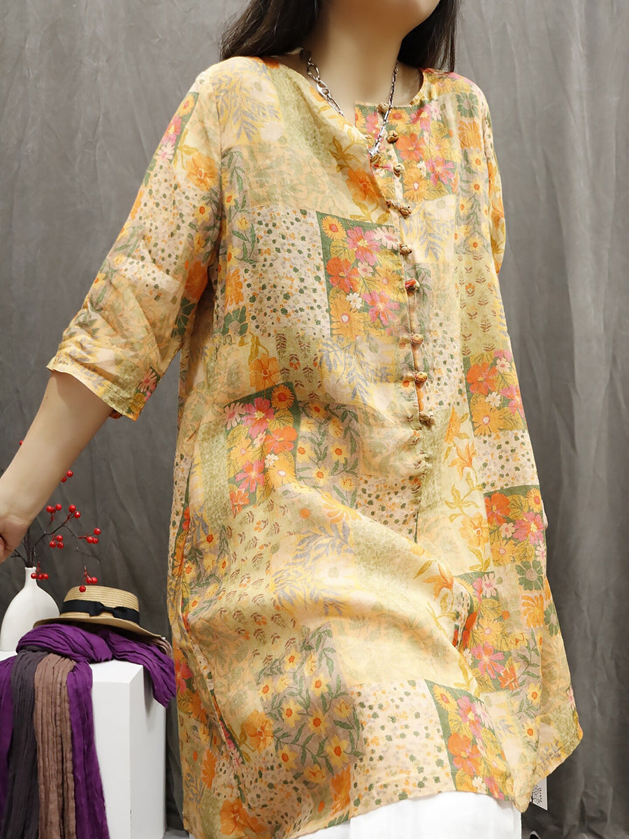 Blusa feminina de verão com estampa floral artística, 100% rami, gola redonda.