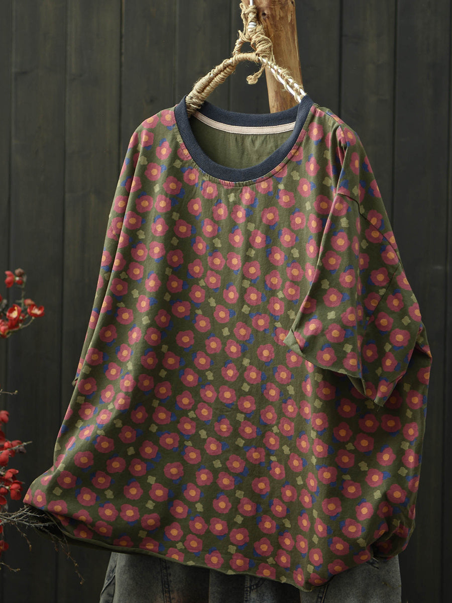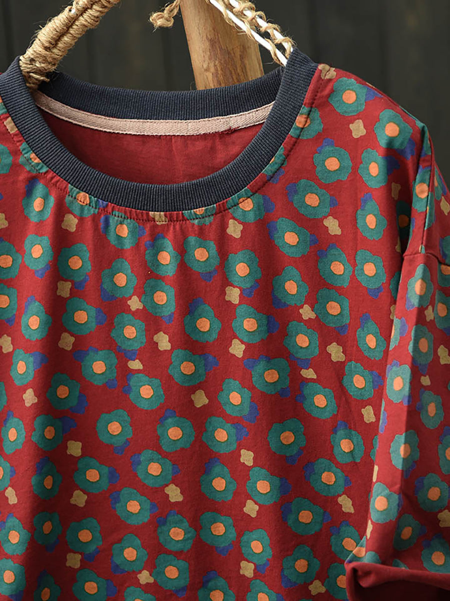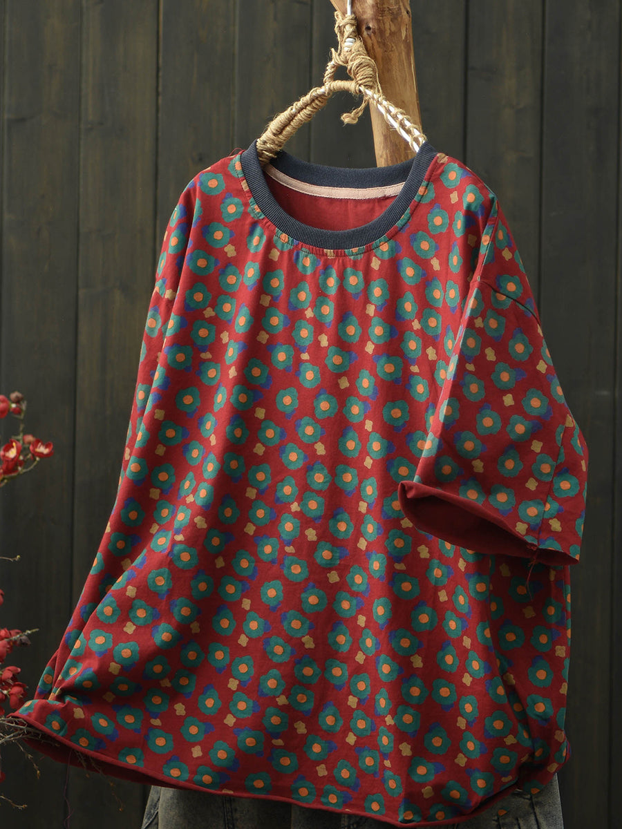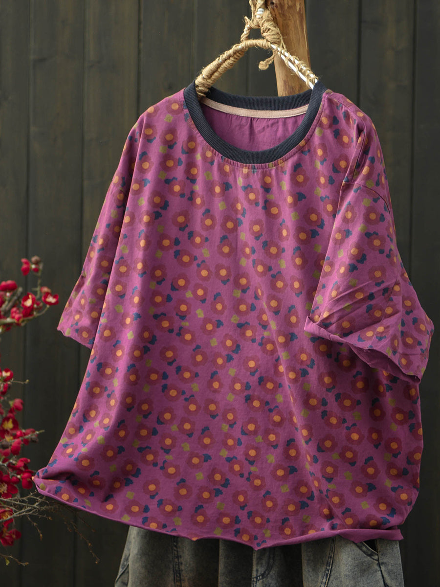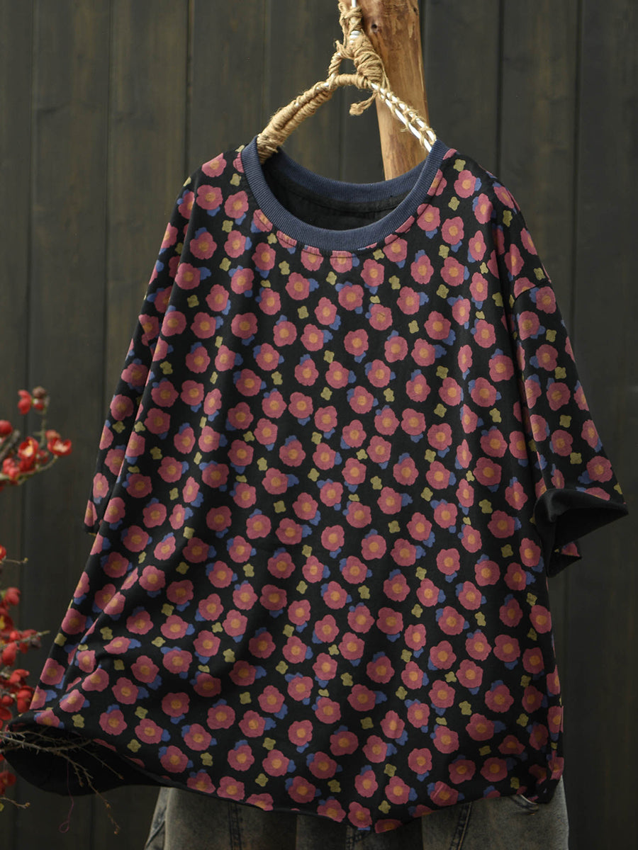Camiseta feminina de verão com estampa floral artística e gola redonda em algodão.