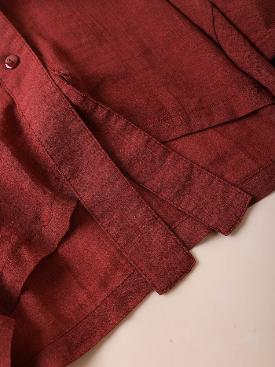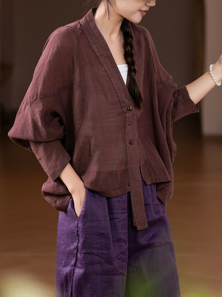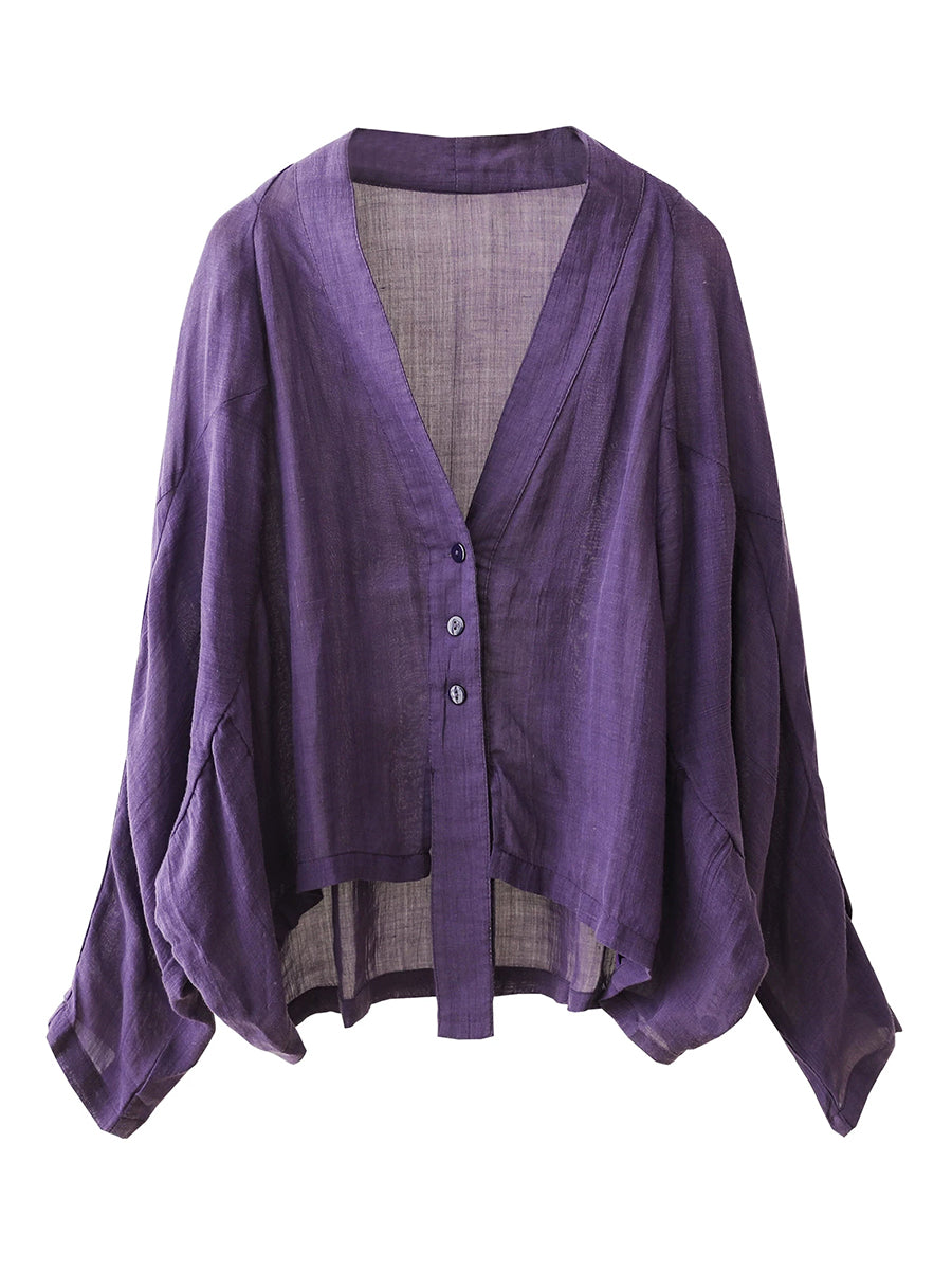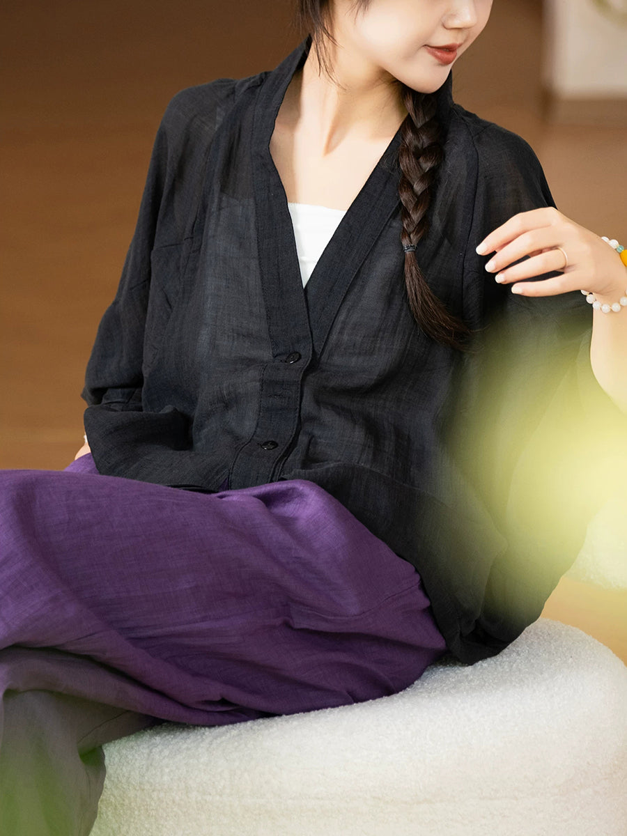 Camisa feminina de verão artística em cores puras, 100% rami, com decote em V.
