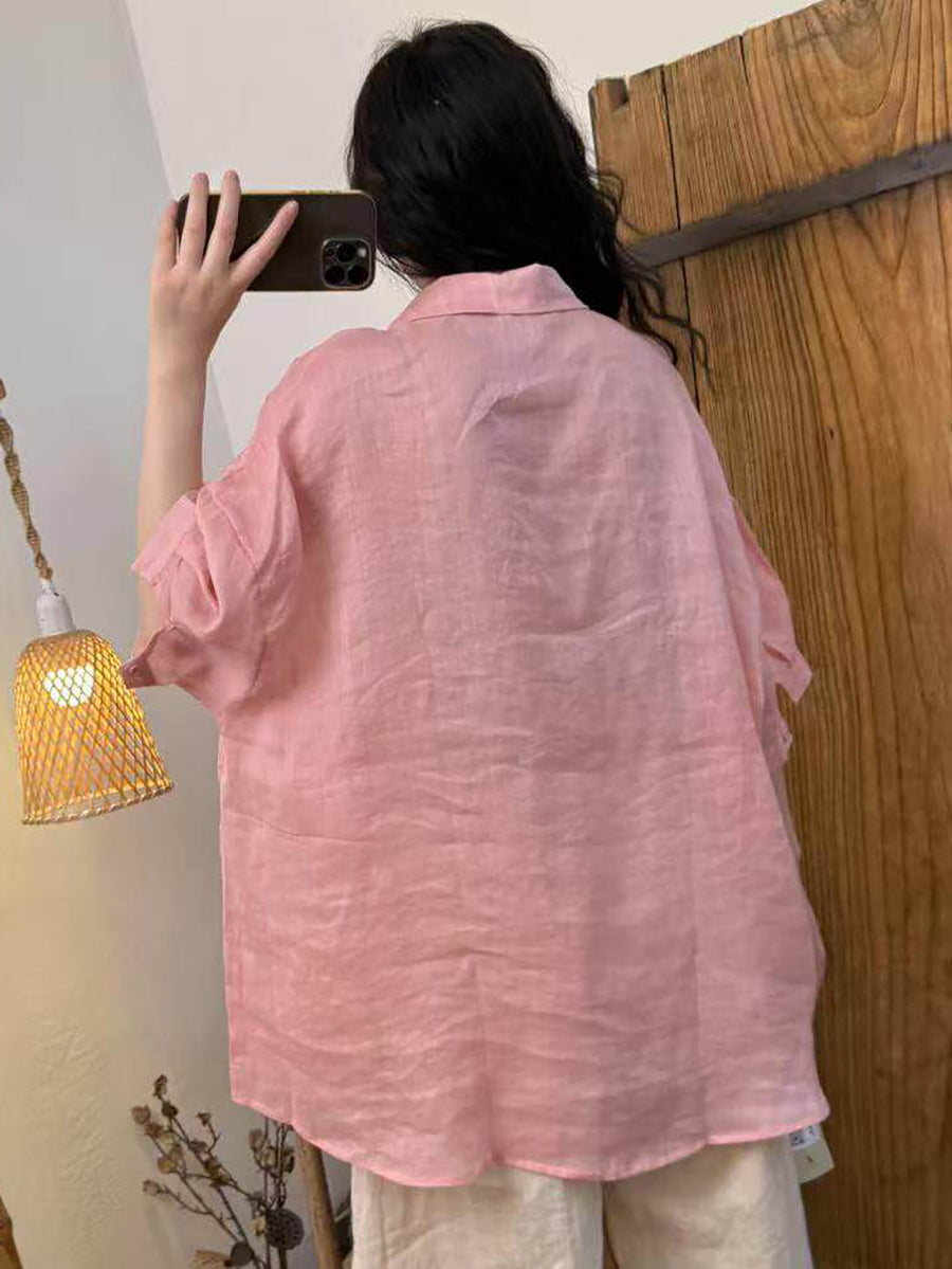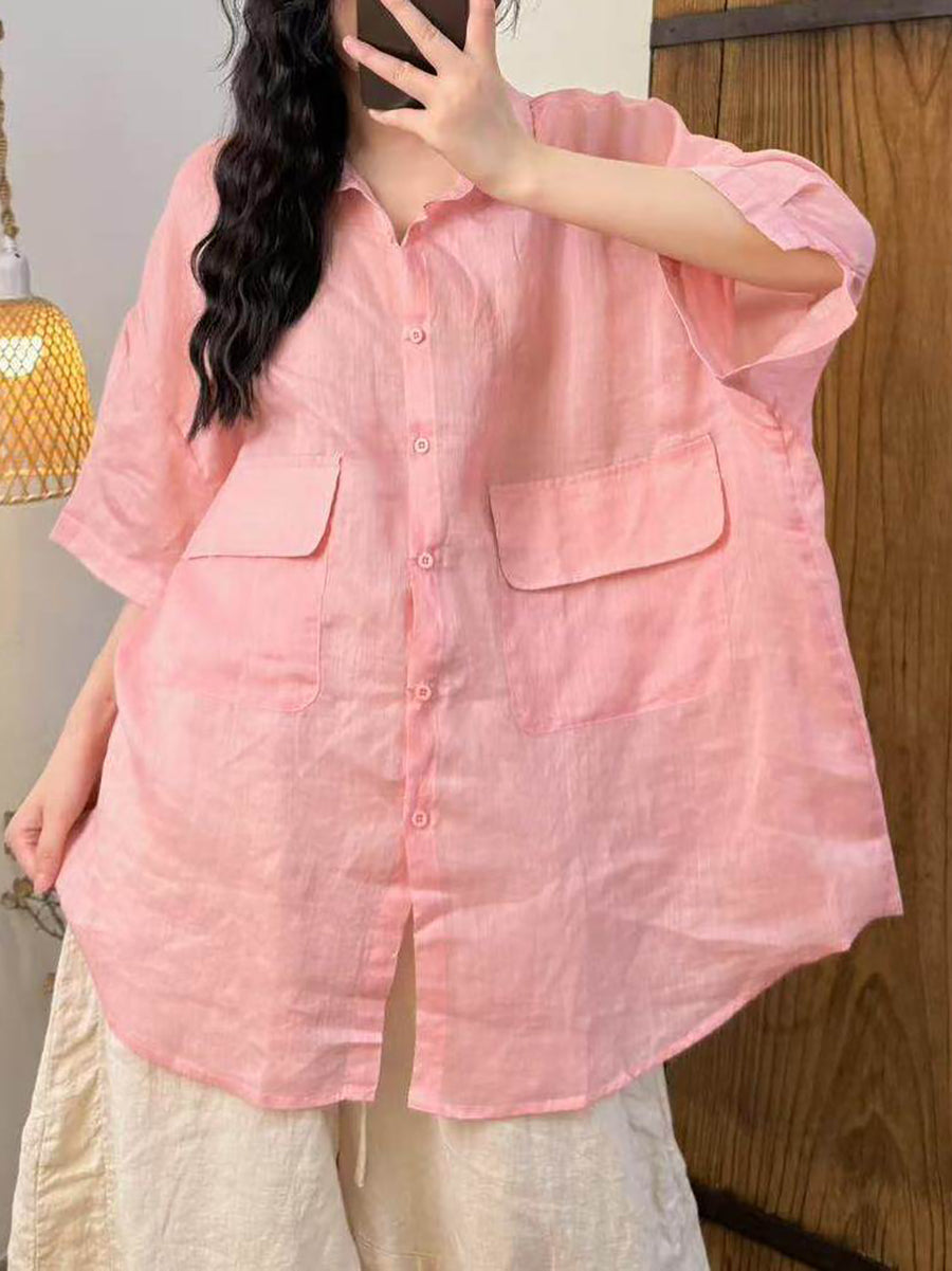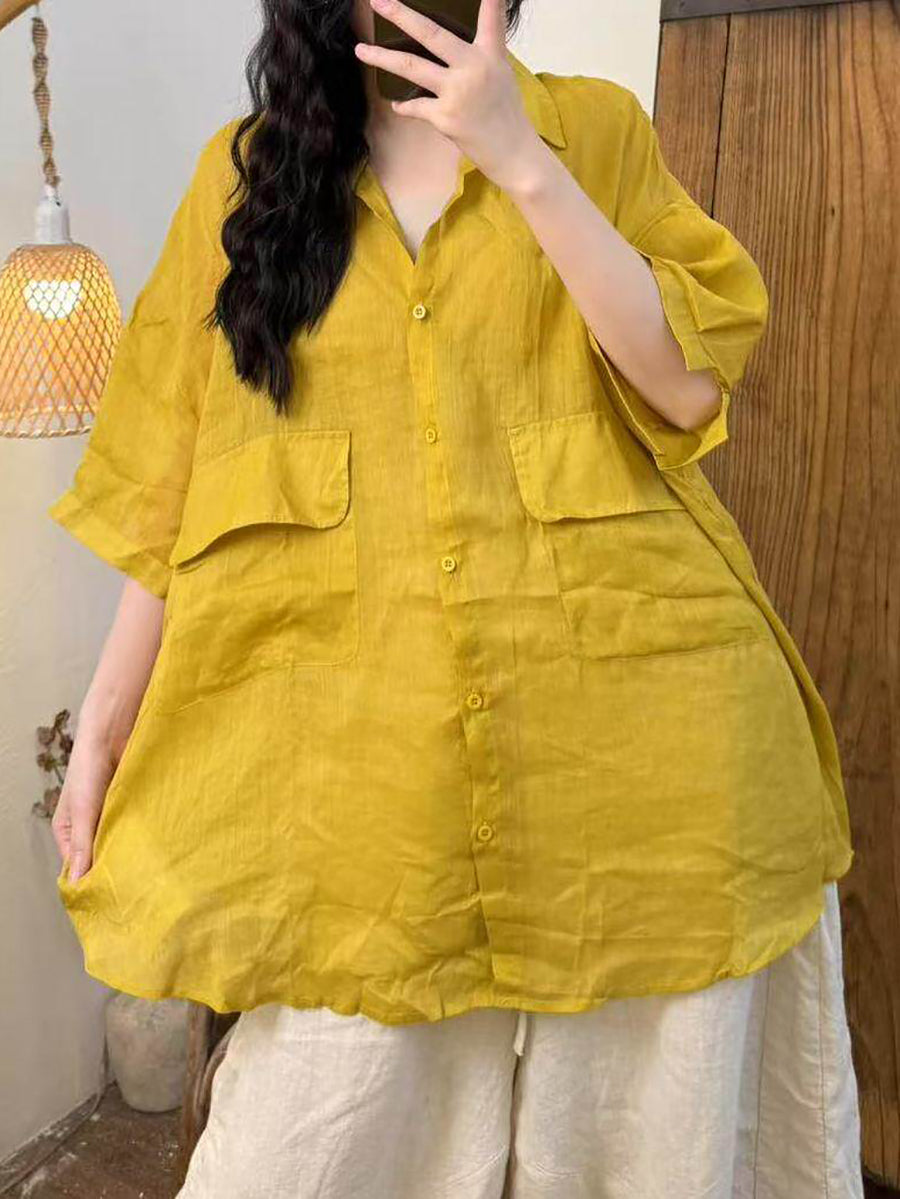 Camisa feminina de verão em rami de cor lisa com estilo artístico