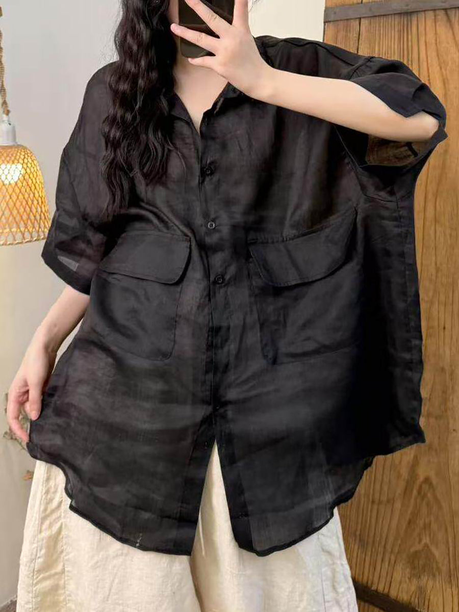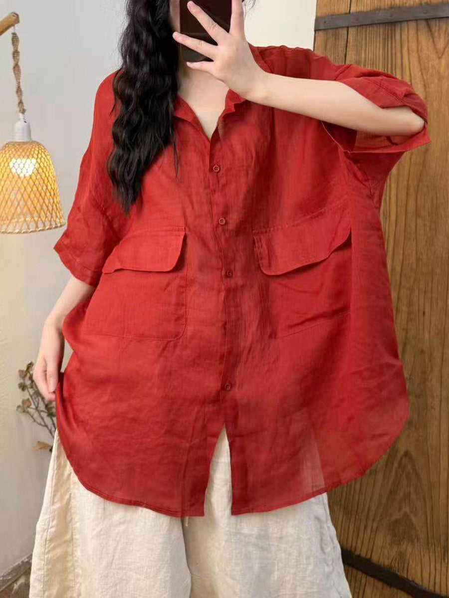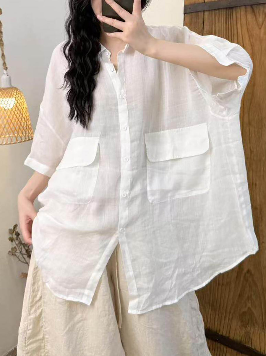 Camisa feminina de verão em rami de cor lisa com estilo artístico