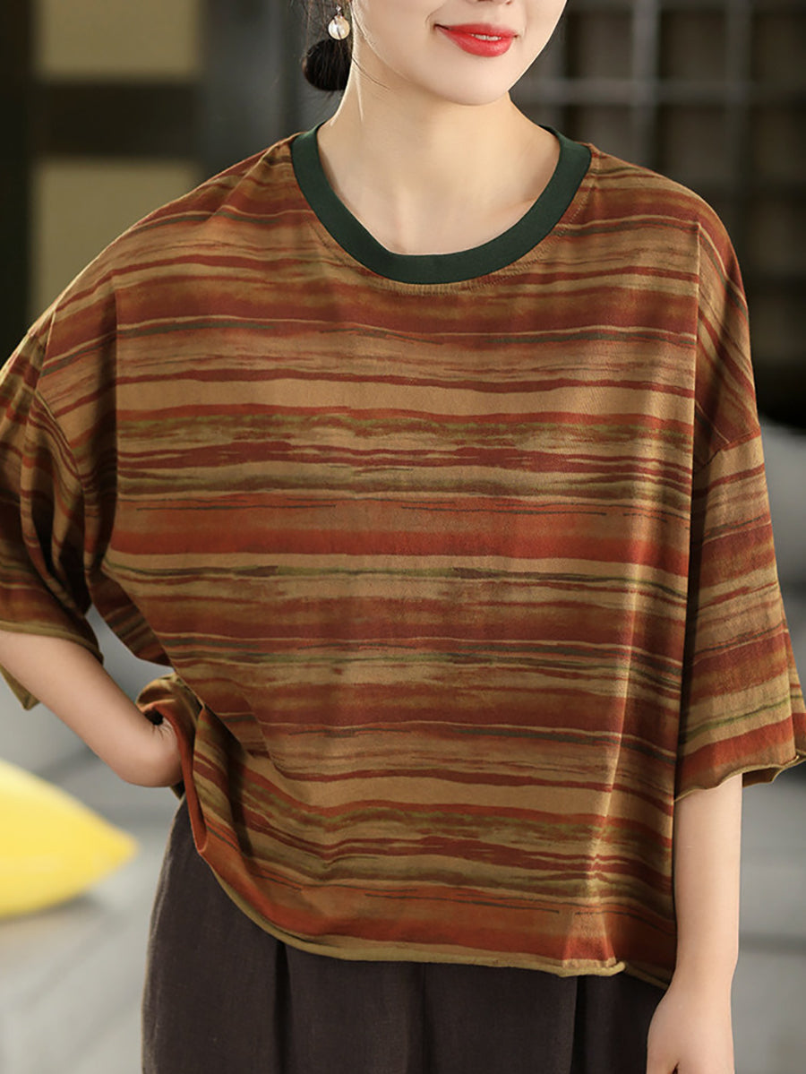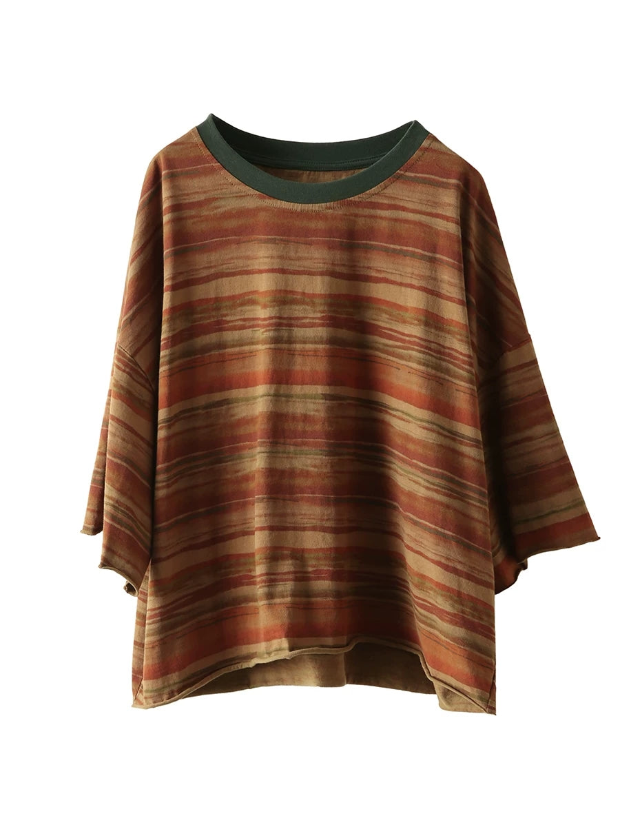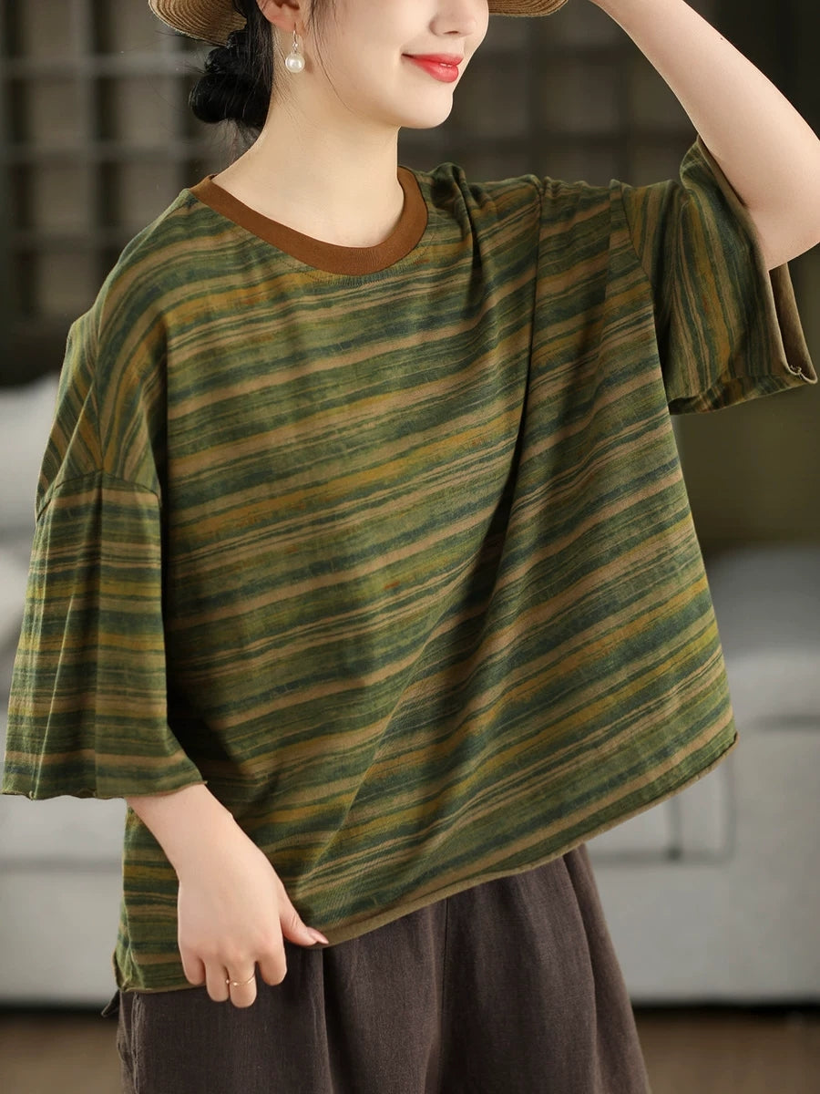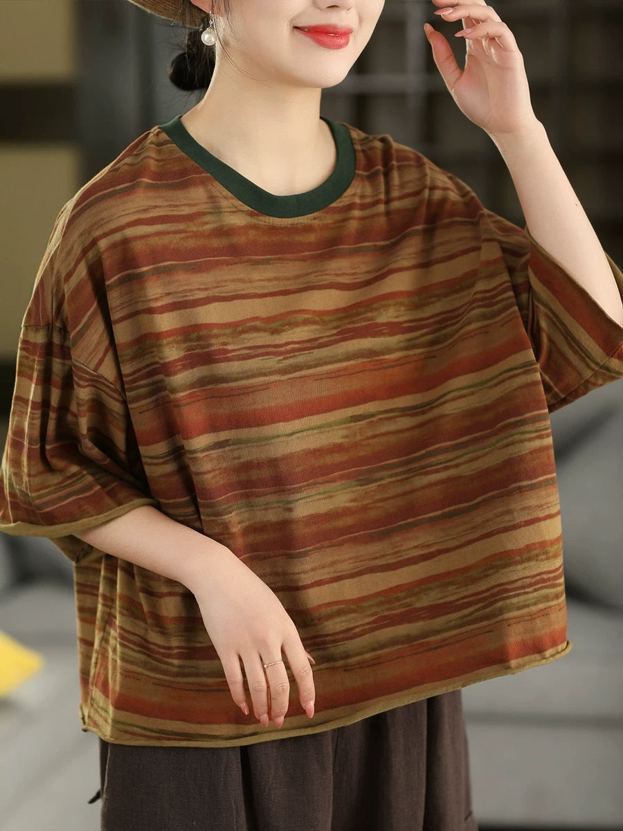 Camiseta feminina de verão com estampa artística de listras e gola redonda, 100% algodão.