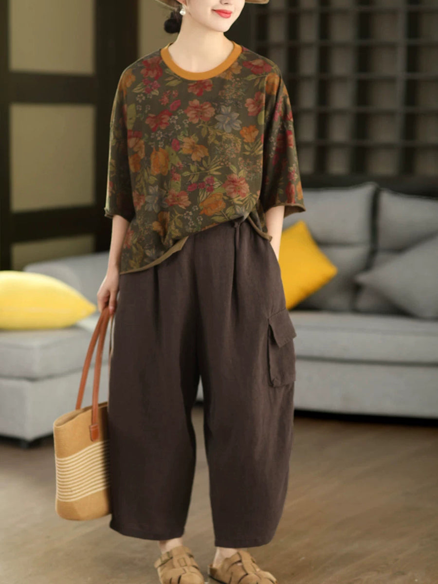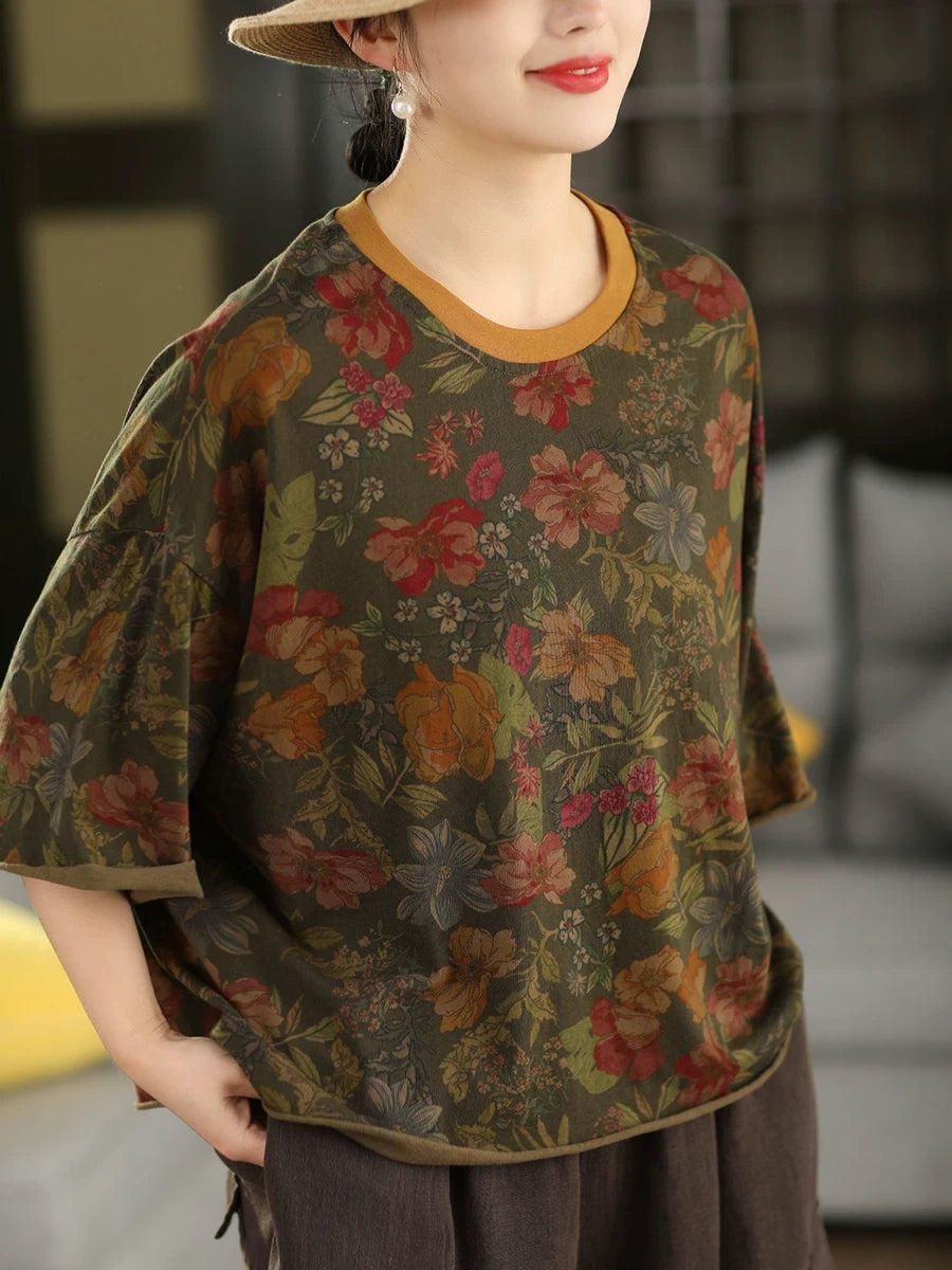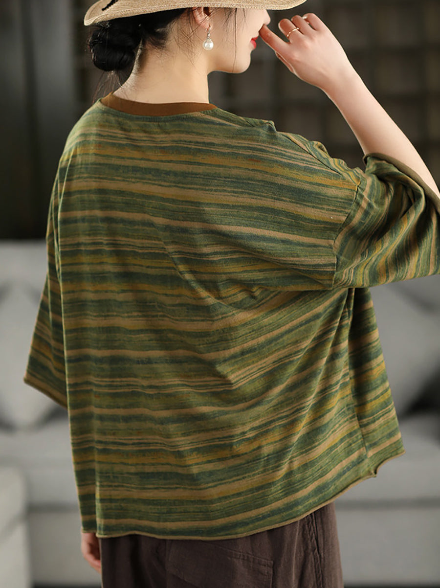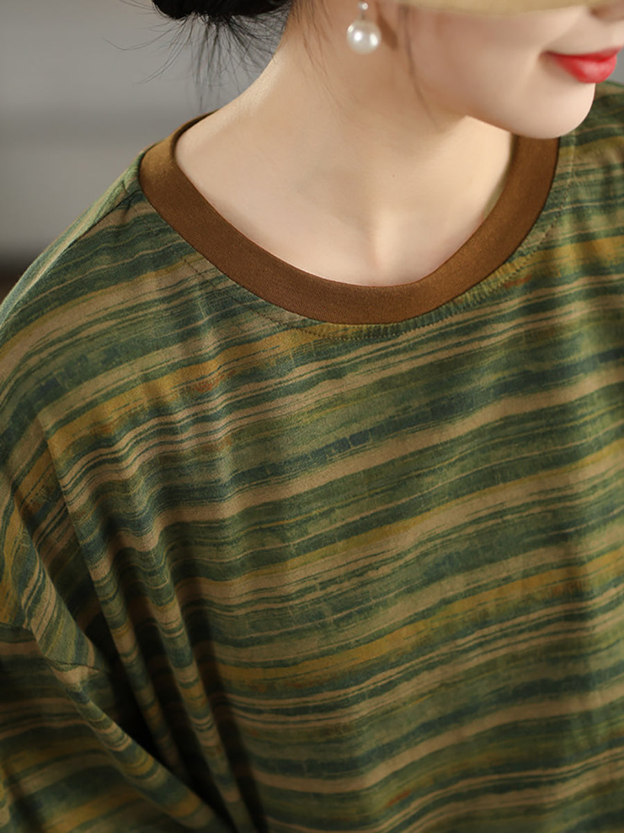 Camiseta feminina de verão com estampa artística de listras e gola redonda, 100% algodão.