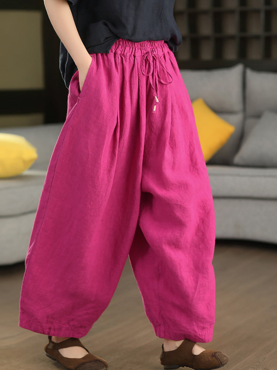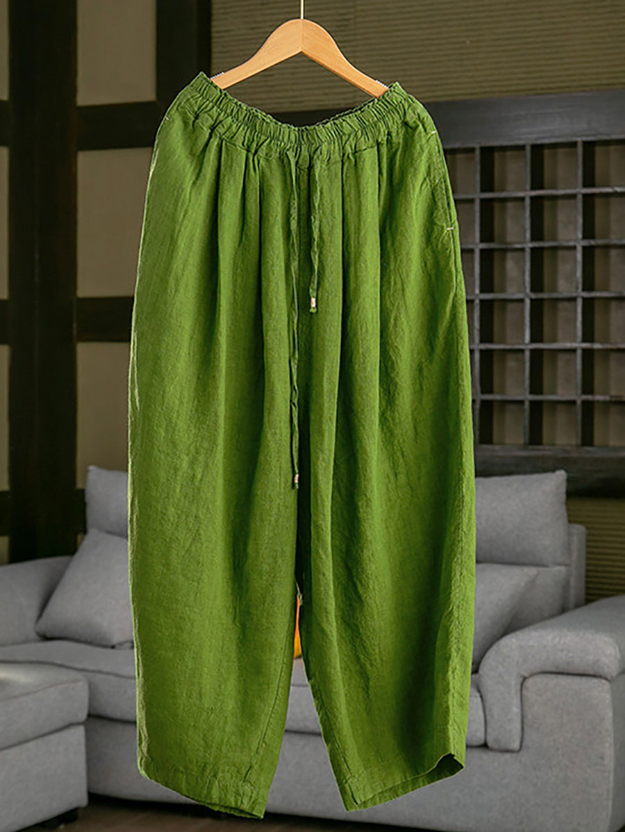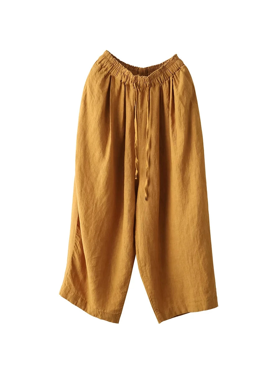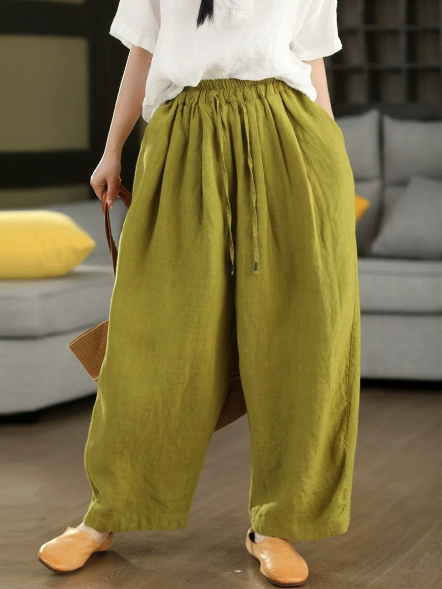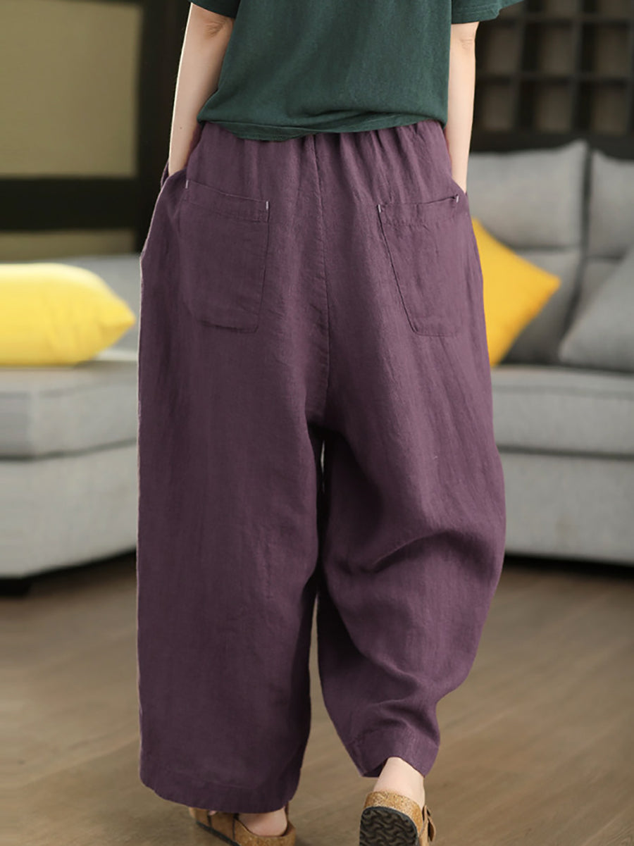 Calça Harem Feminina Casual de Verão em Linho 100% de Cor Lisa