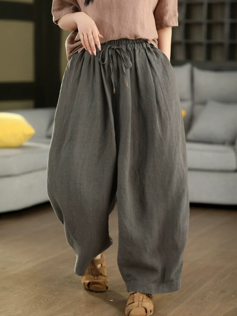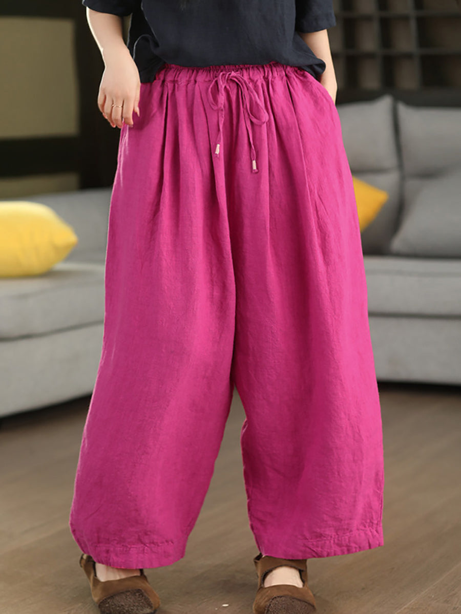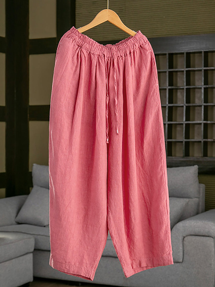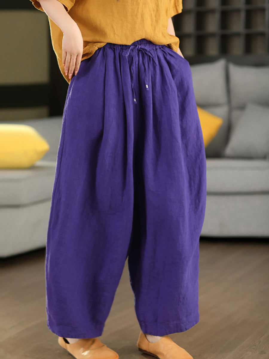 Calça Harem Feminina Casual de Verão em Linho 100% de Cor Lisa