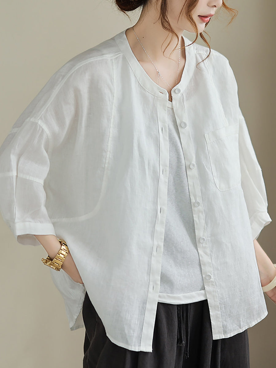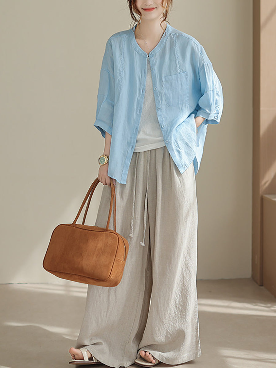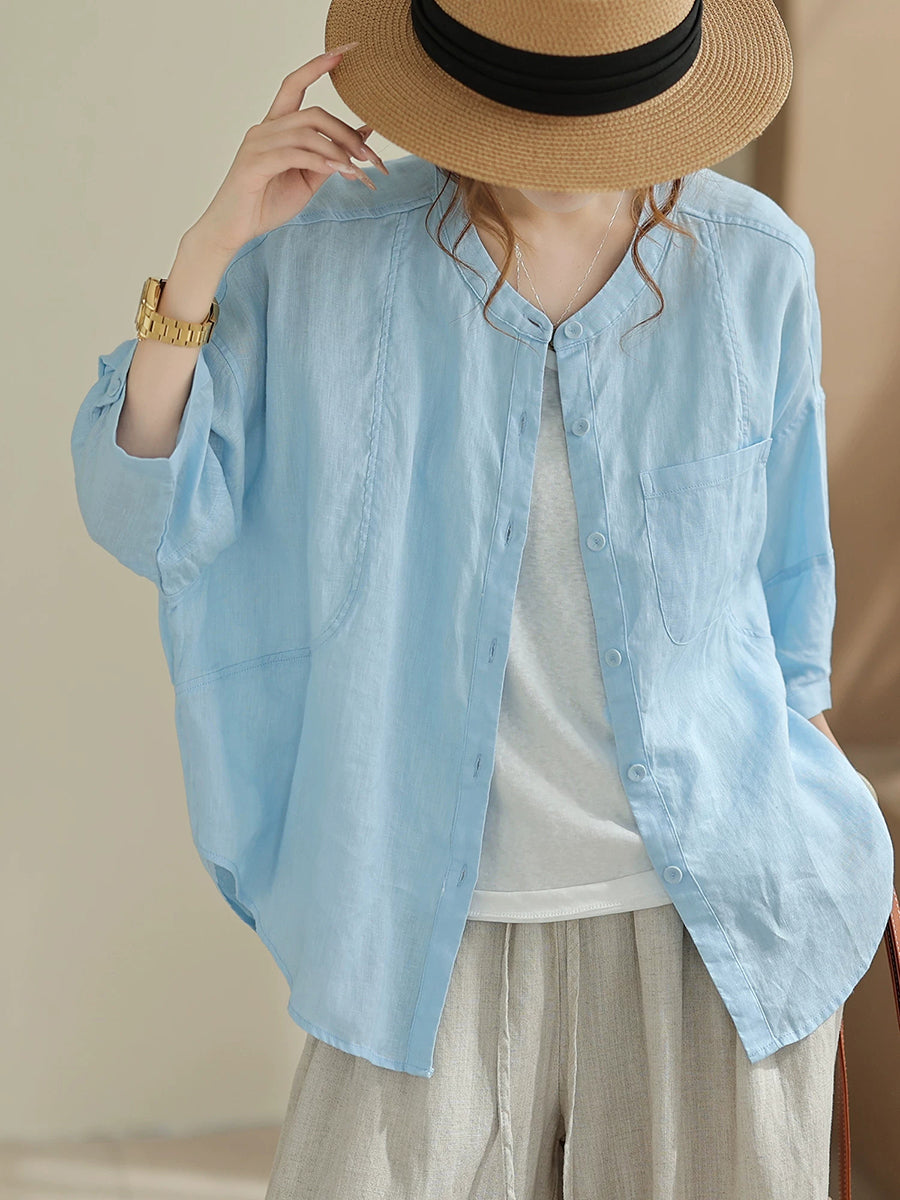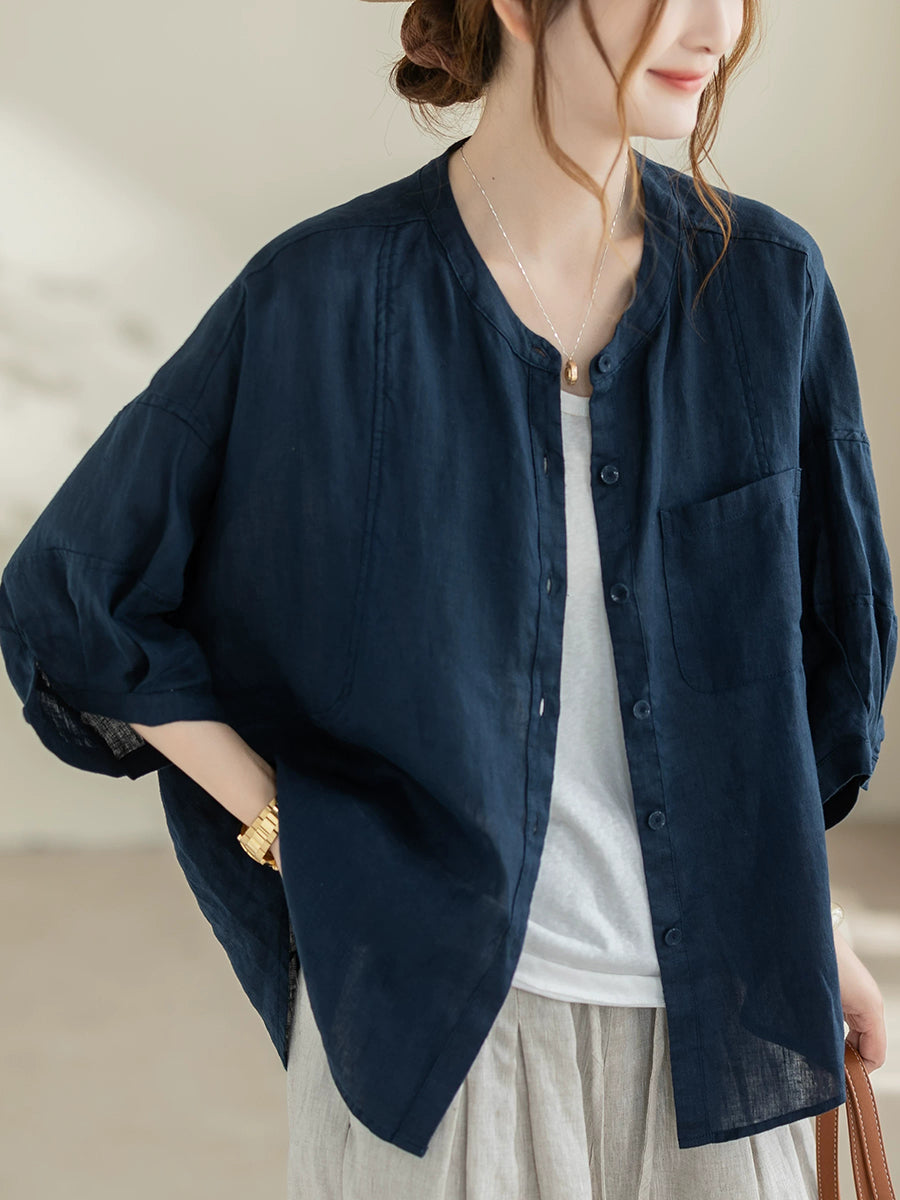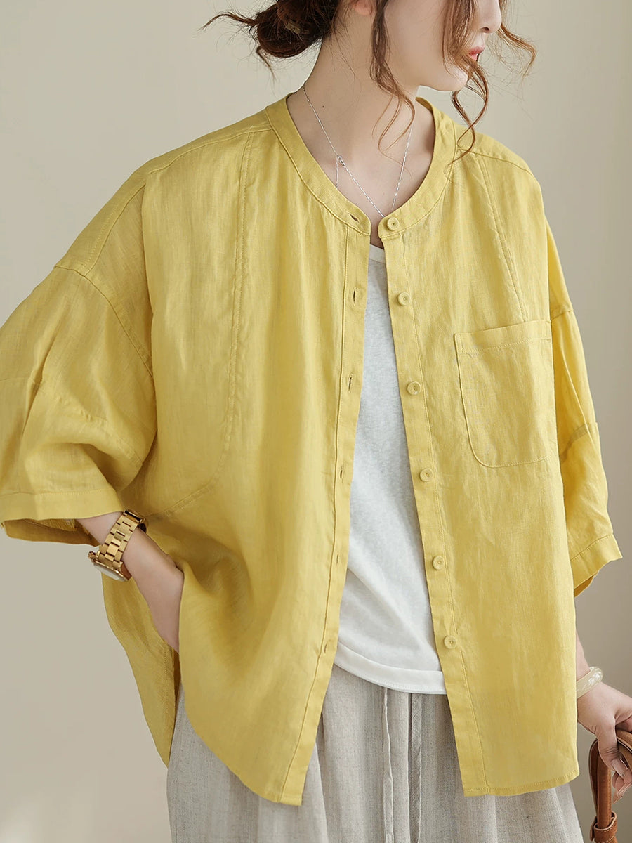 Camisa feminina de verão casual, cor lisa, gola redonda, 100% linho.