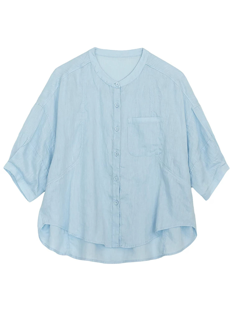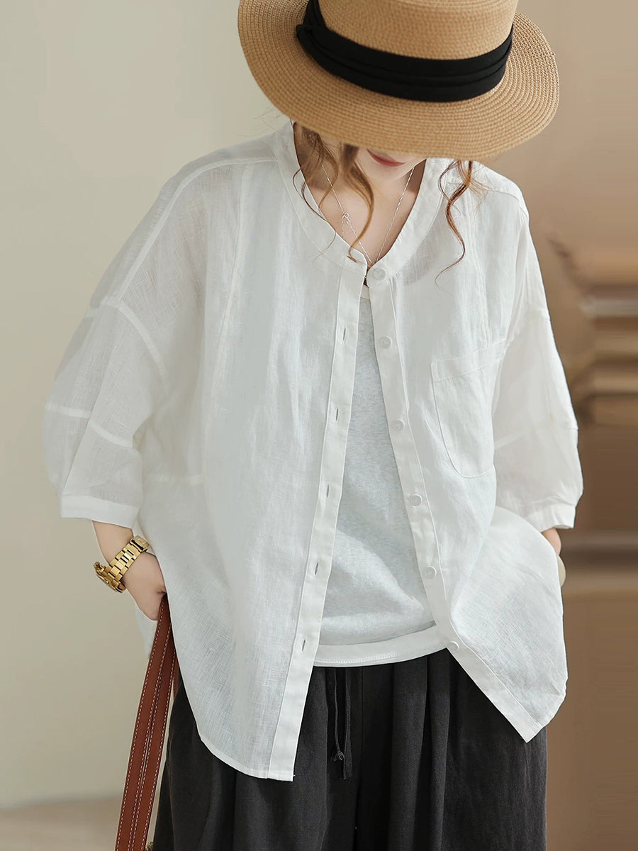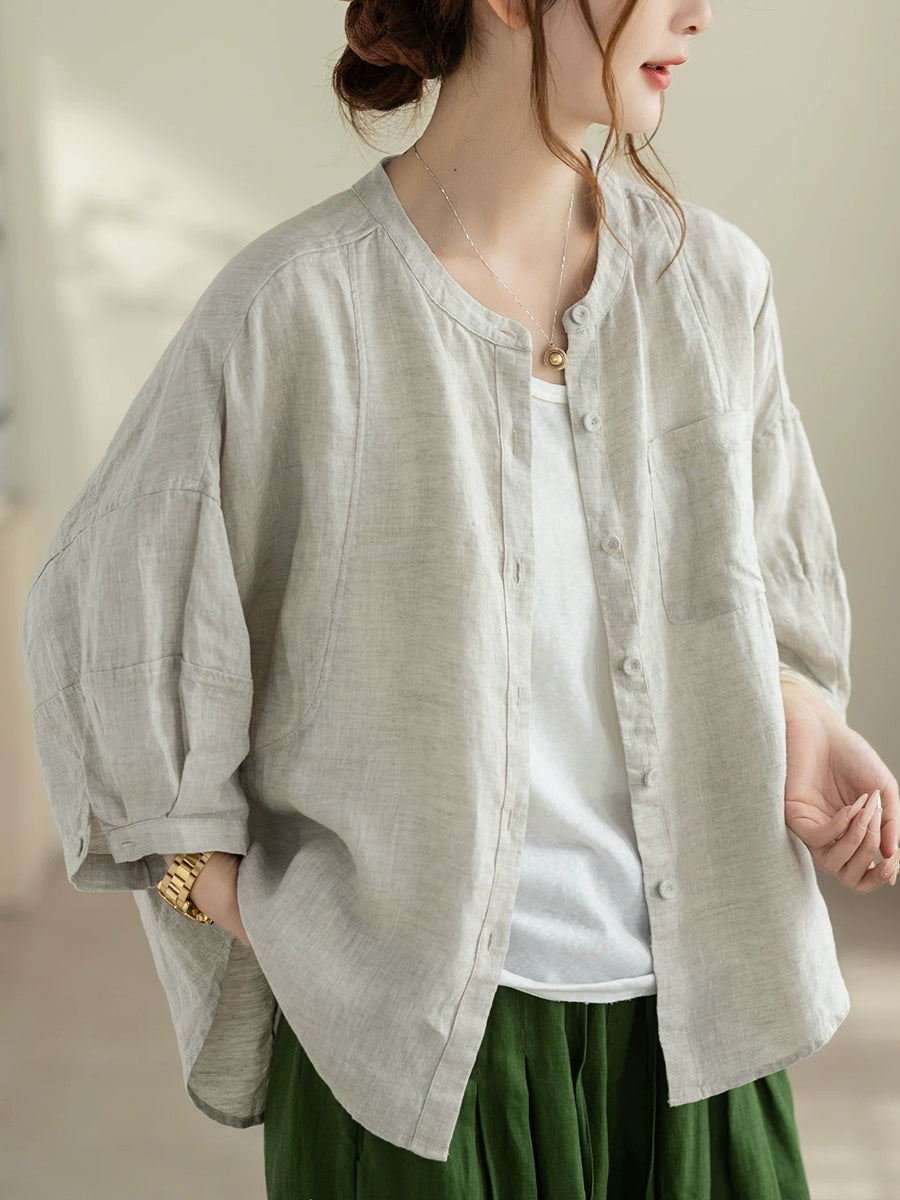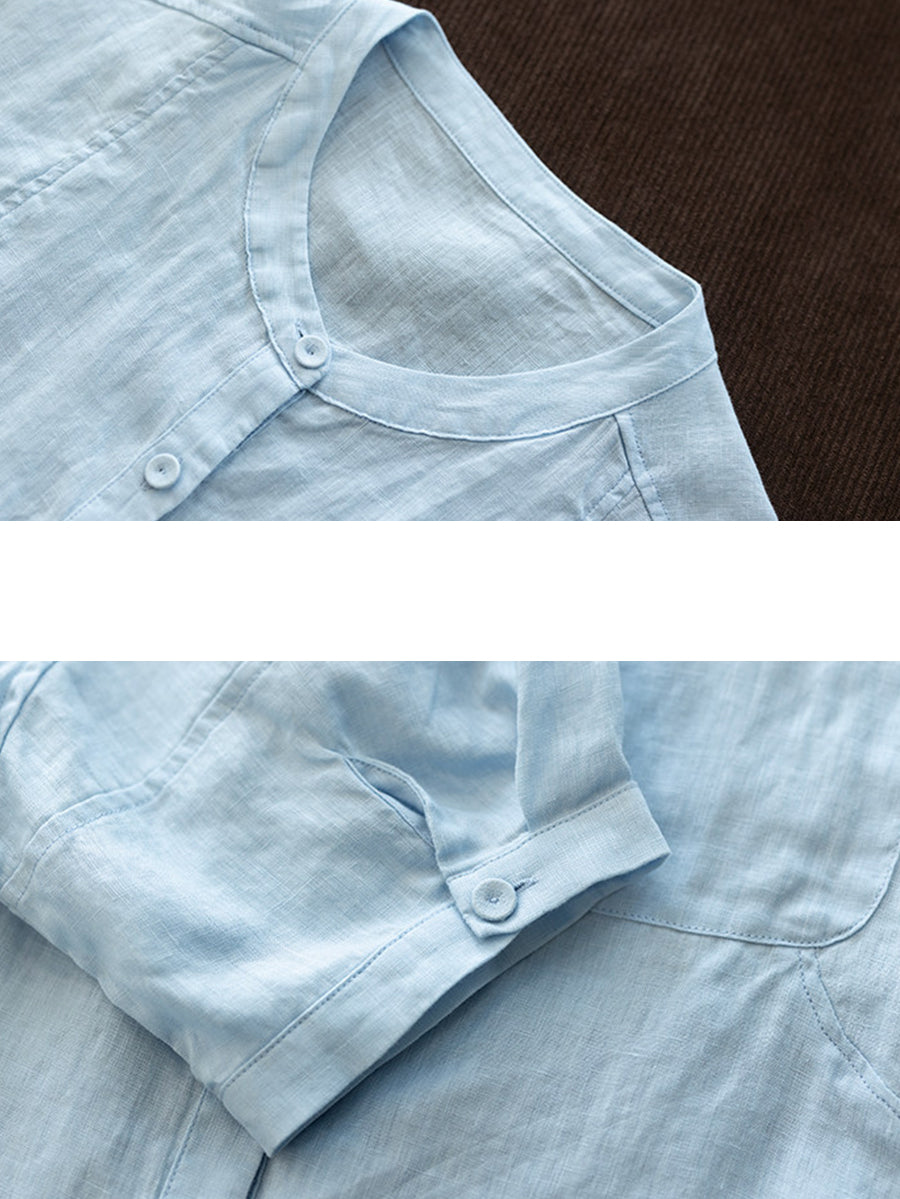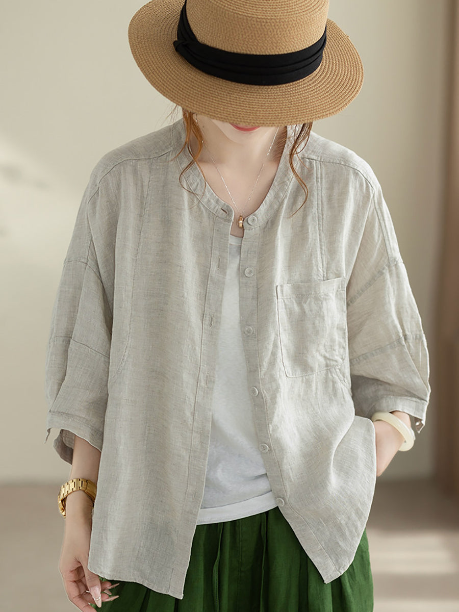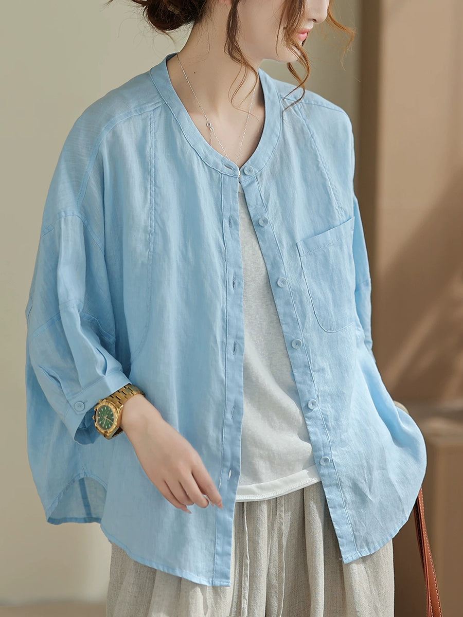 Camisa feminina de verão casual, cor lisa, gola redonda, 100% linho.