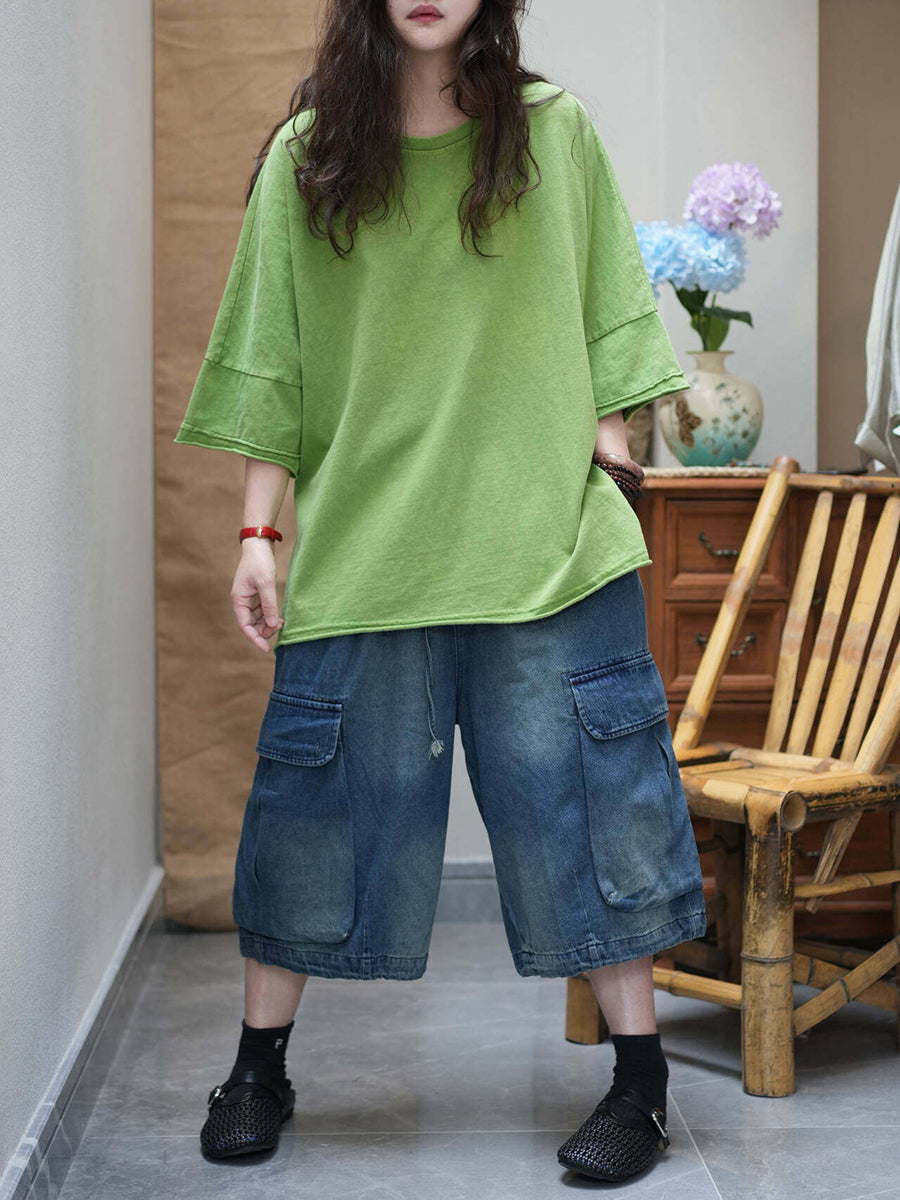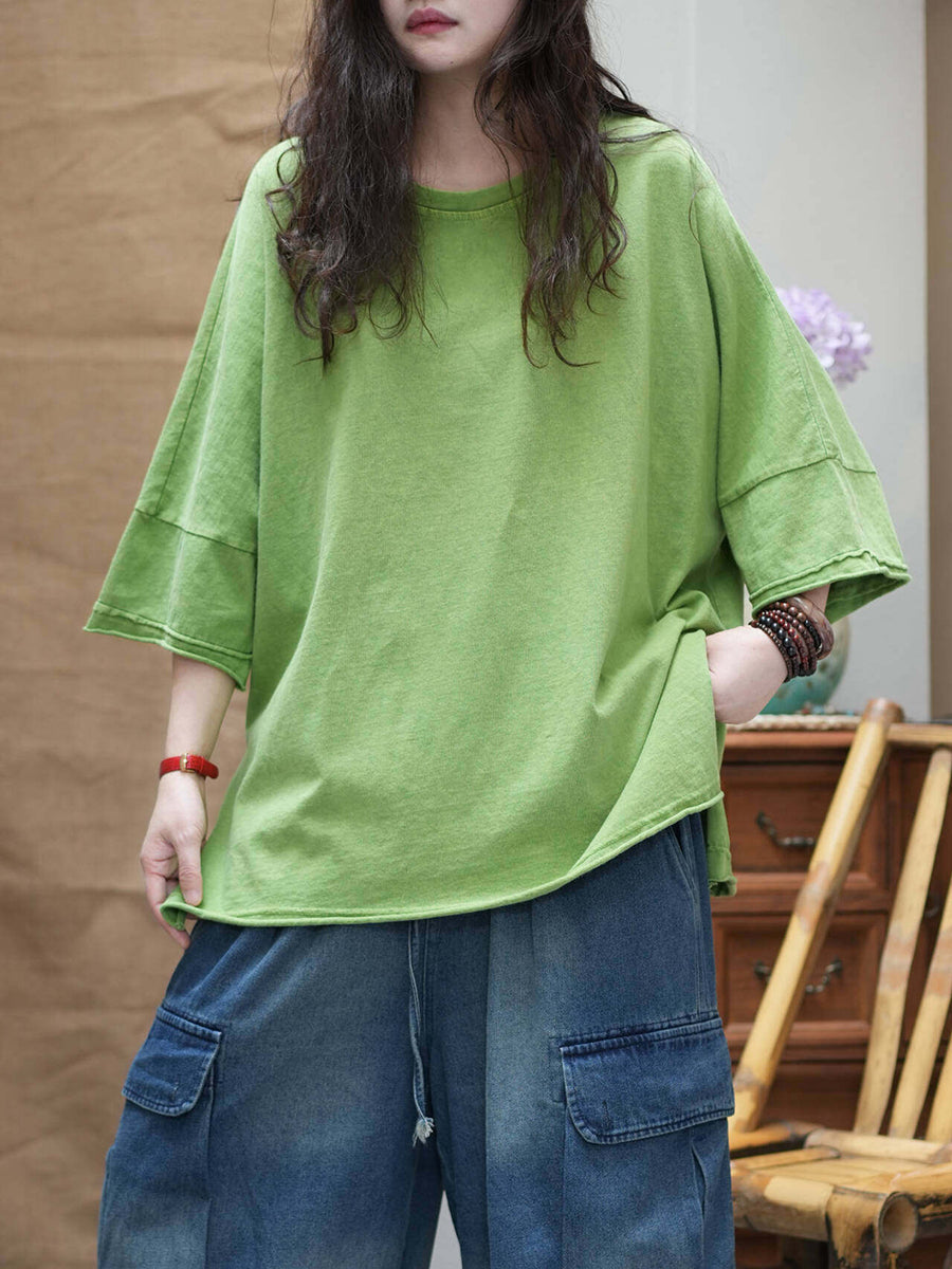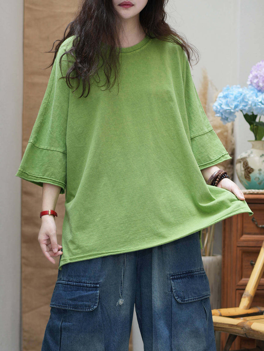 Blusa feminina casual de verão, cor lisa, gola redonda.