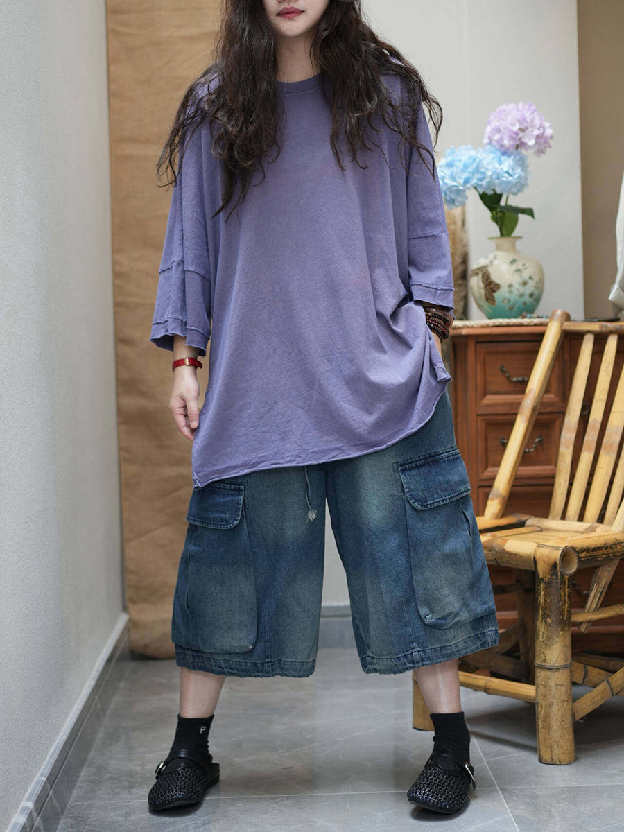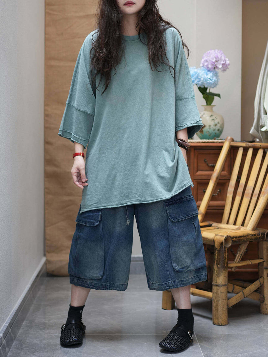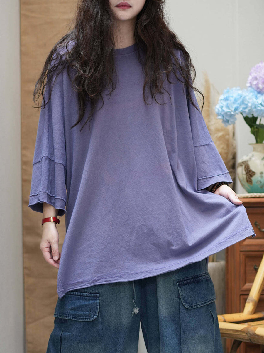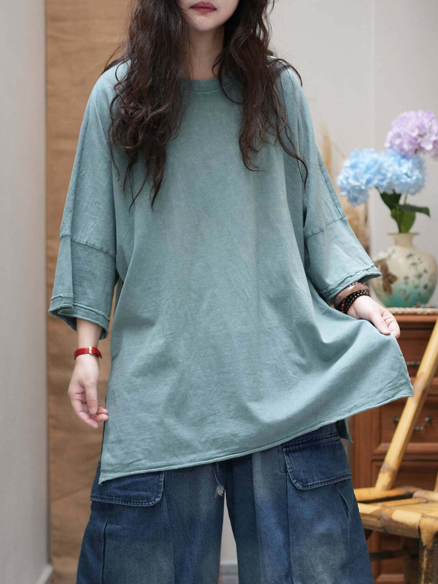 Blusa feminina casual de verão, cor lisa, gola redonda.