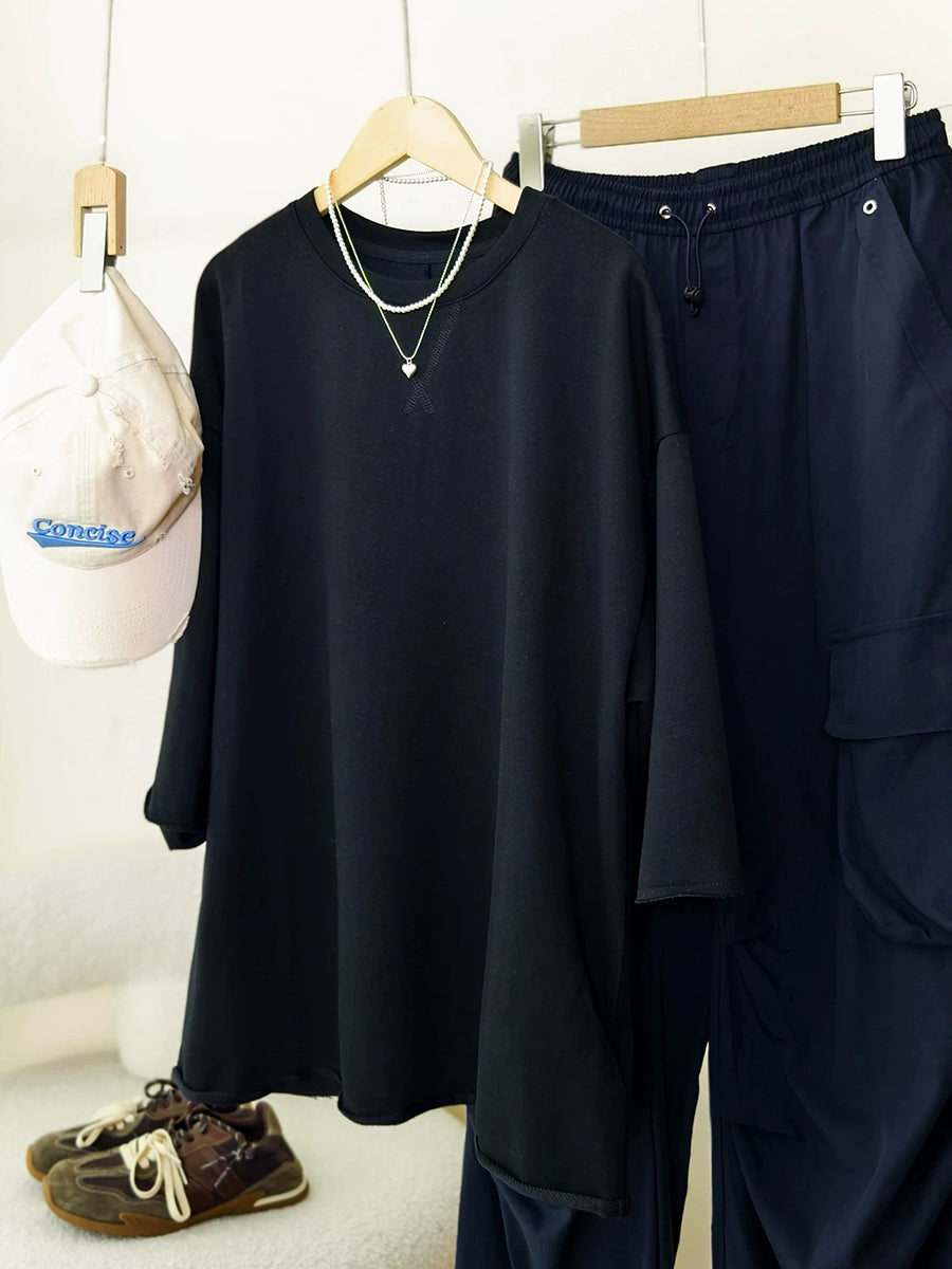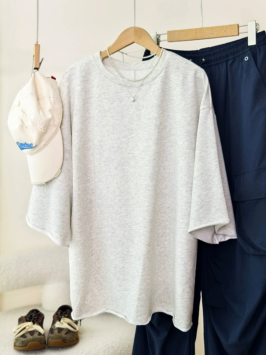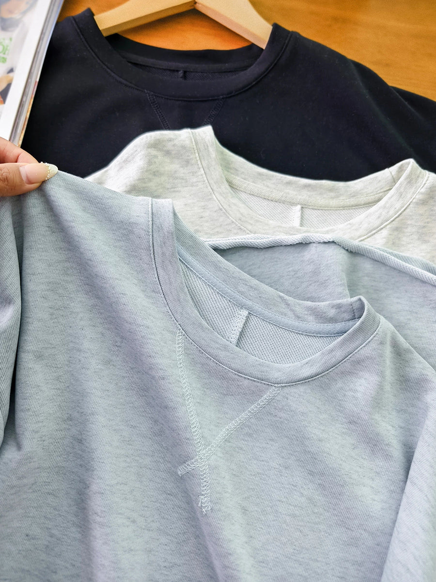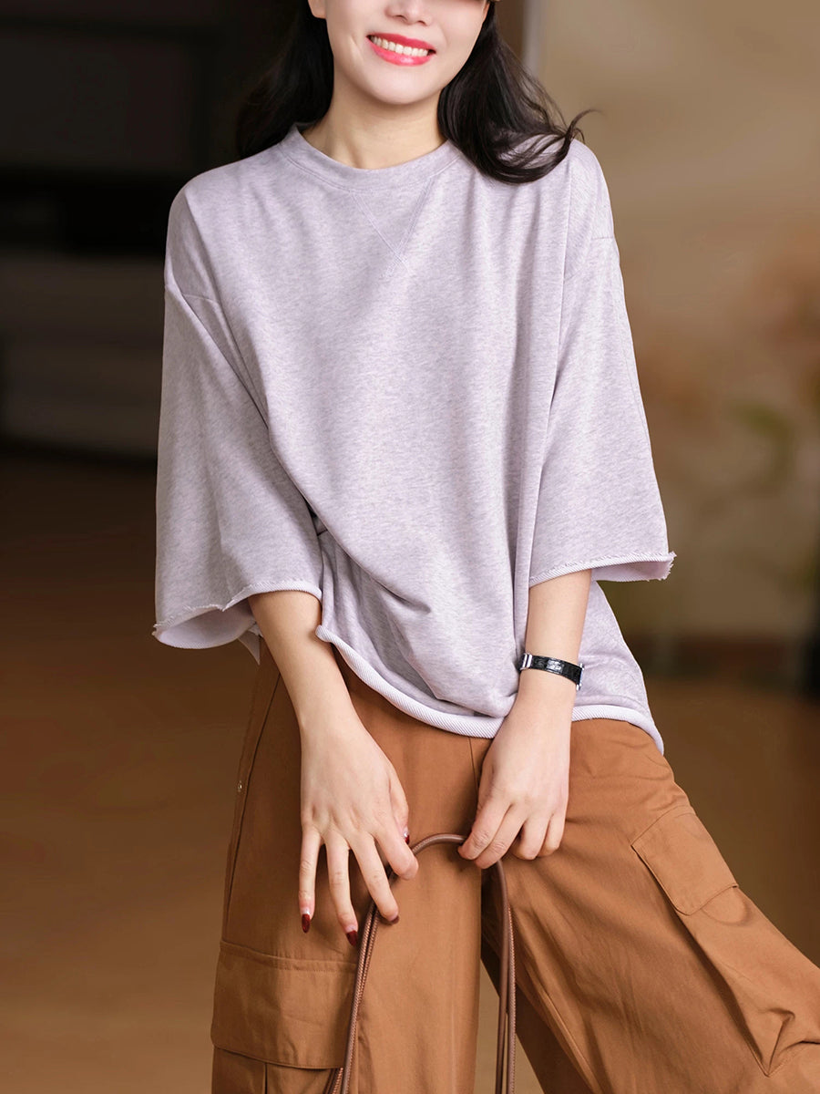 Camisa feminina casual de verão com gola redonda e cor lisa