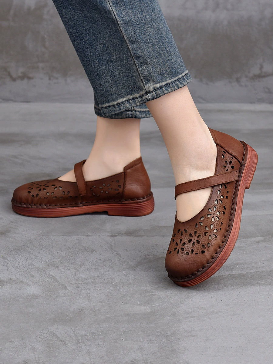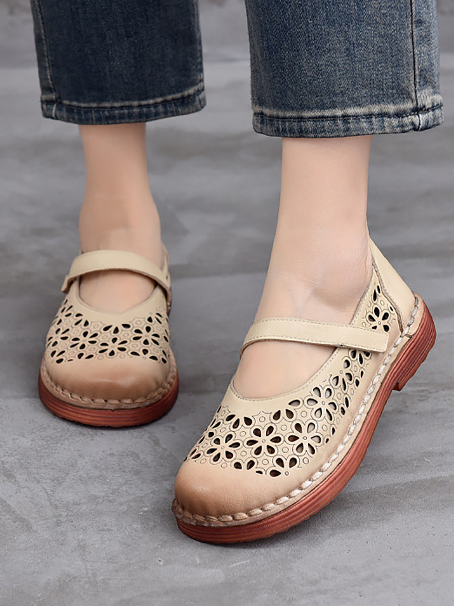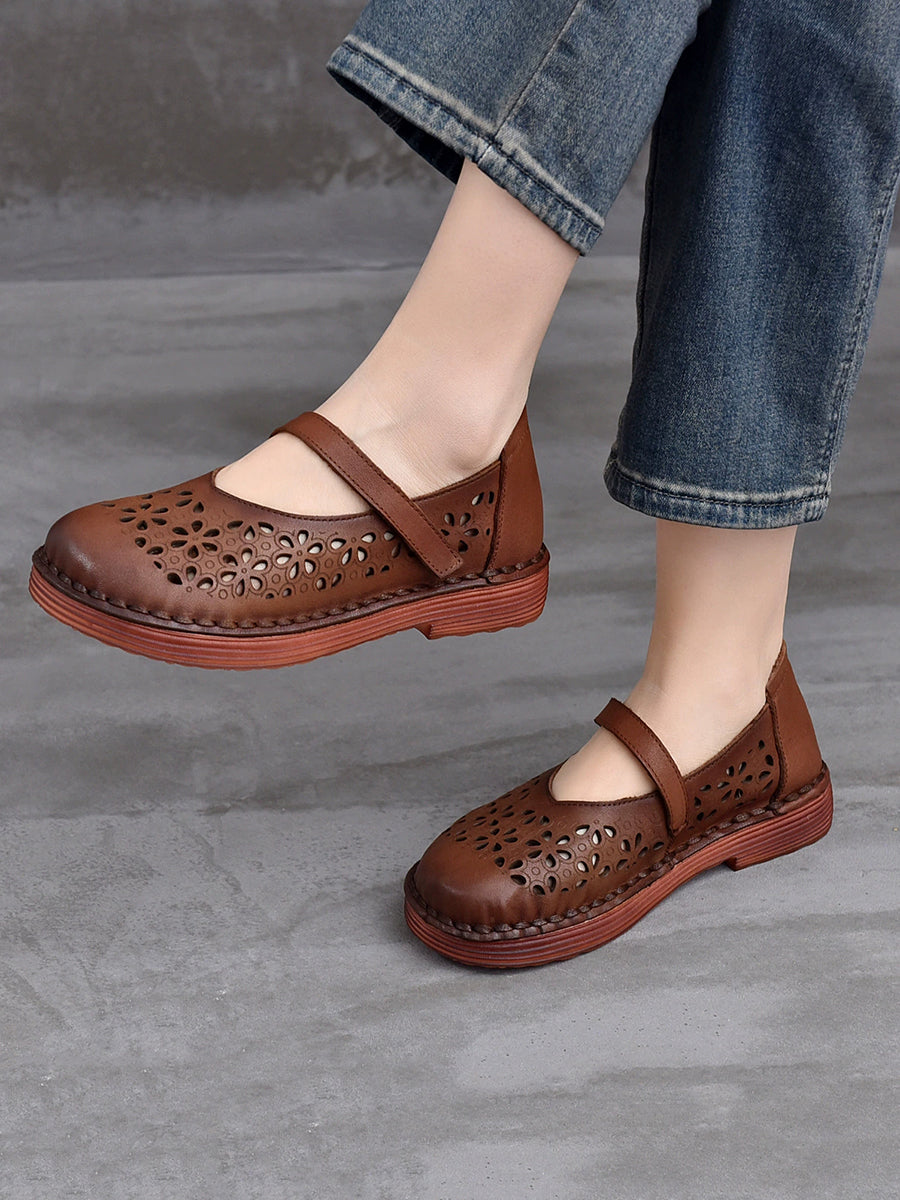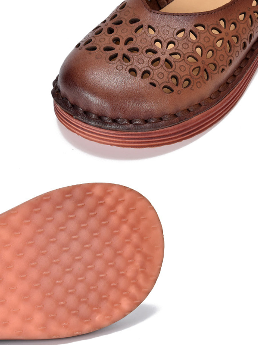 Sapatos femininos de verão em couro legítimo vazado
