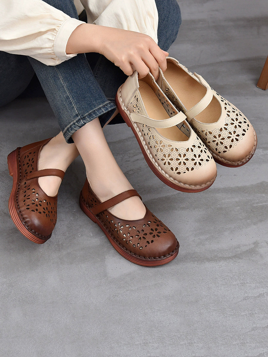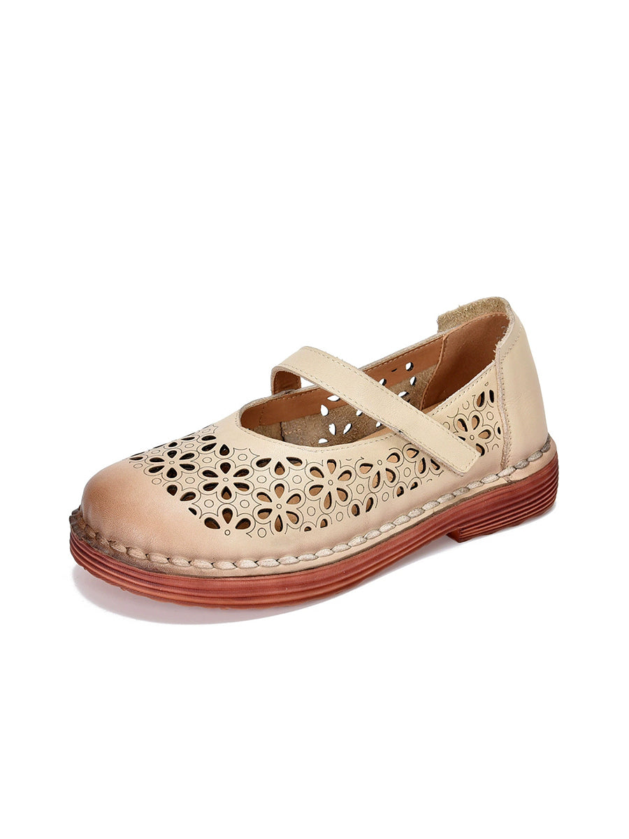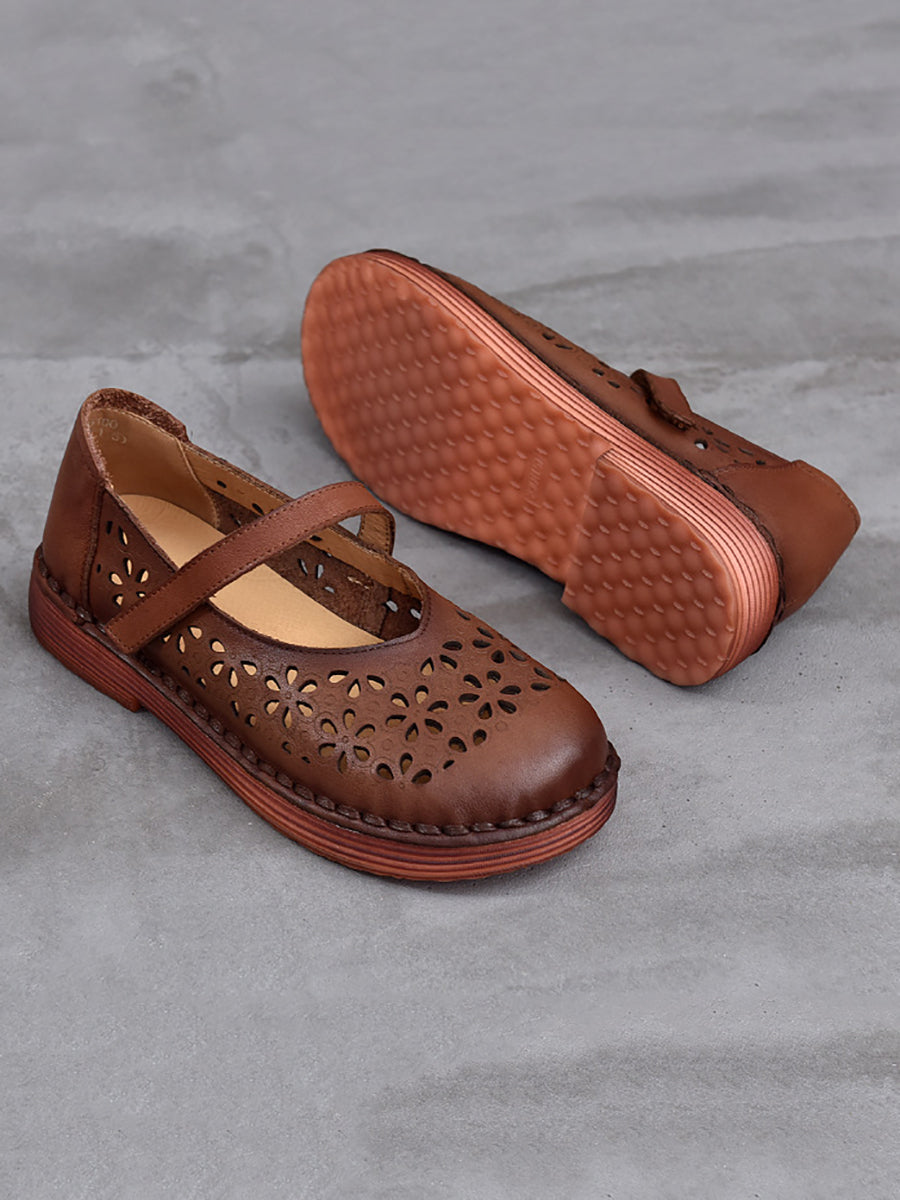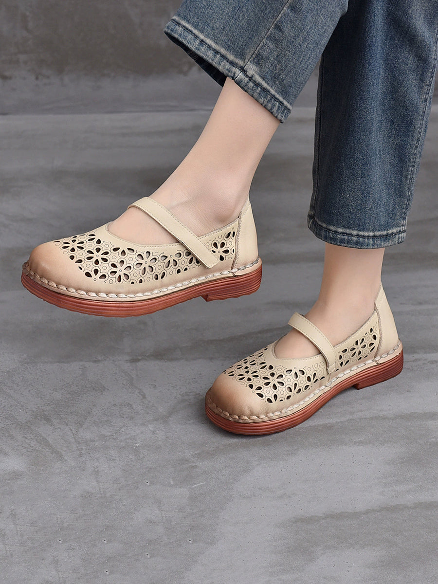 Sapatos femininos de verão em couro legítimo vazado