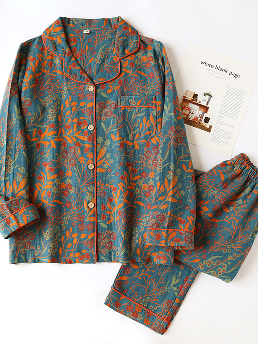 O Conjunto de pijama feminino de verão com estampa floral Confeccionado em gaze jacquard macia para maior conforto, este conjunto elegante apresenta decote em V, estampa floral, mangas compridas e cintura elástica, com calças compridas perfeitas para relaxar em casa.
