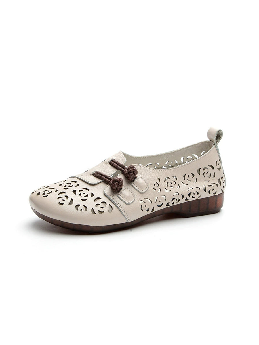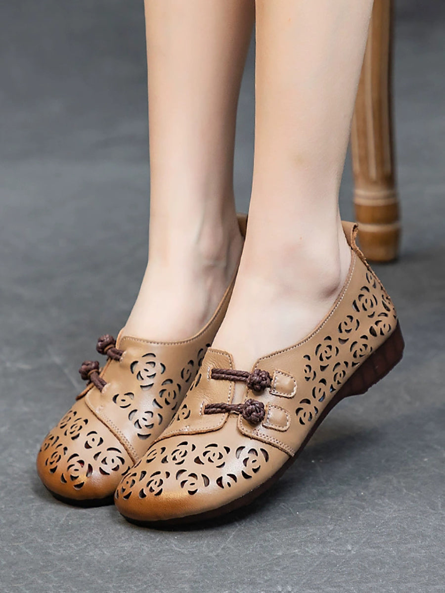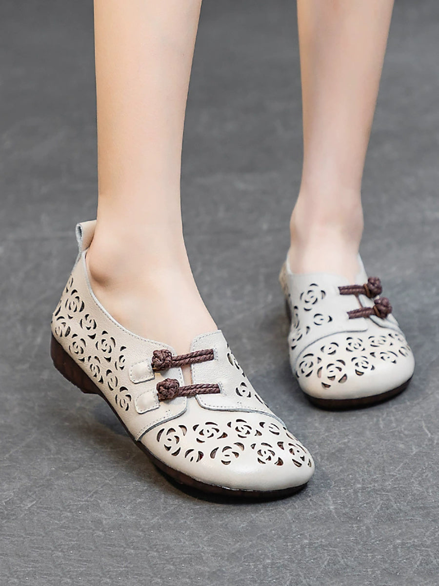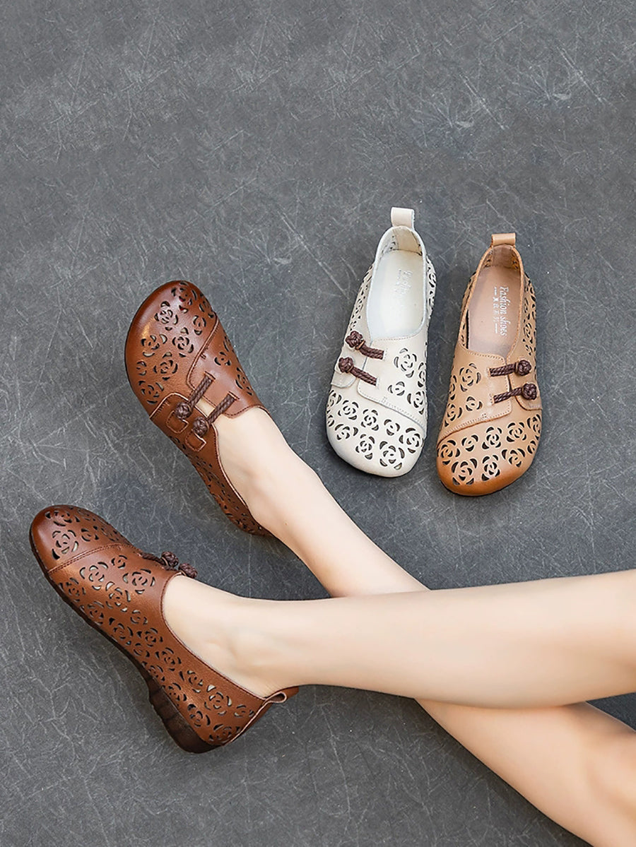 Sapatos femininos de verão em couro vazado com estampa floral