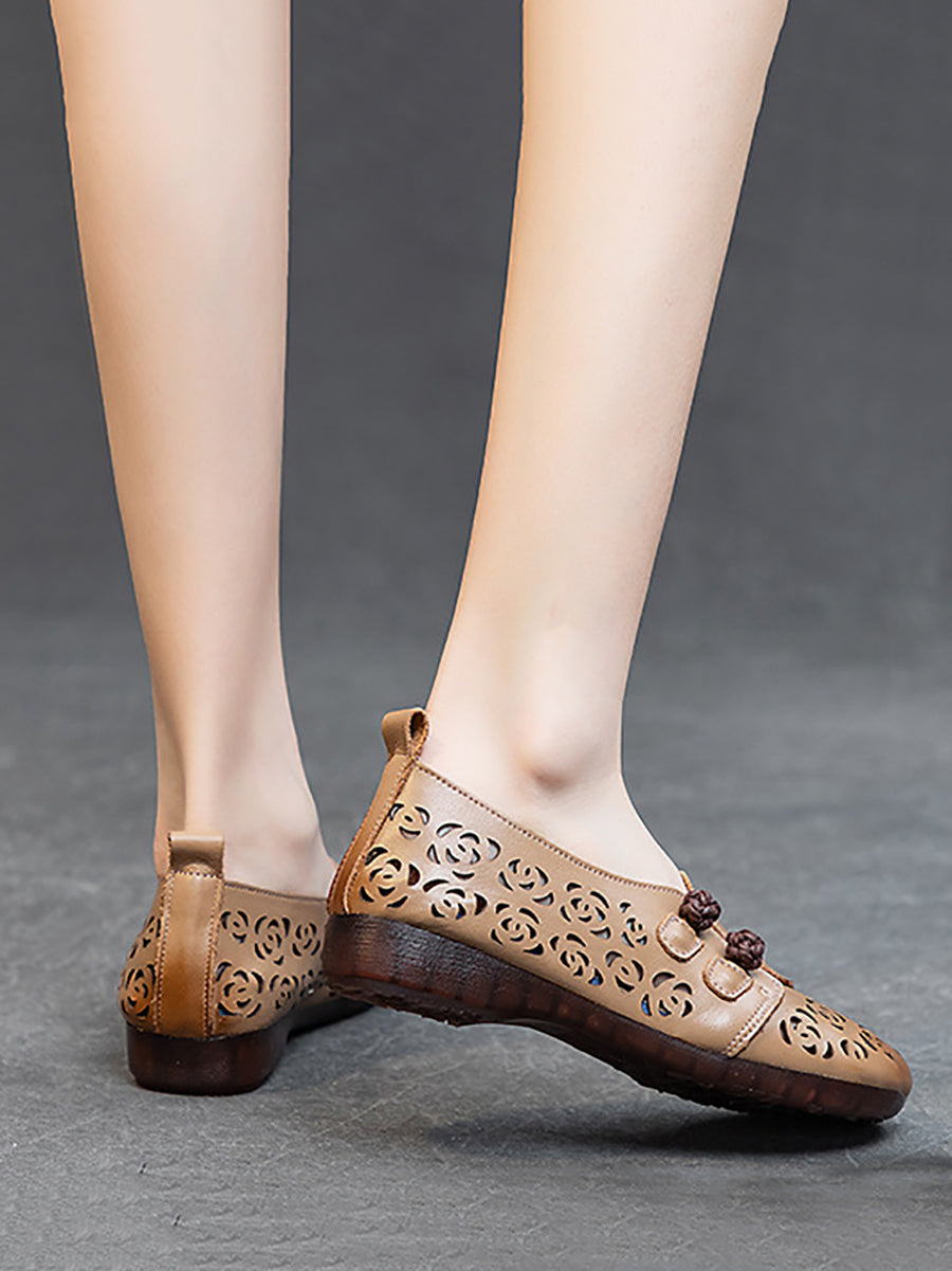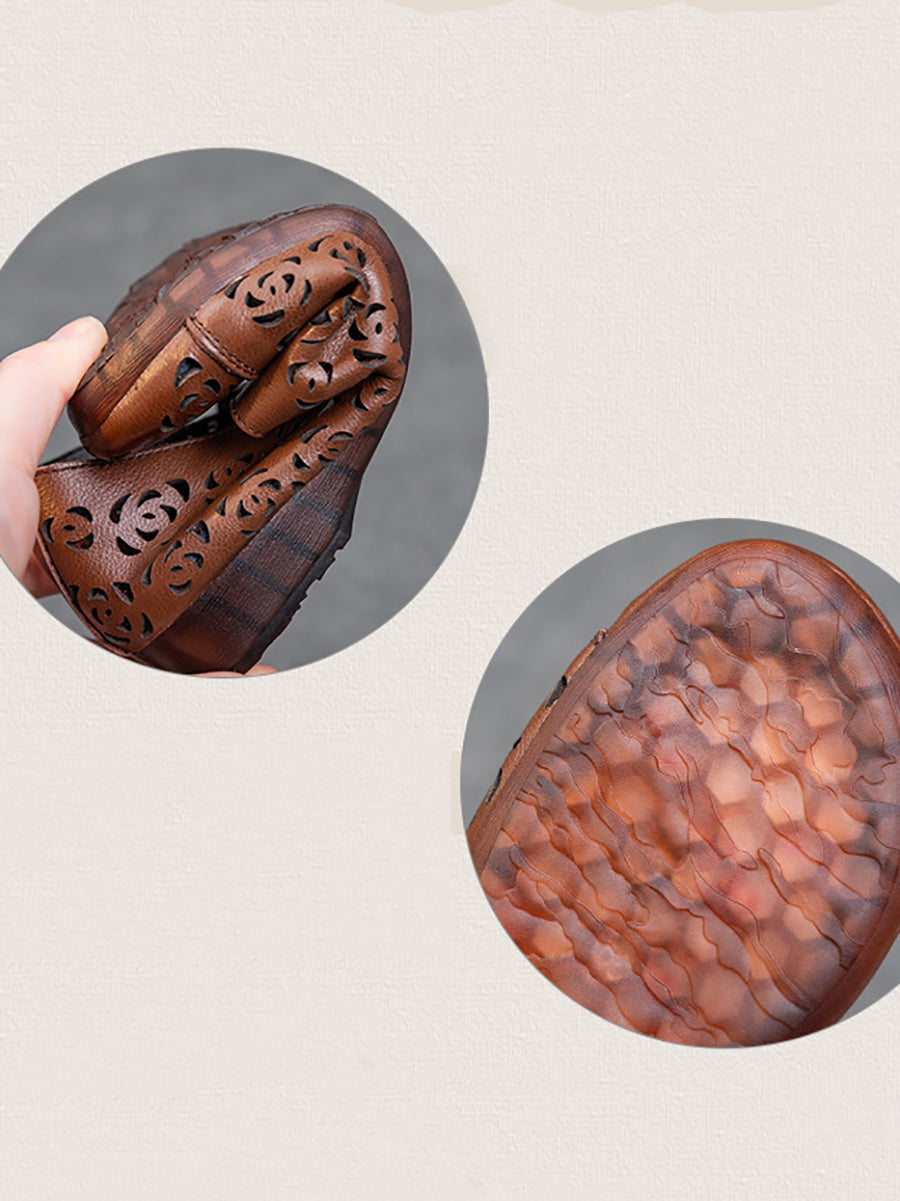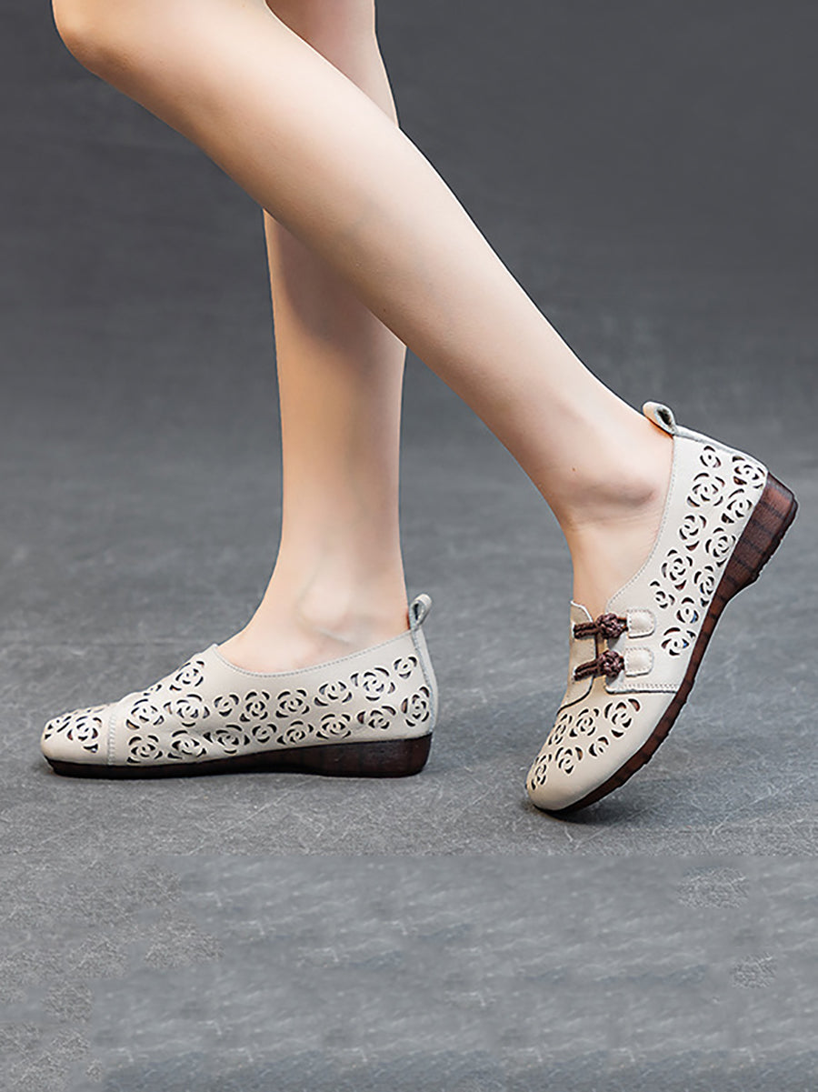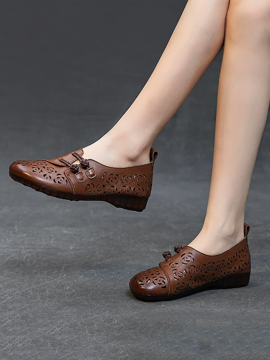 Sapatos femininos de verão em couro vazado com estampa floral