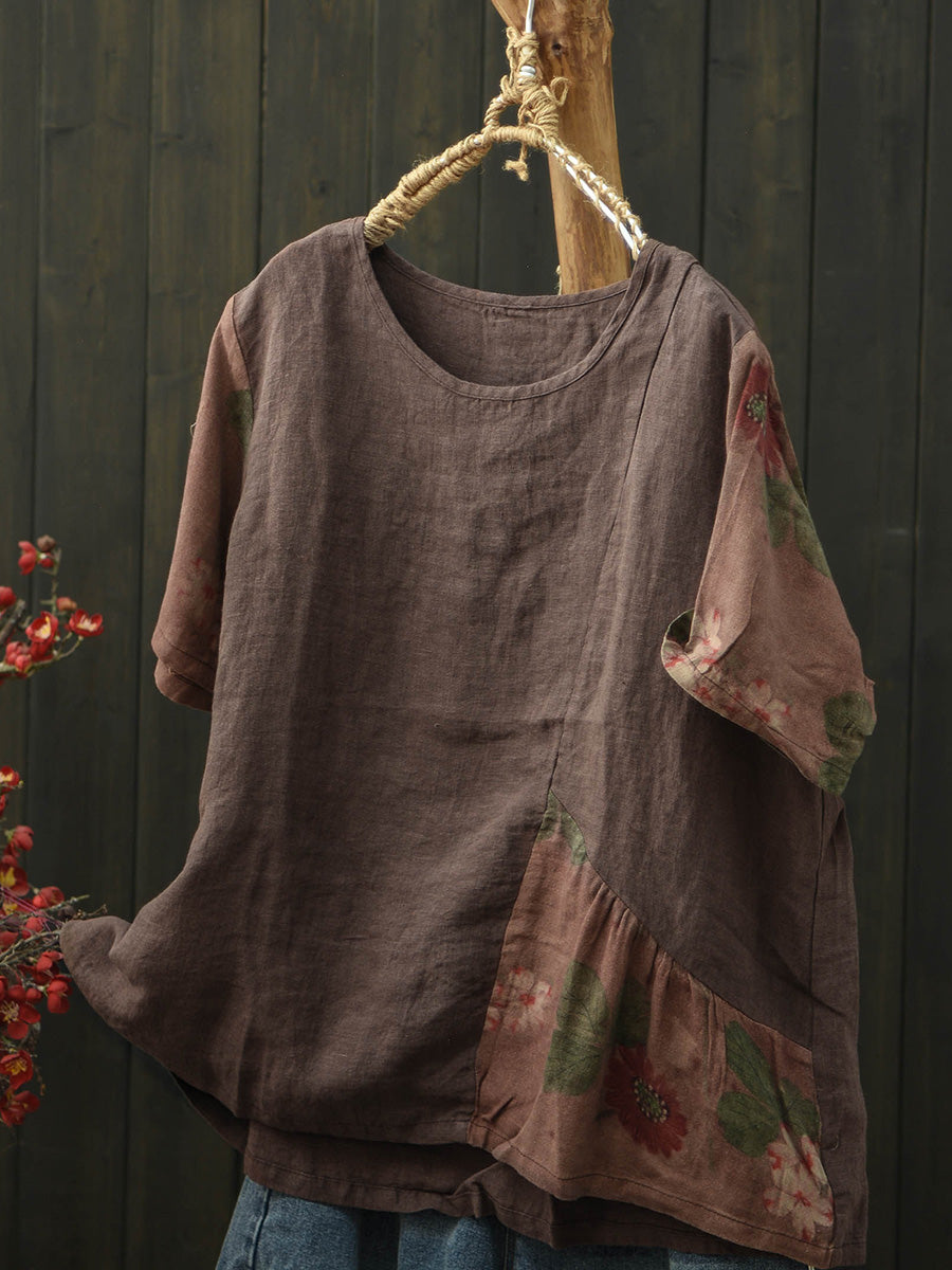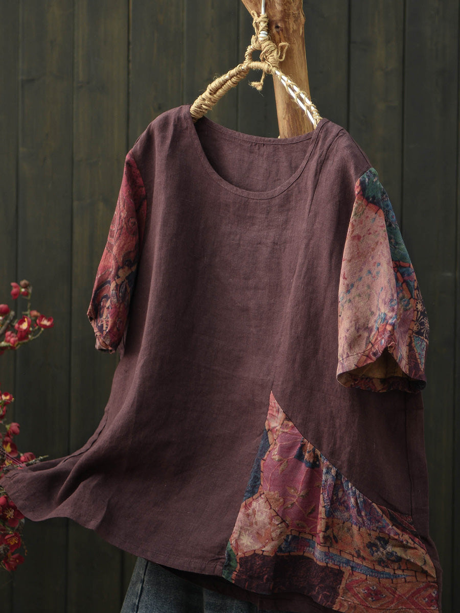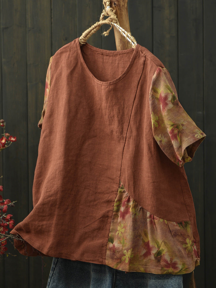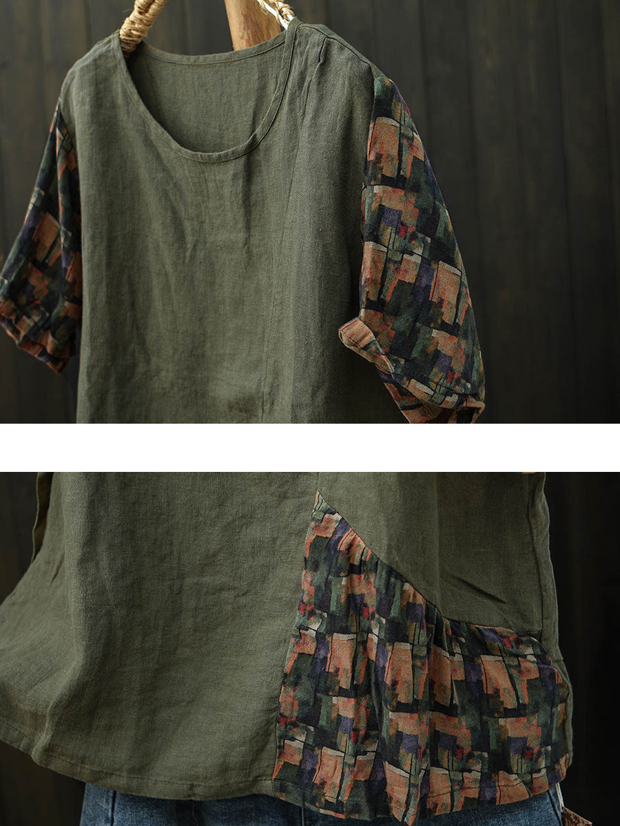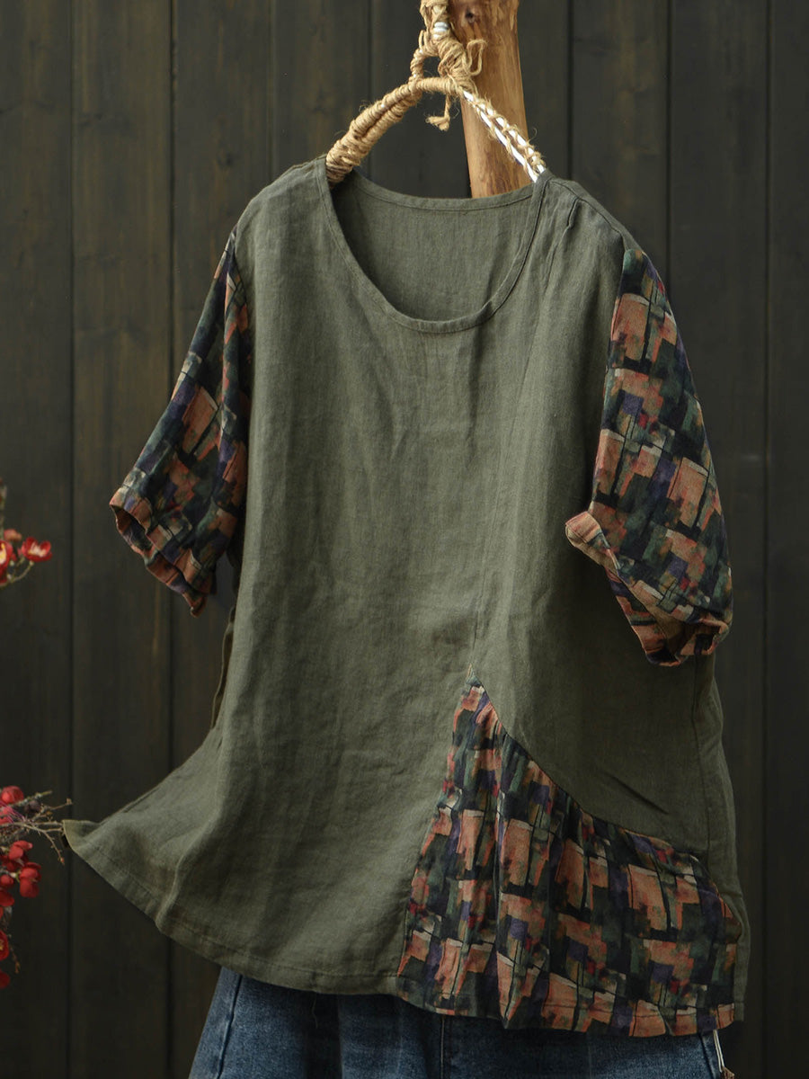 Camiseta feminina de verão de linho com patchwork e mangas curtas