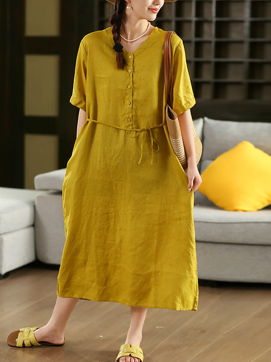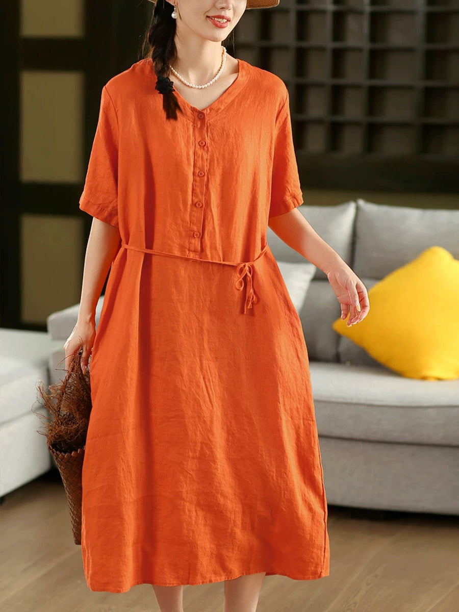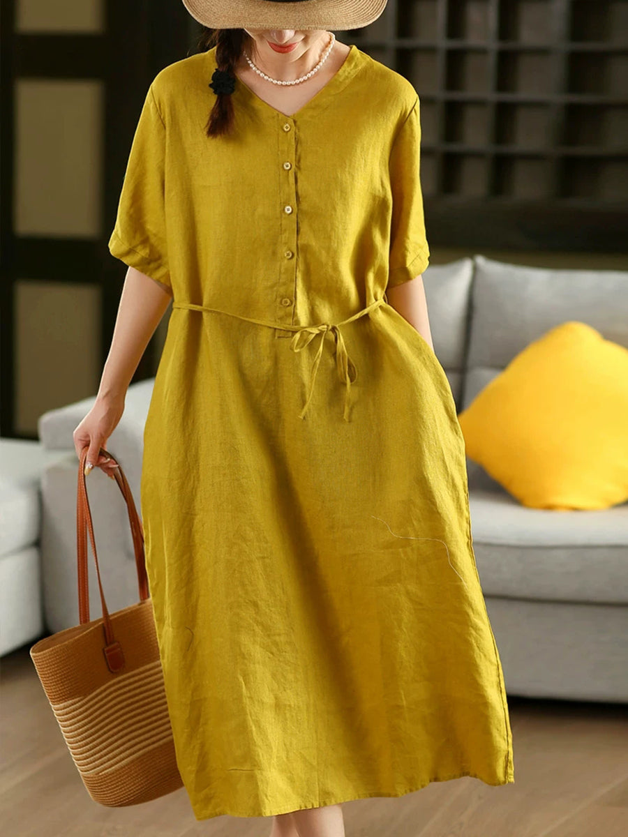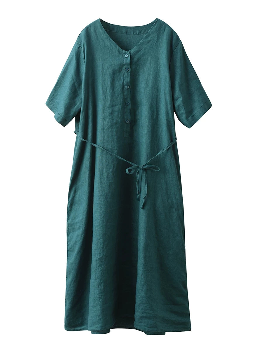 Vestido feminino de verão liso, cor lisa, decote em V, 100% linho.