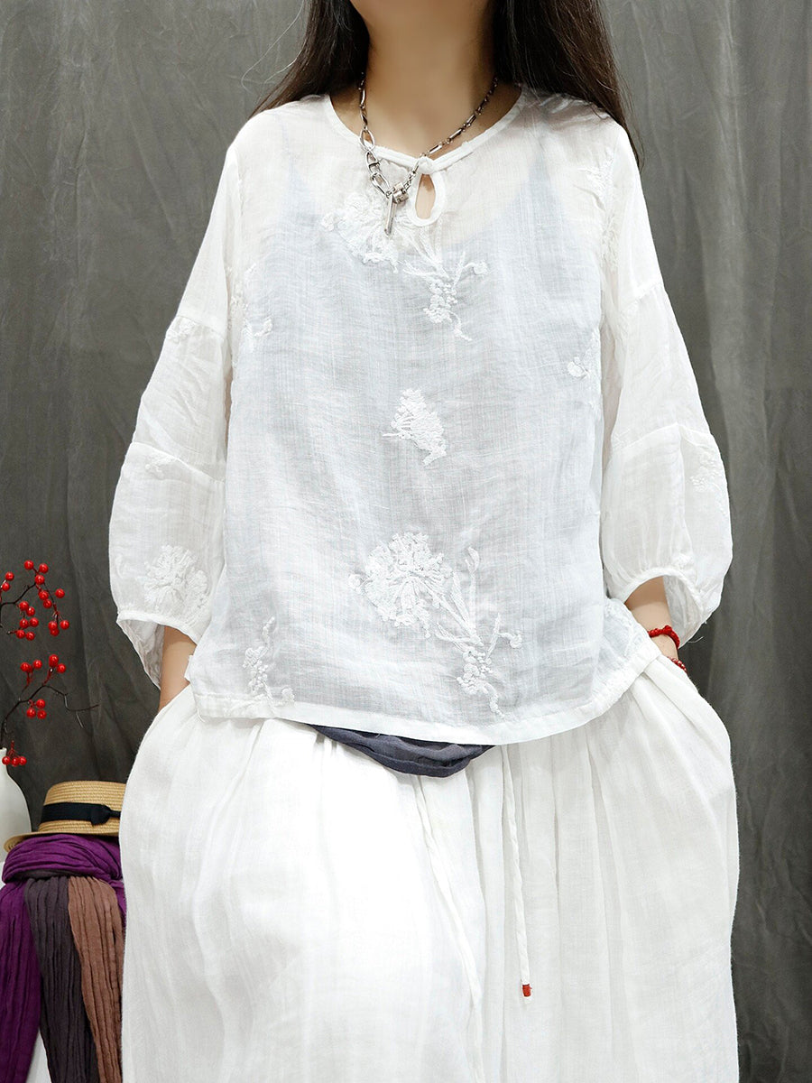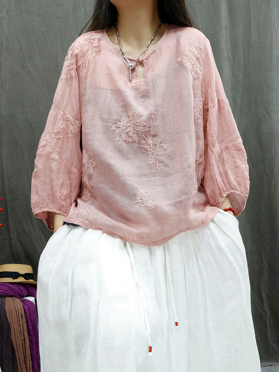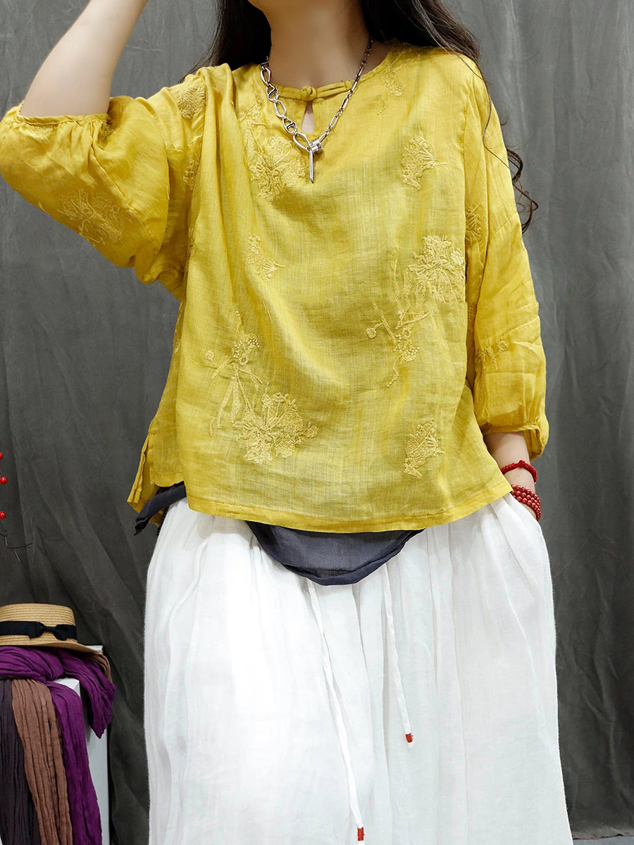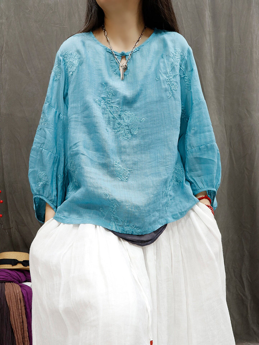 Blusa feminina de verão retrô bordada em rami