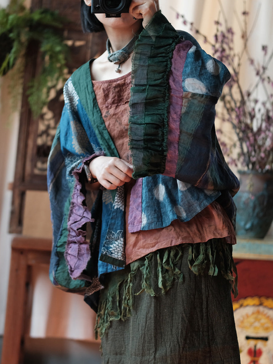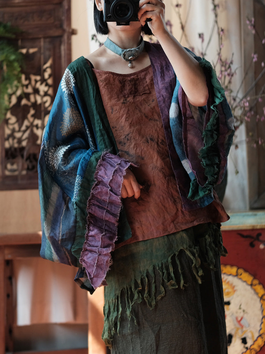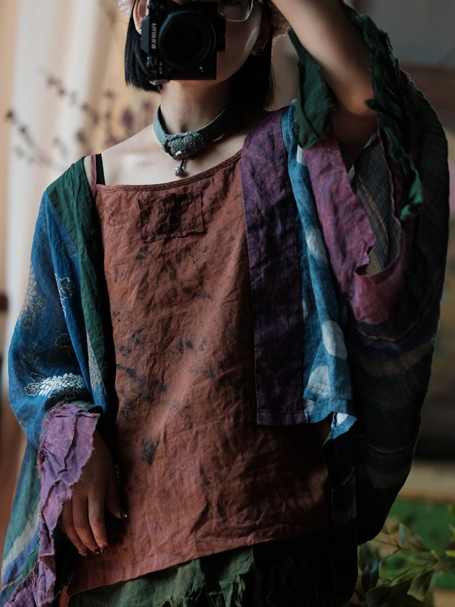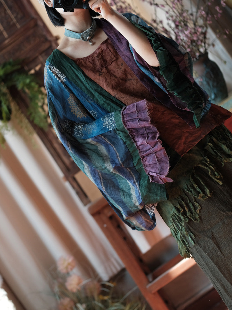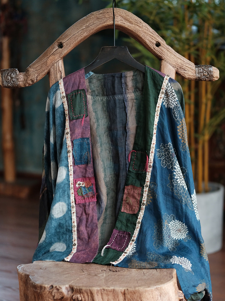 Camisa feminina de verão retrô com patchwork floral em rami