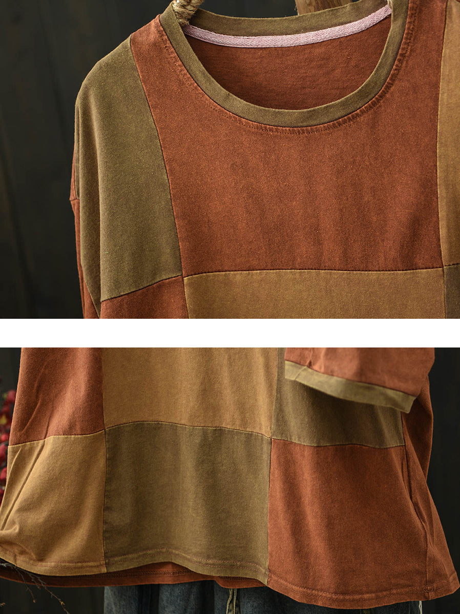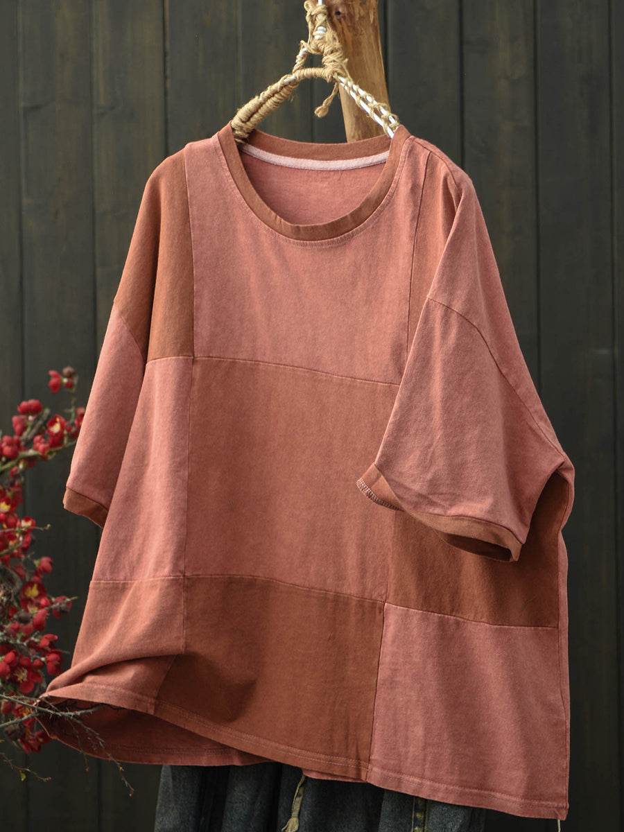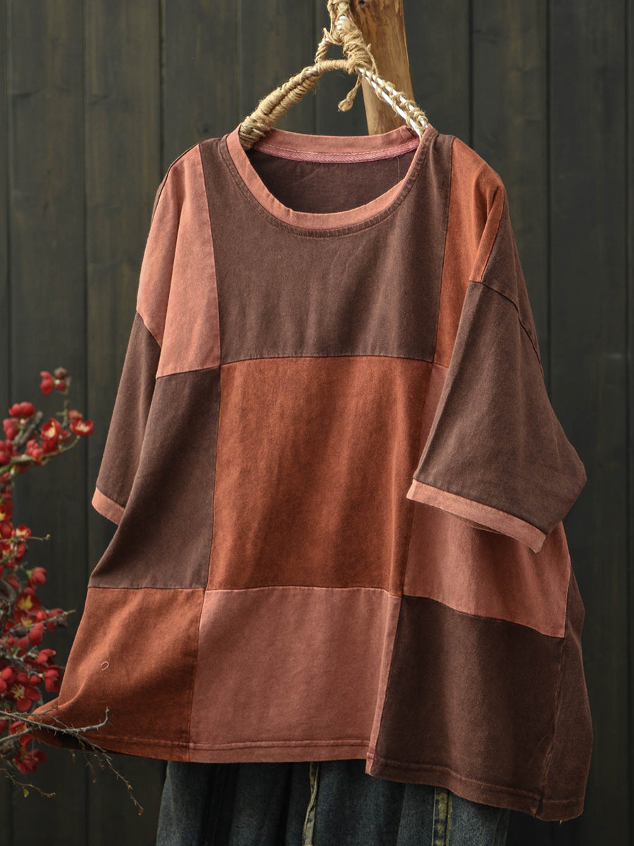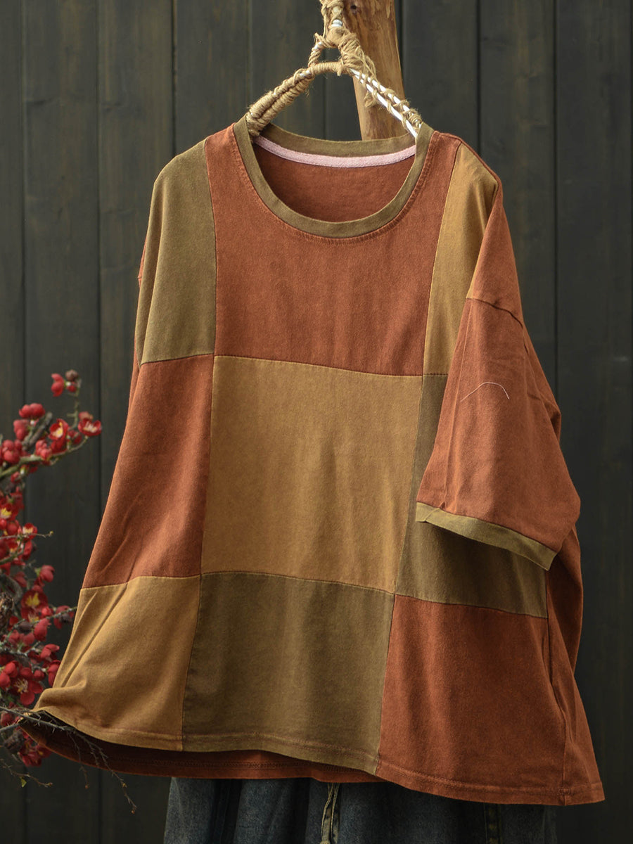 Camiseta feminina de verão retrô com patchwork e gola redonda