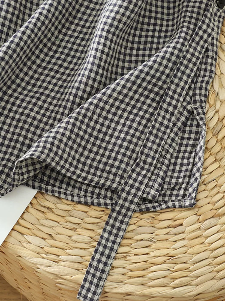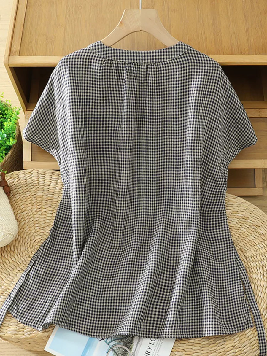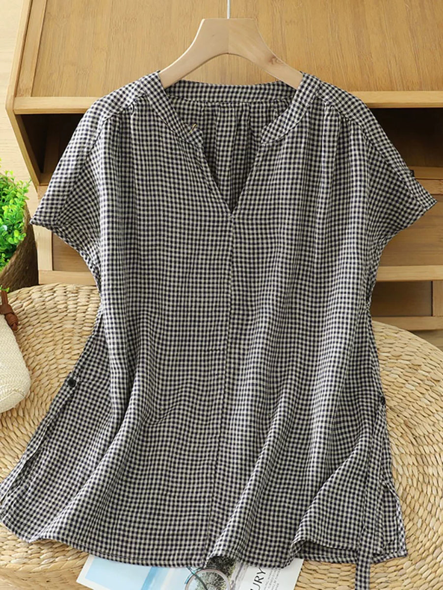Blusa feminina de verão retrô xadrez com decote em V