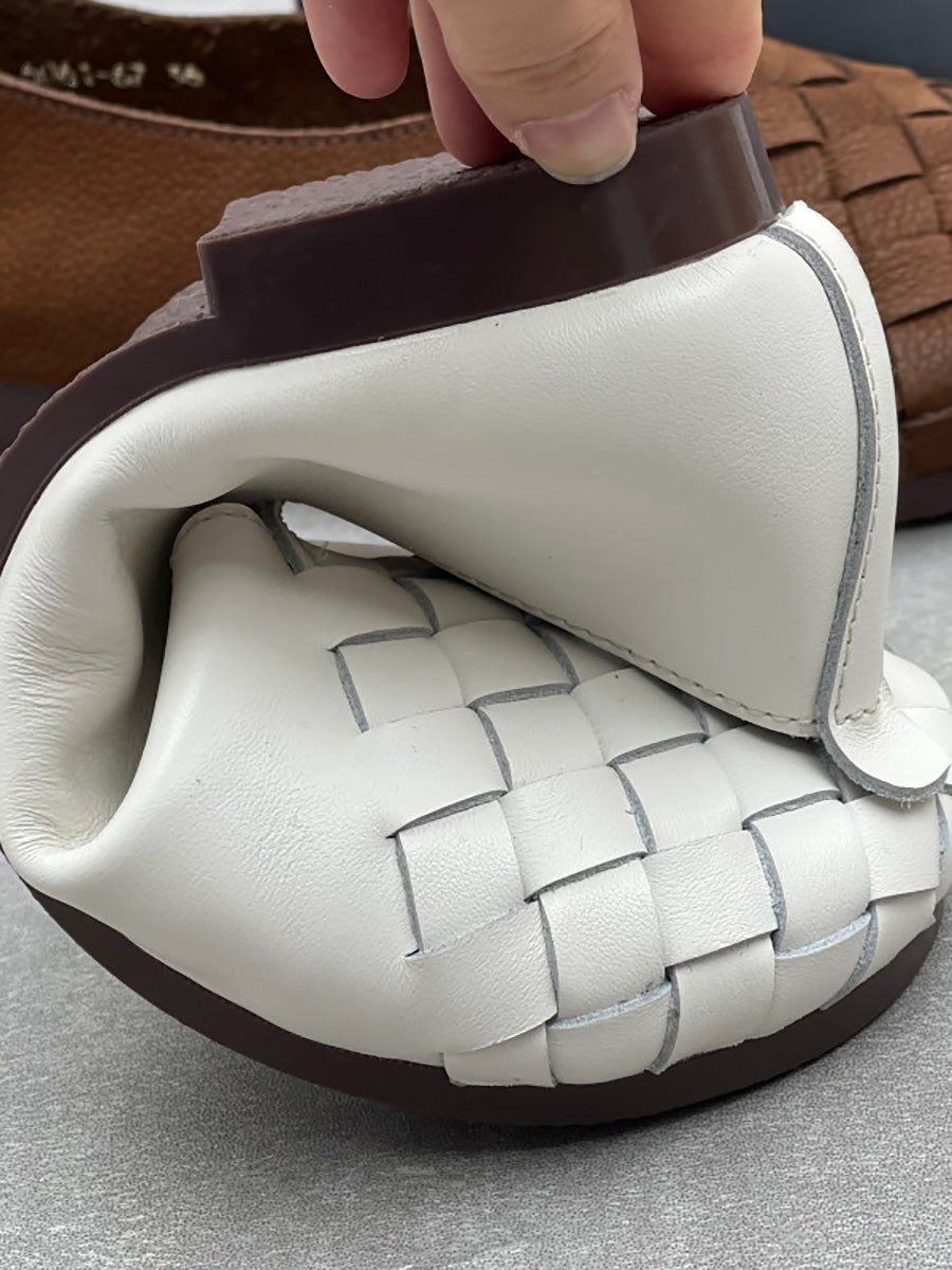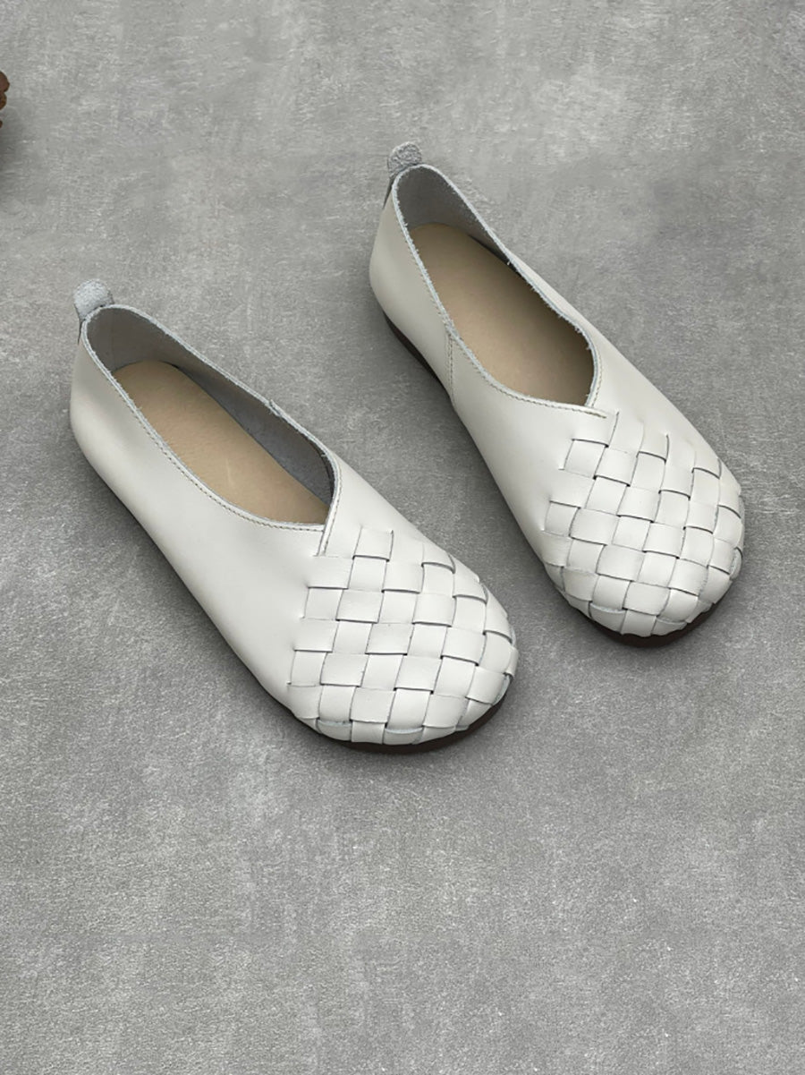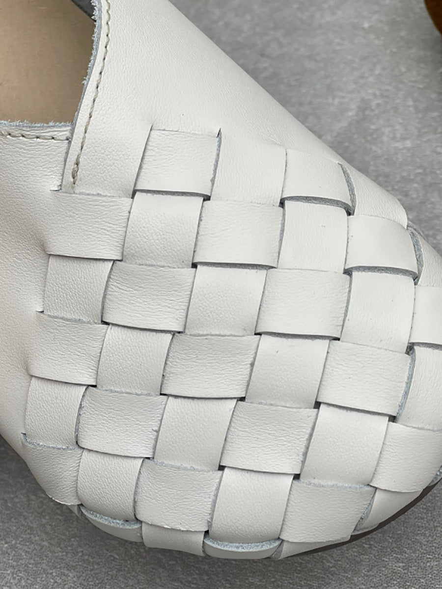 Sapatos femininos de verão em couro macio trançado, estilo rasteiro.