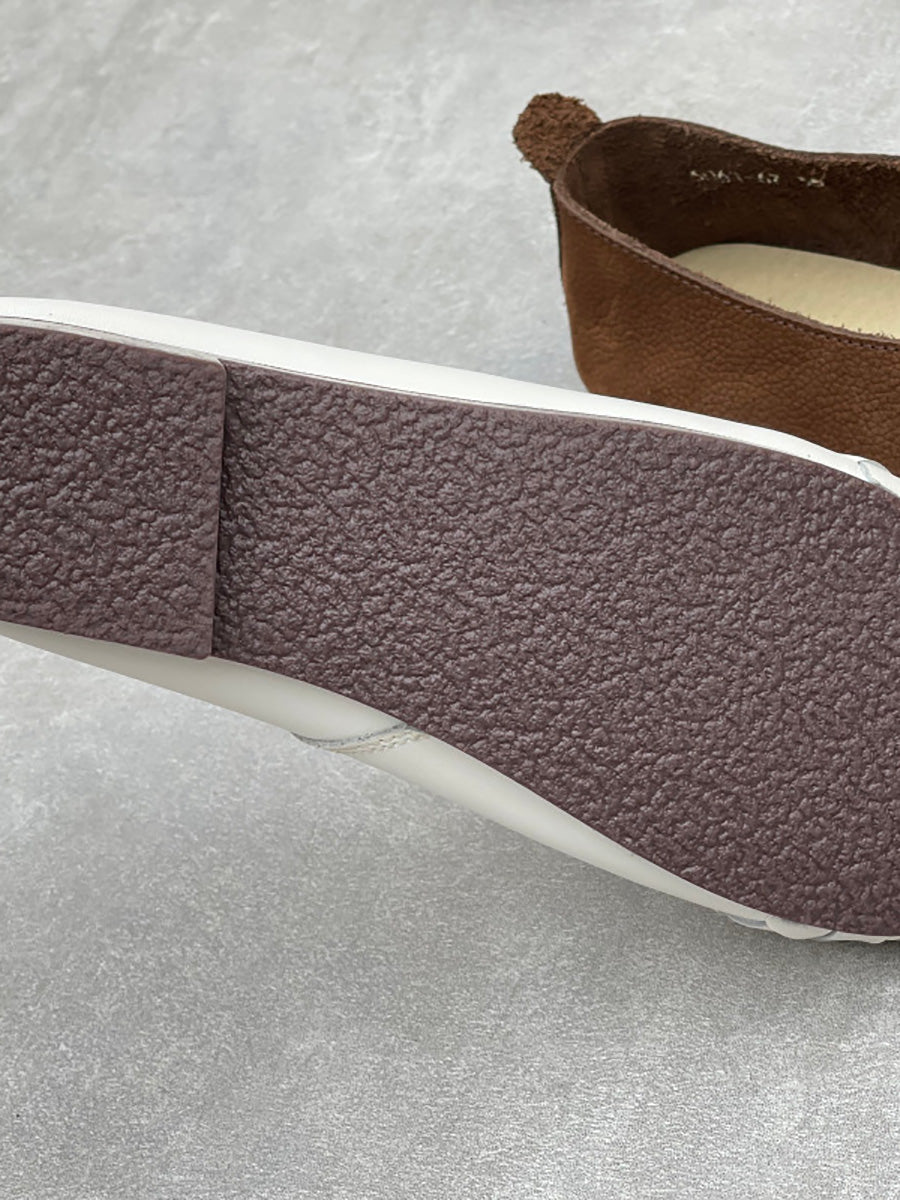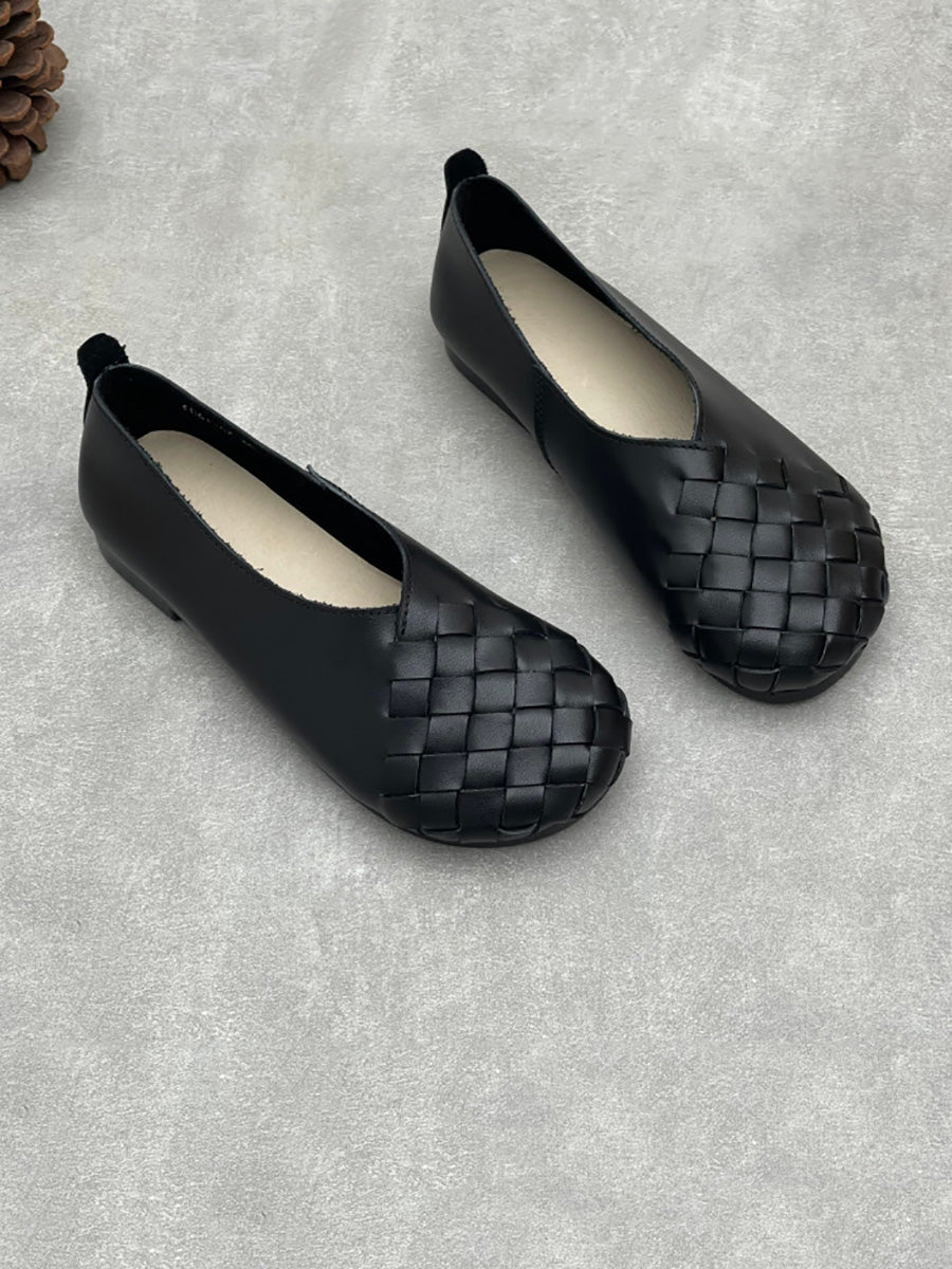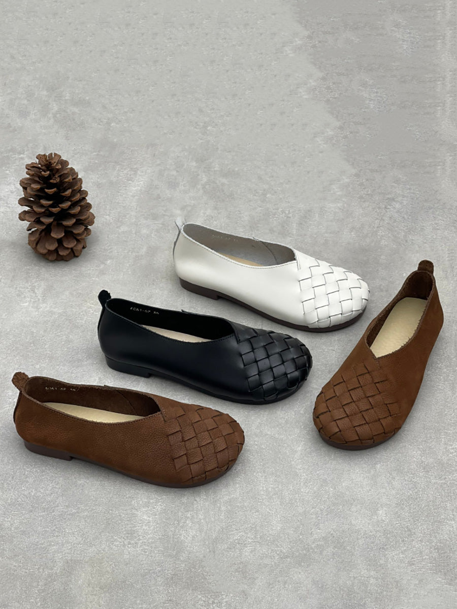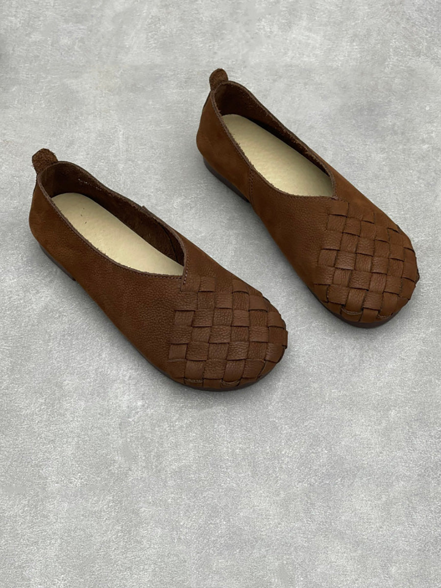 Sapatos femininos de verão em couro macio trançado, estilo rasteiro.