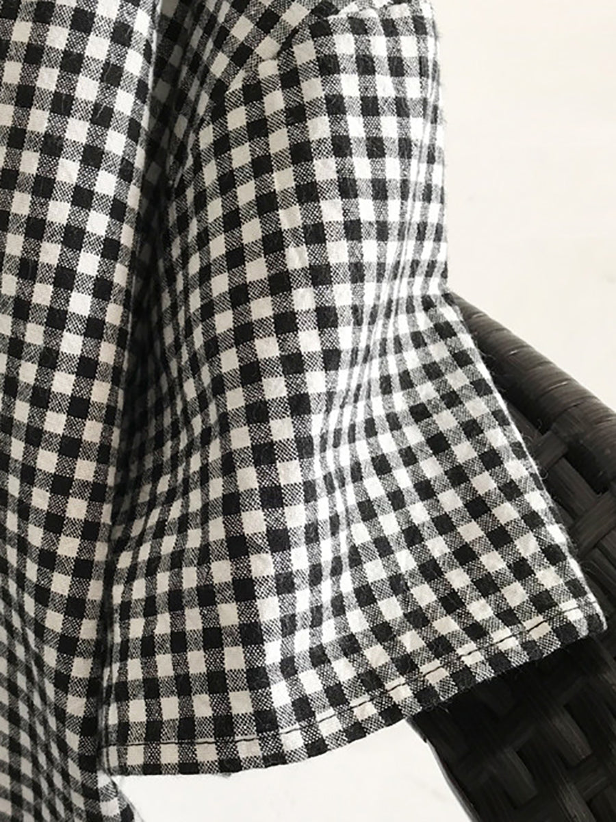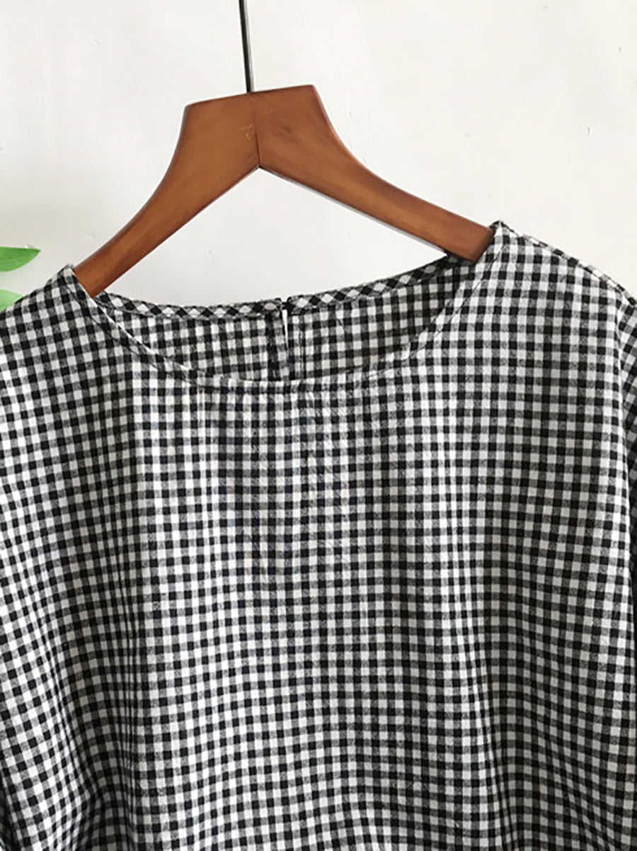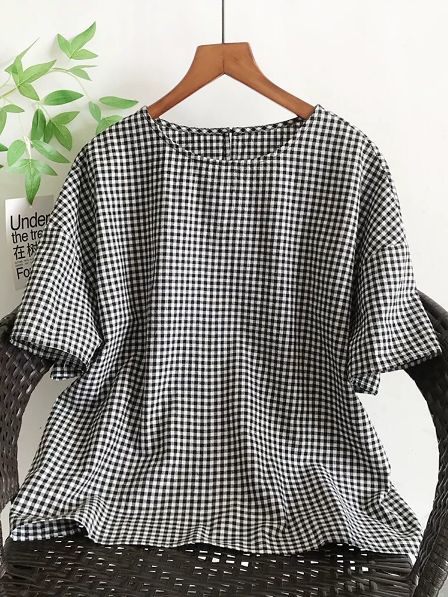 Blusa feminina de verão versátil com decote redondo e estampa quadriculada