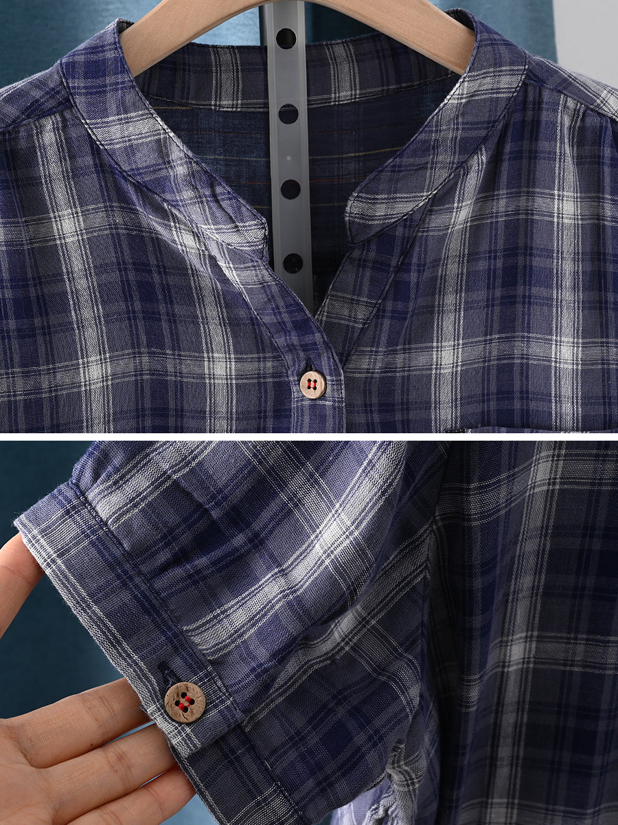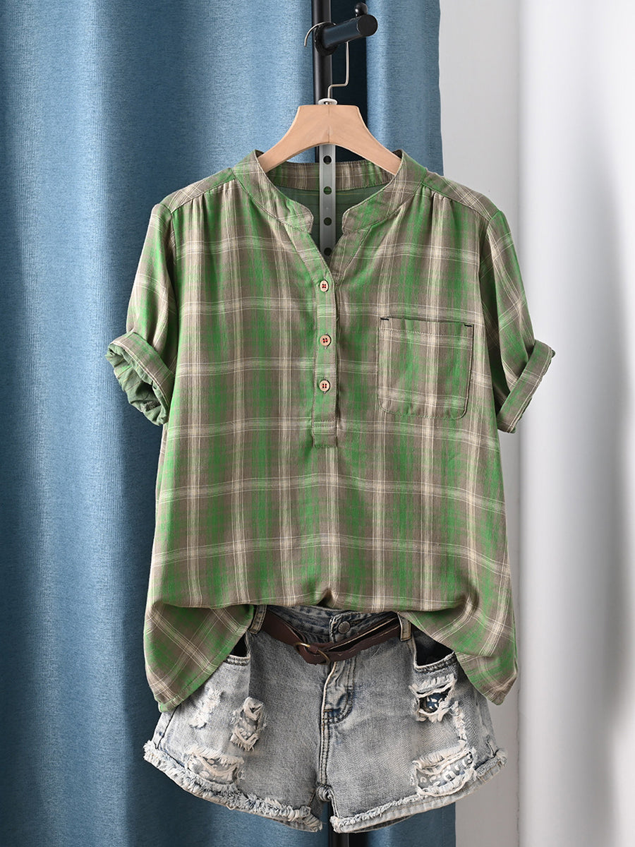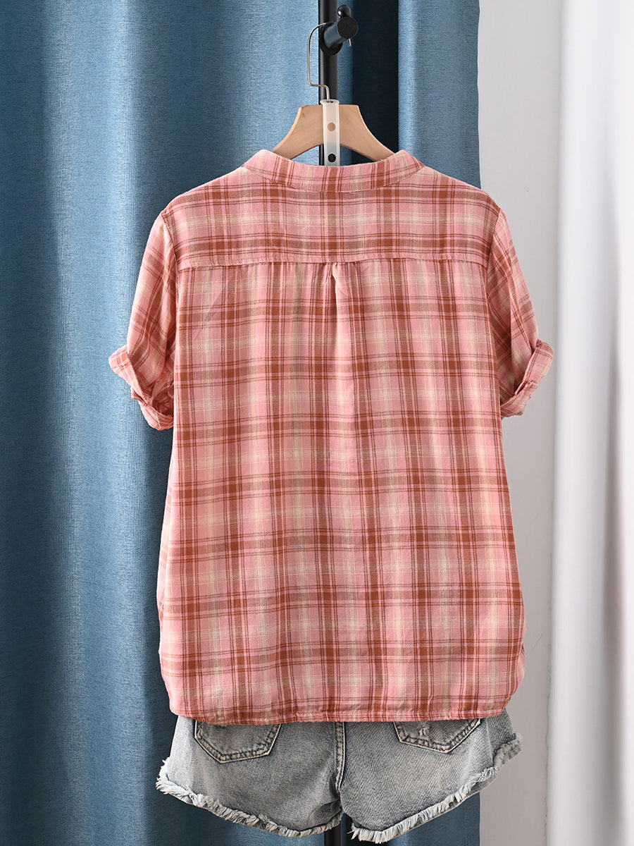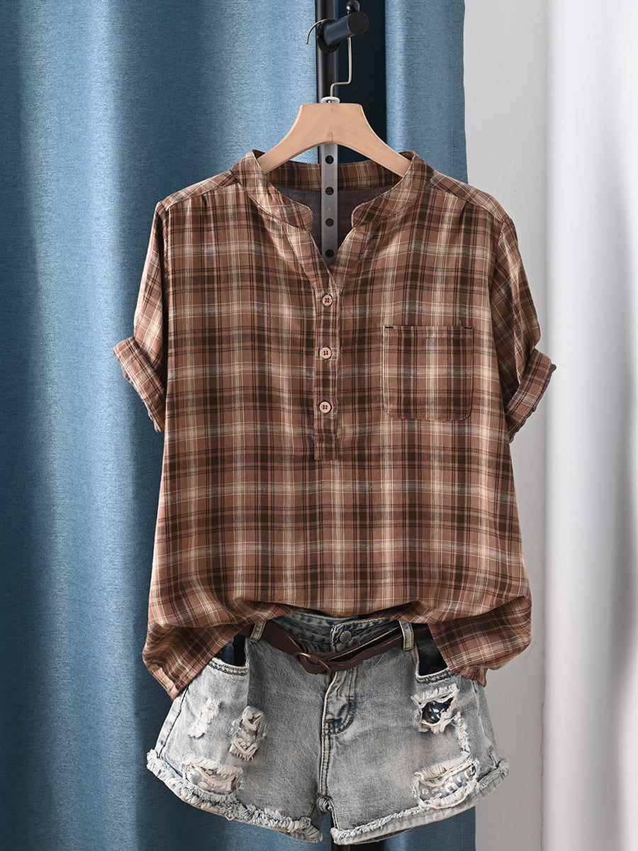 Camisa feminina de verão vintage xadrez com gola redonda, 100% algodão.