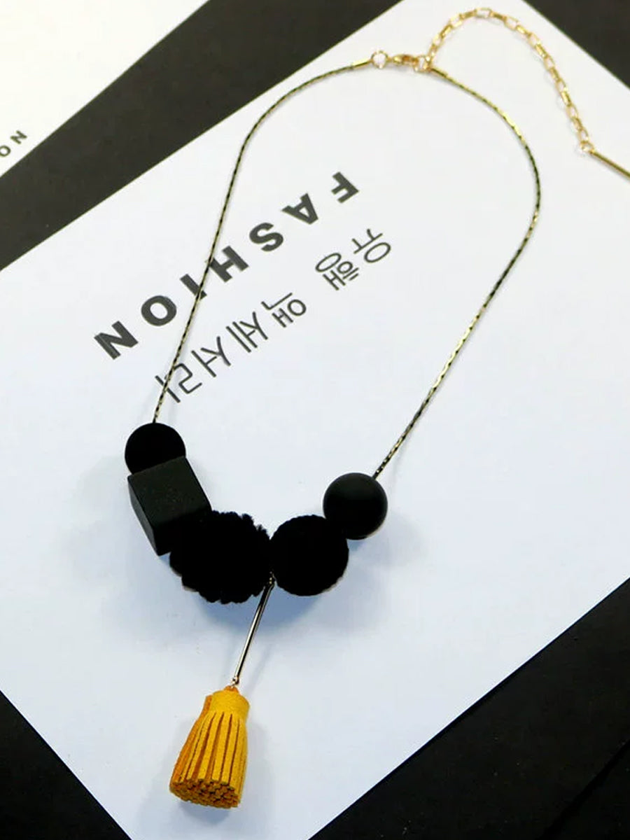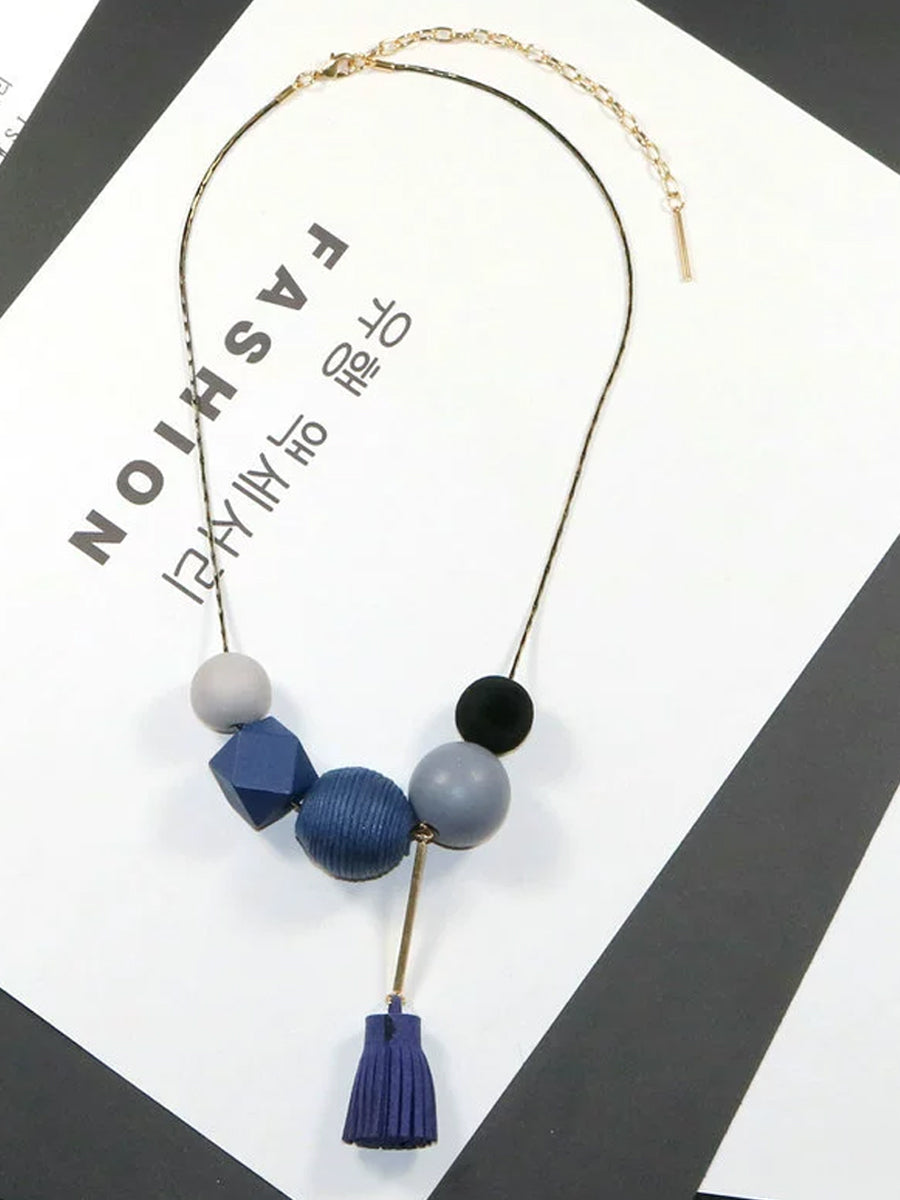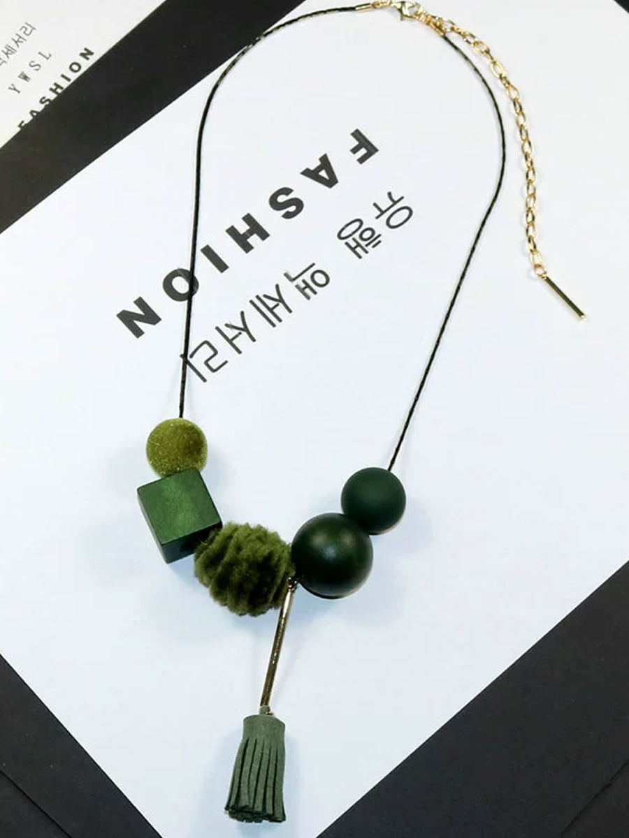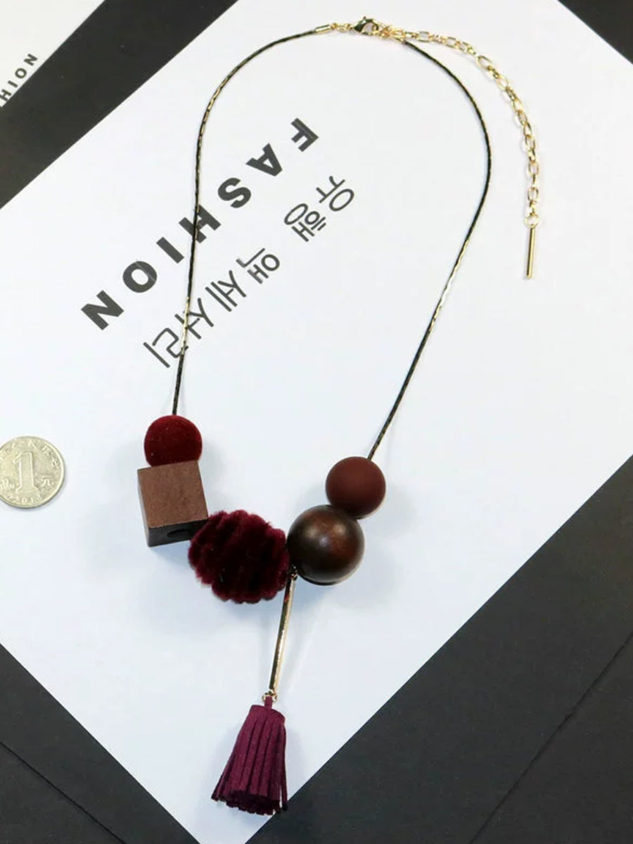 Colar feminino vintage com pingente de bola em liga metálica e madeira.