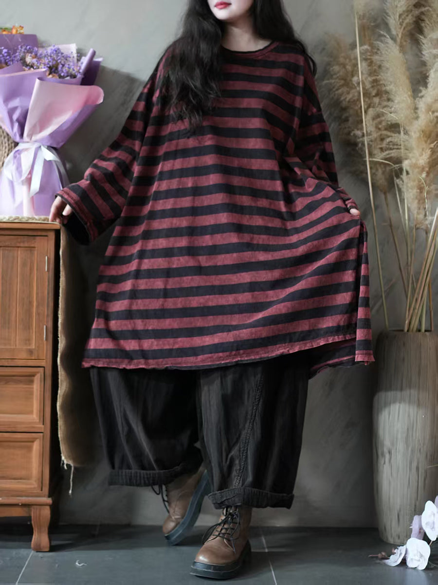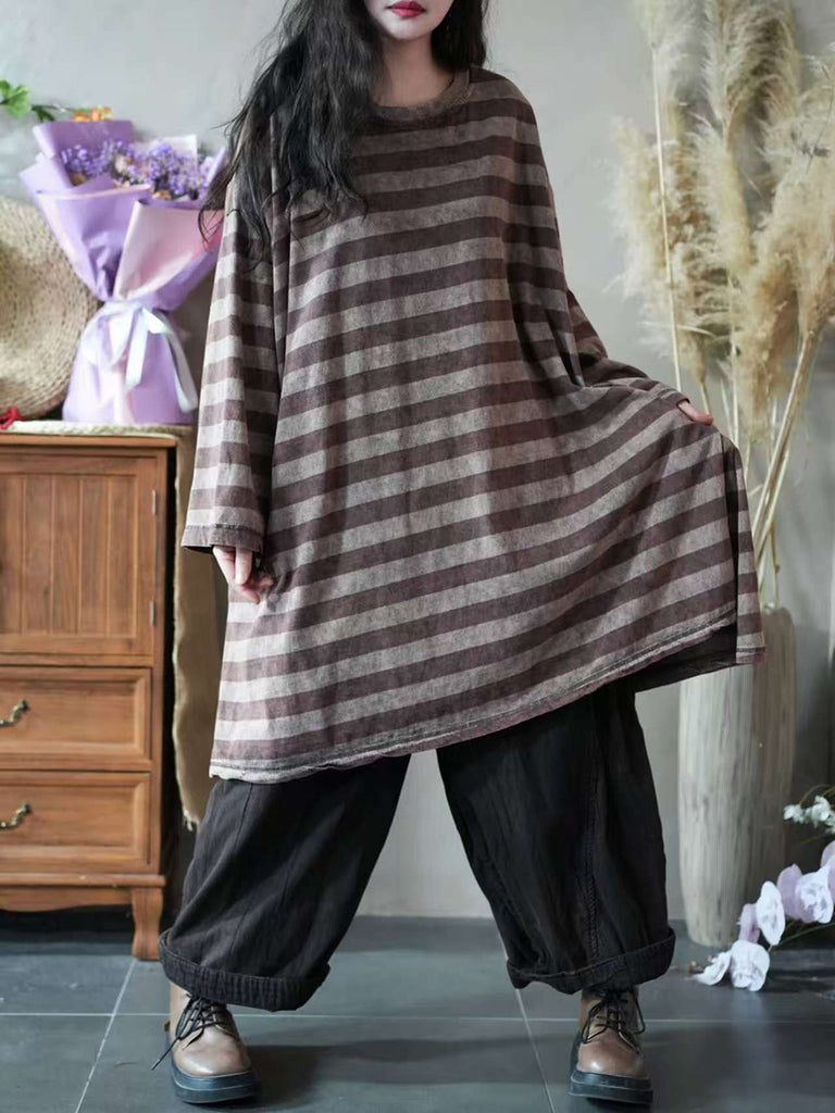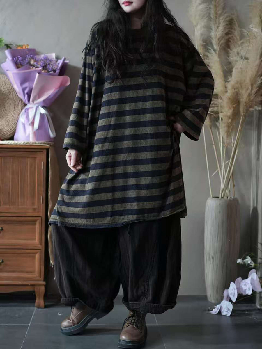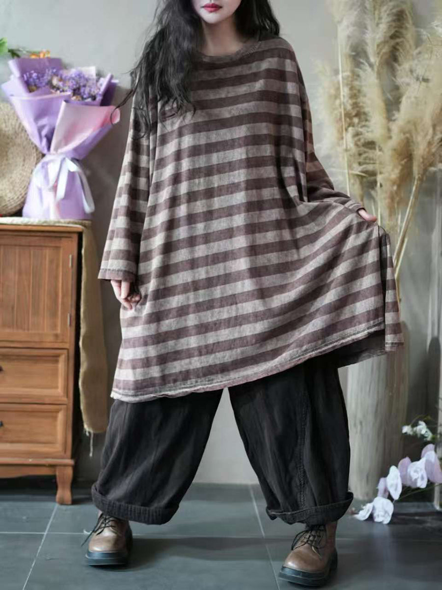 Blusa feminina vintage de algodão com estampa listrada, gola redonda e modelagem outonal.