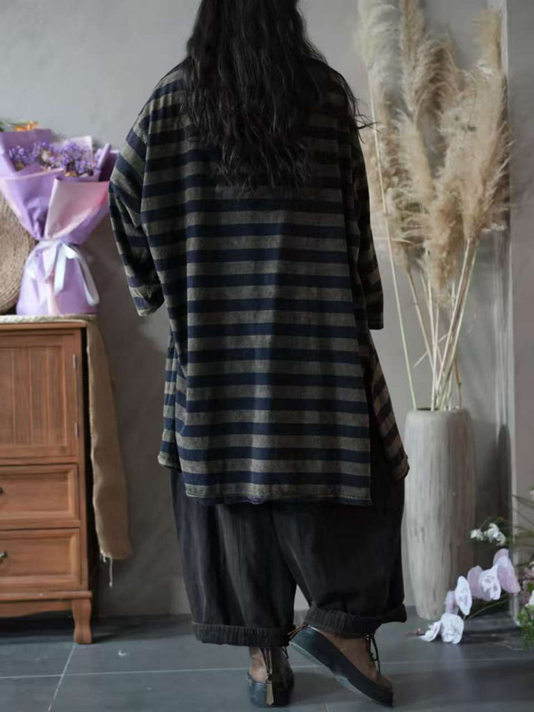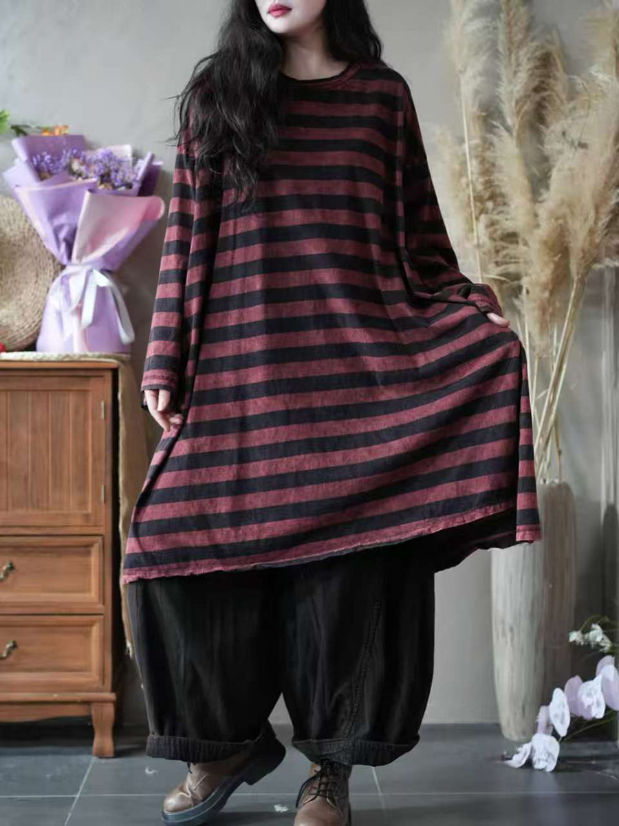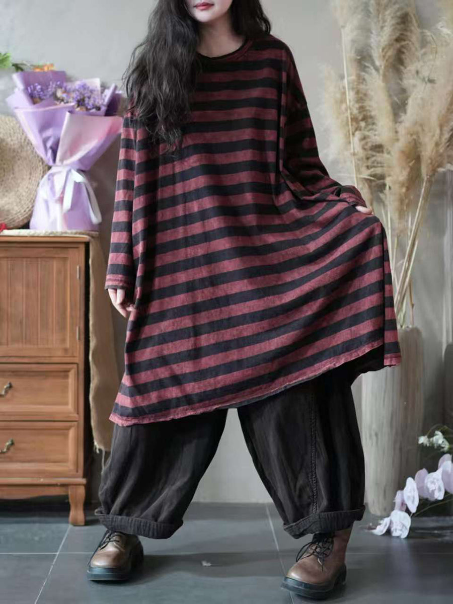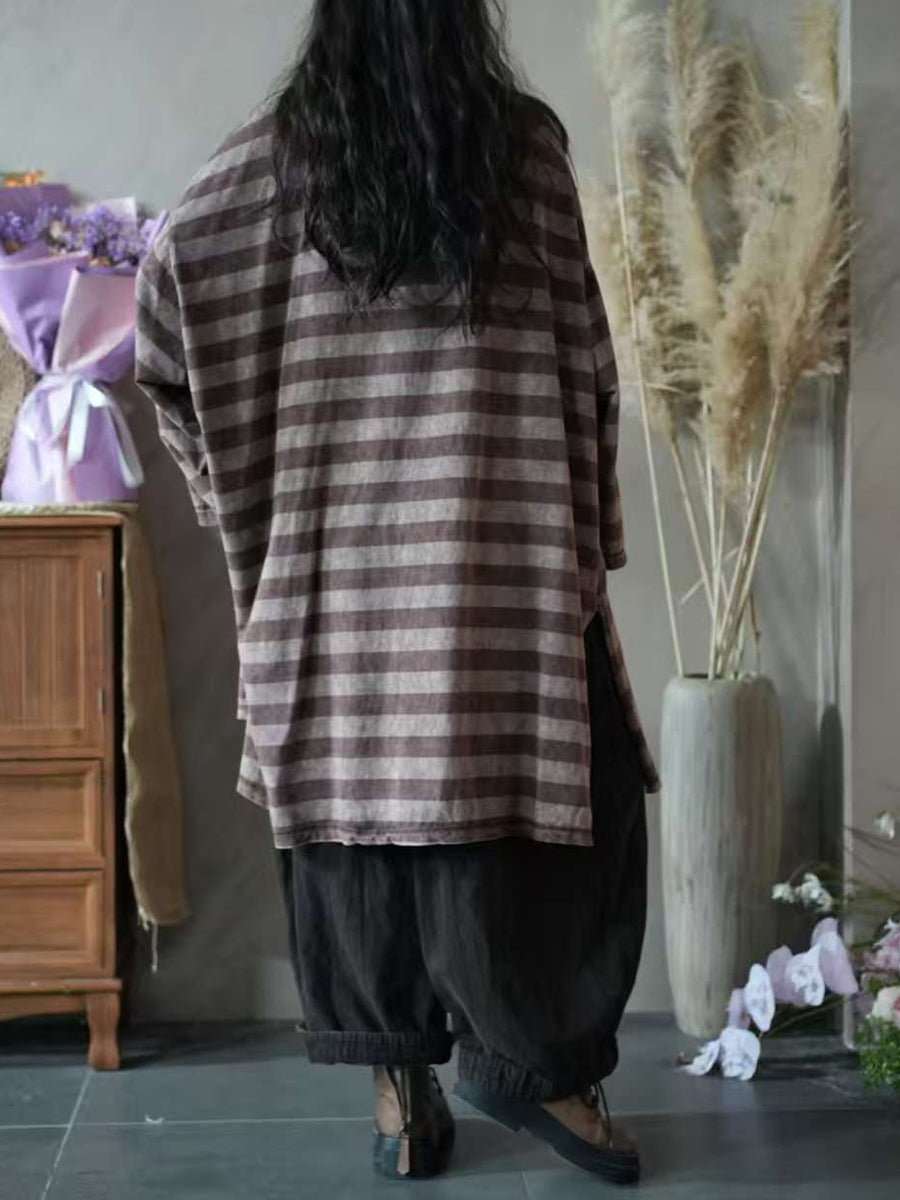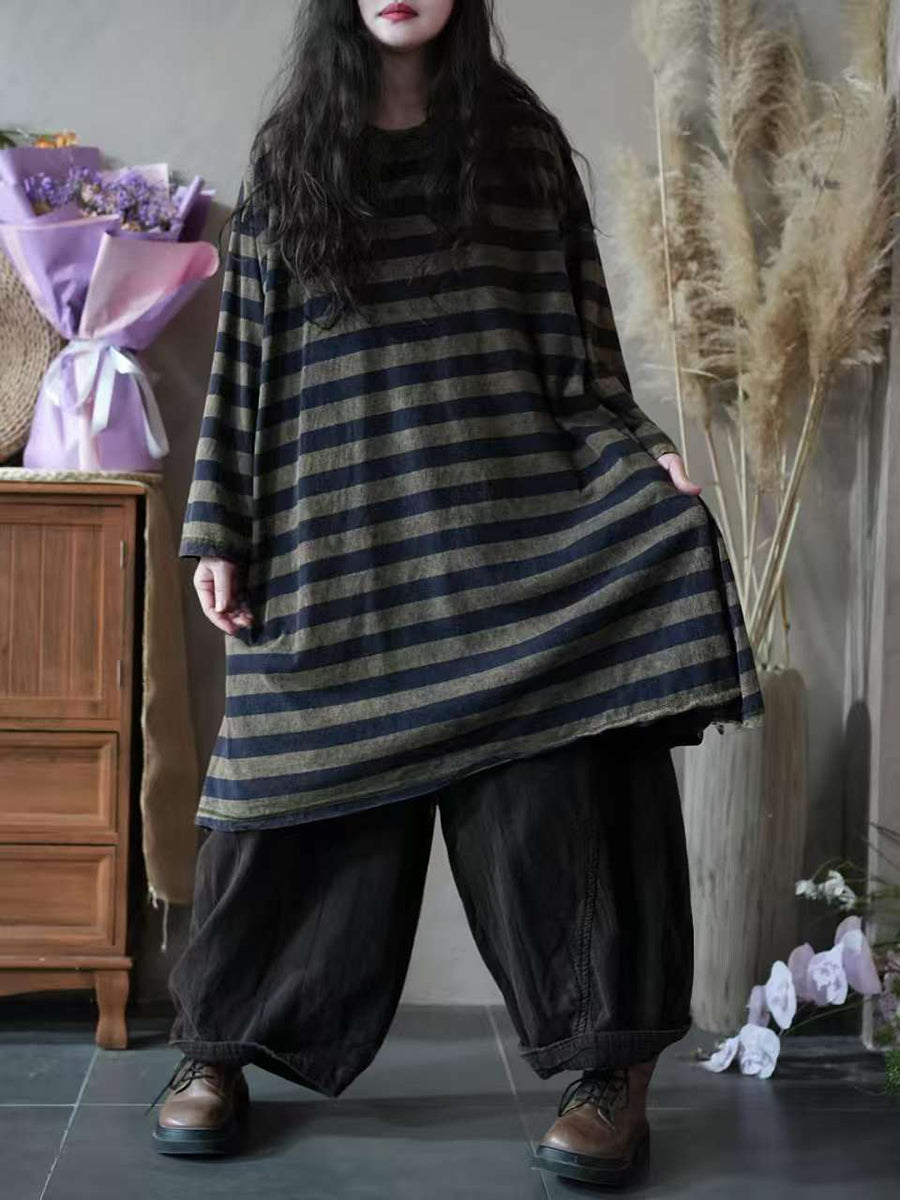 Blusa feminina vintage de algodão com estampa listrada, gola redonda e modelagem outonal.