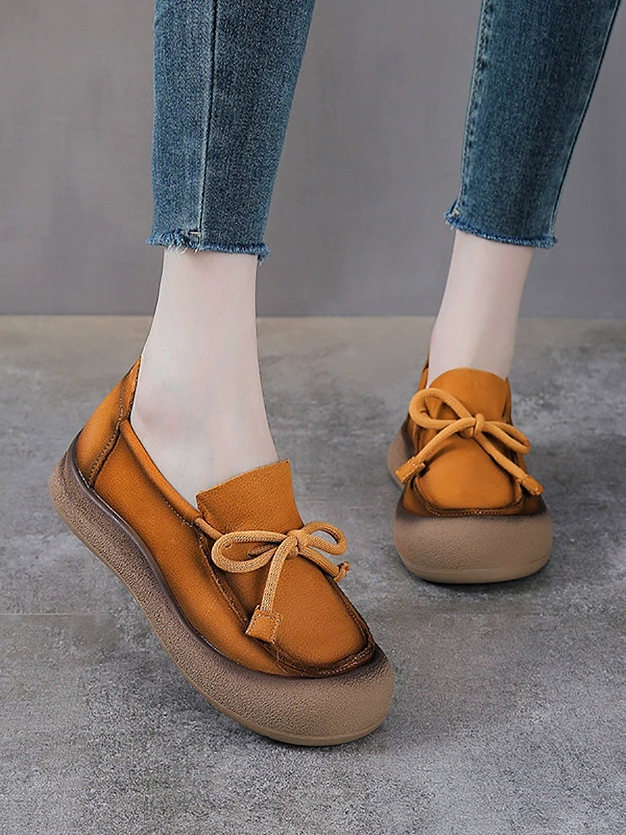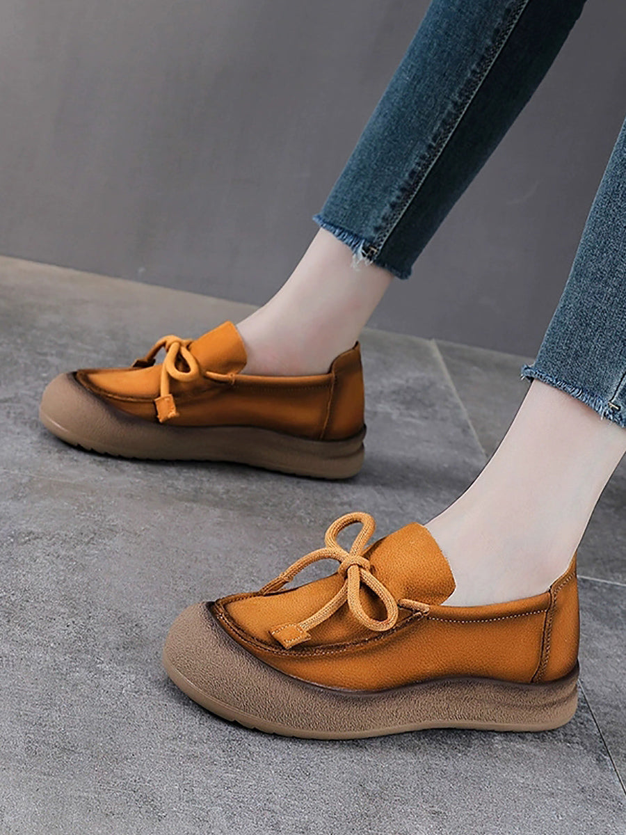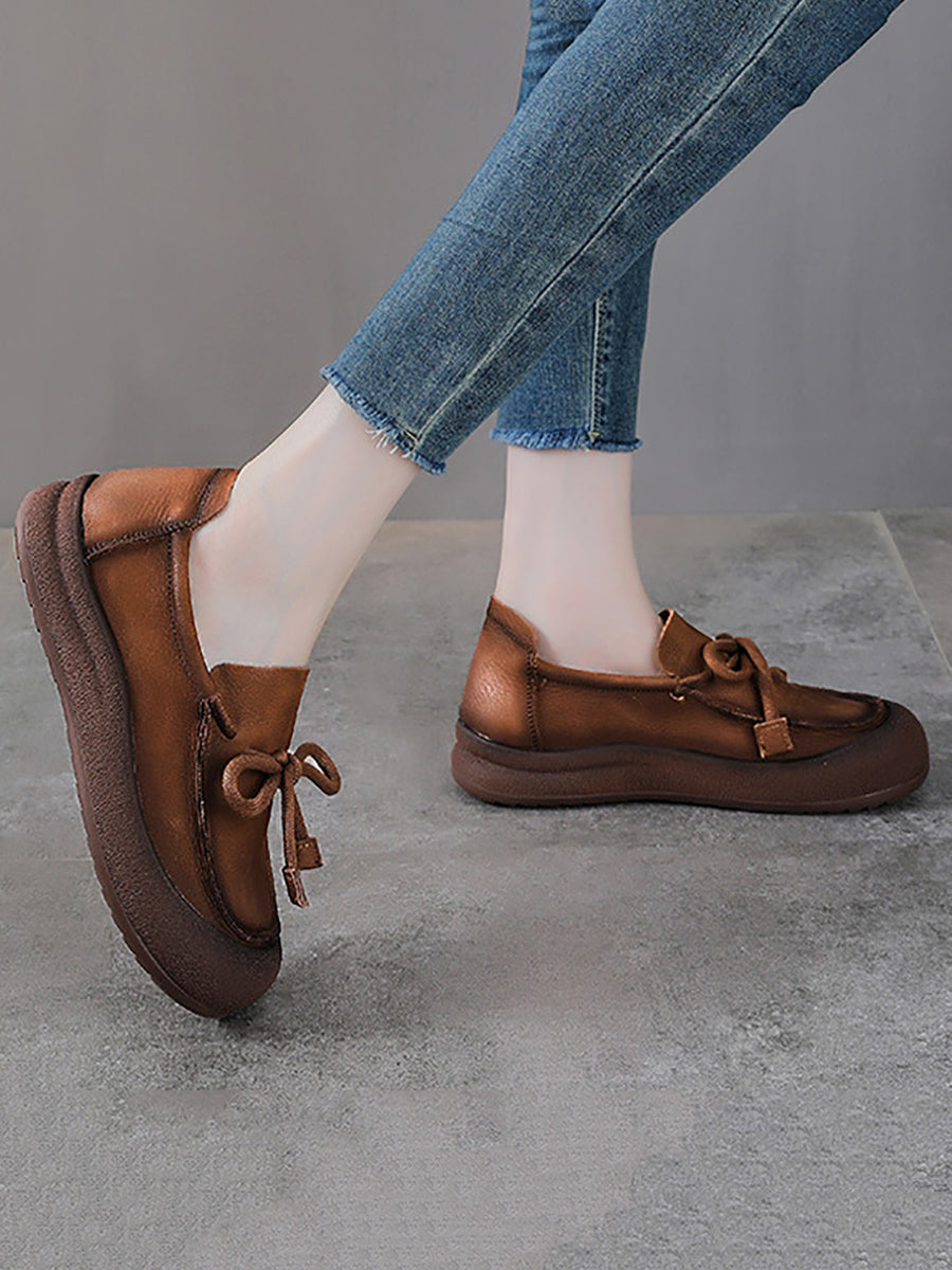 Sapatos femininos vintage de couro genuíno com laço.