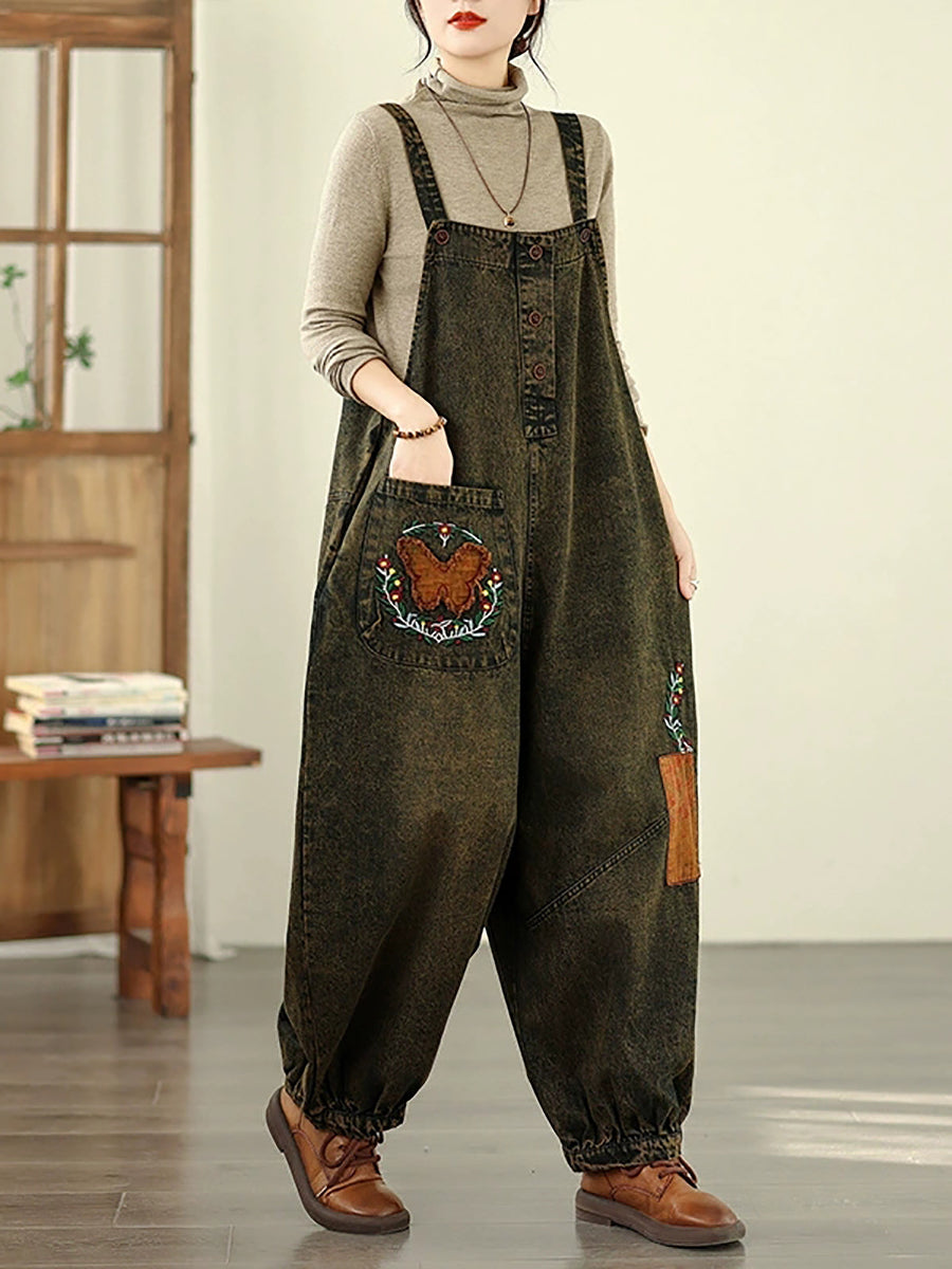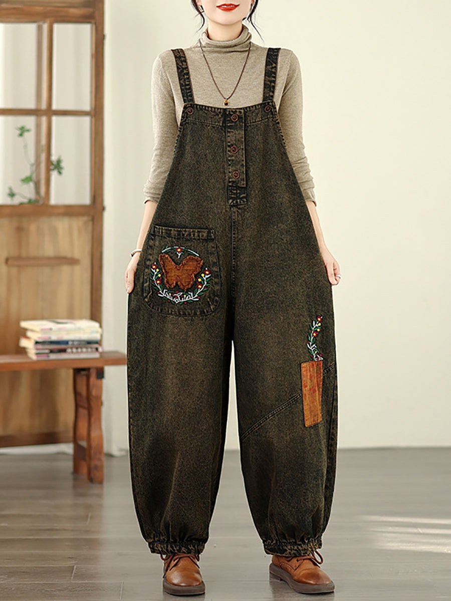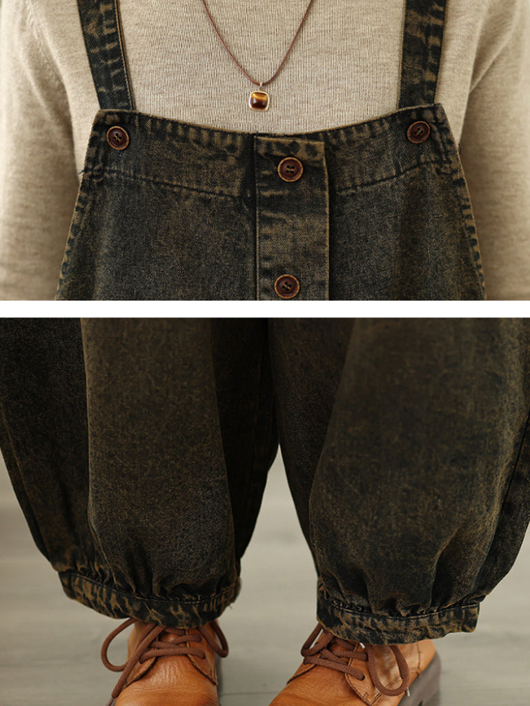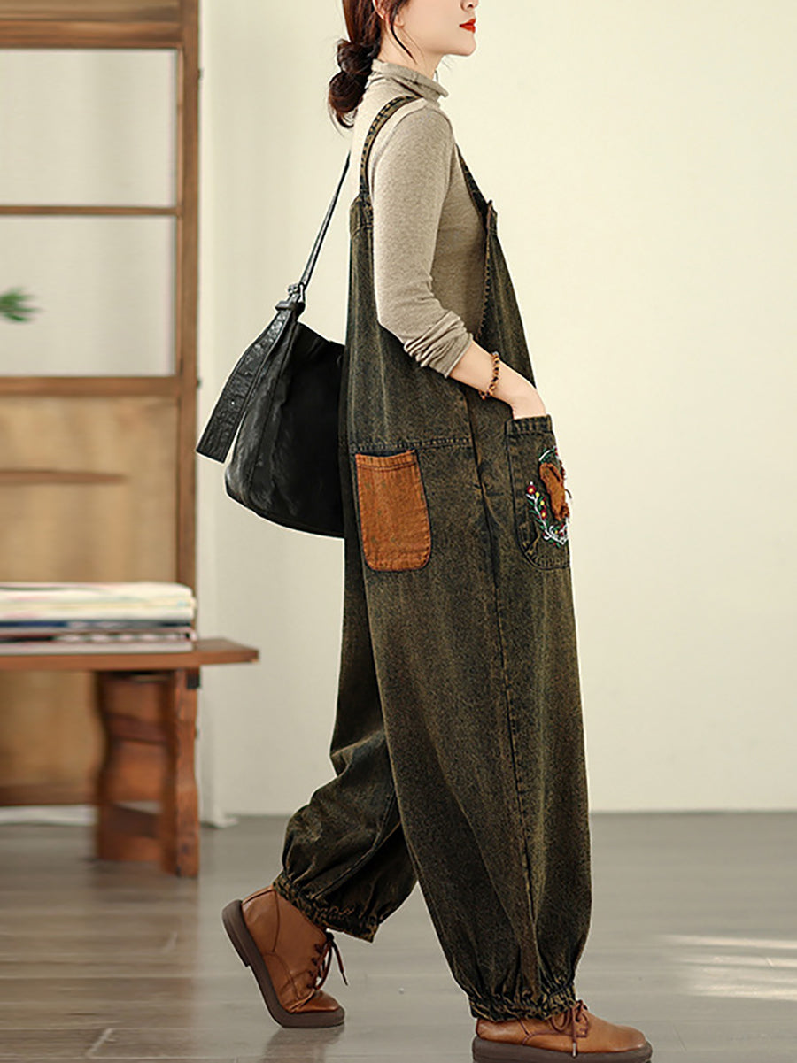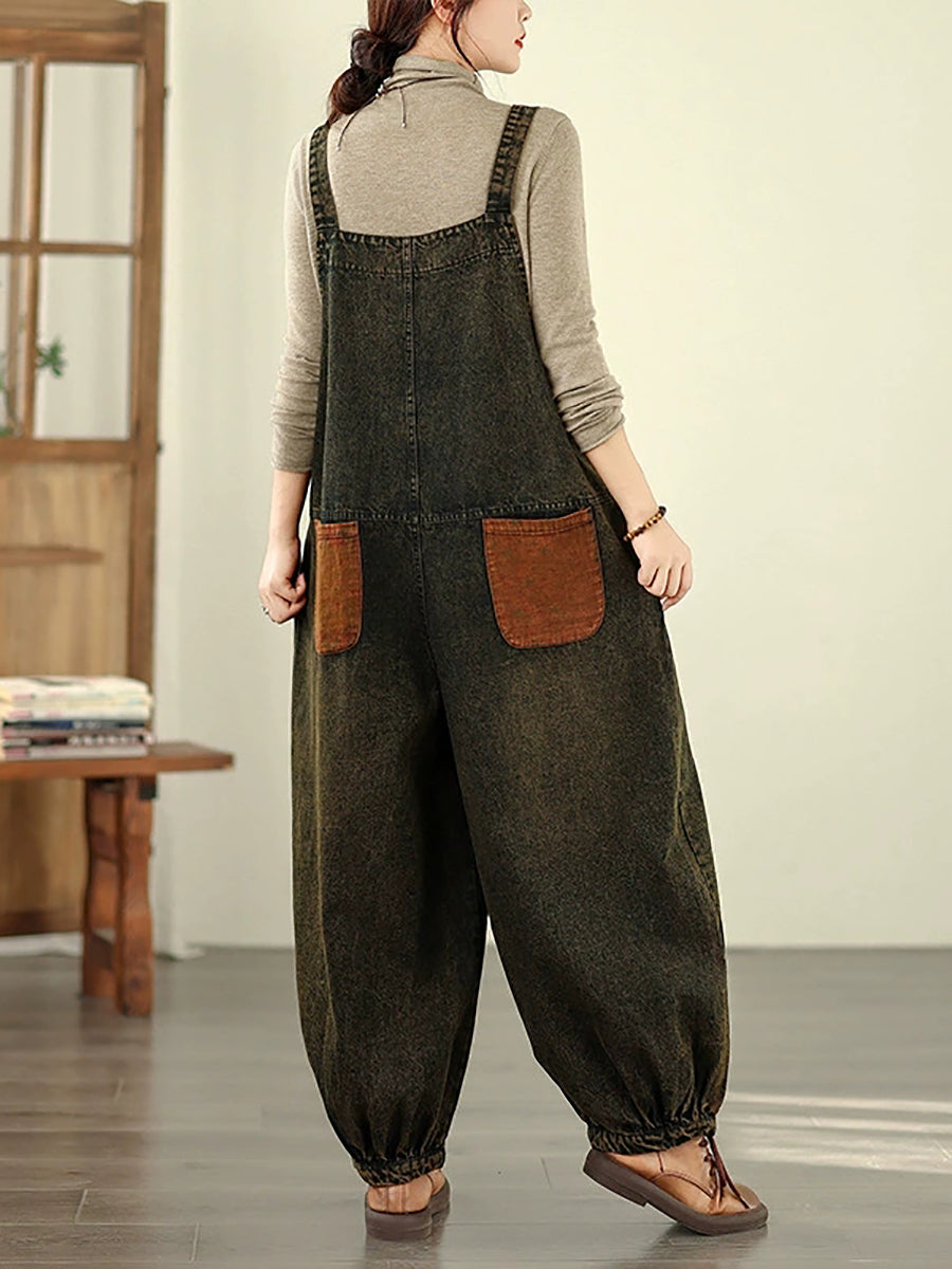 Macacão feminino vintage patchwork em algodão, estilo jeans, modelagem solta.