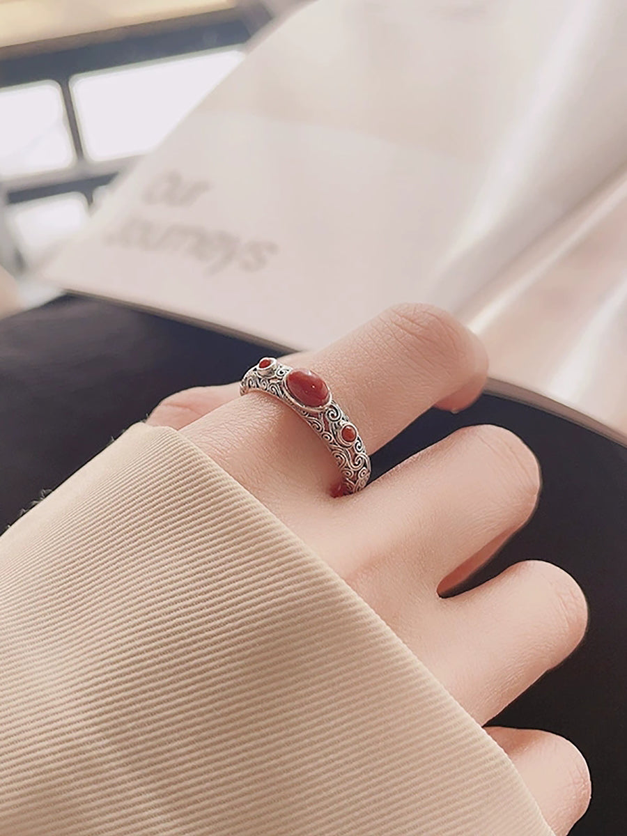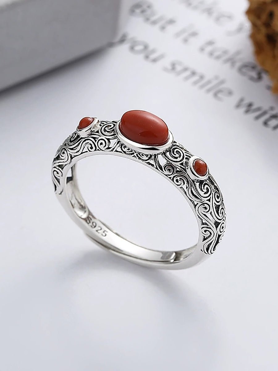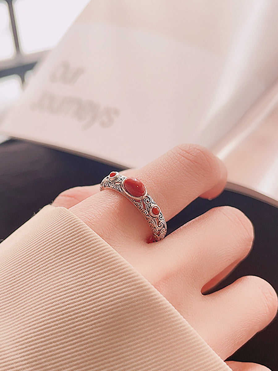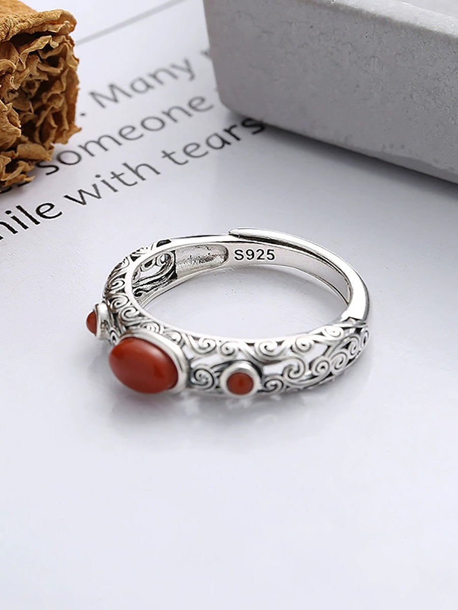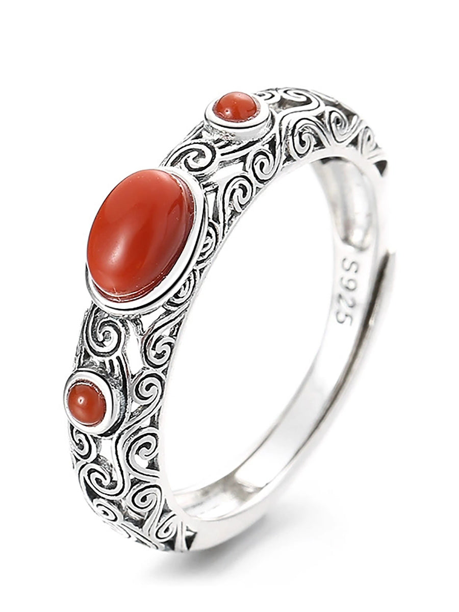 Anel feminino vintage ajustável em prata S925 com ágata vermelha
