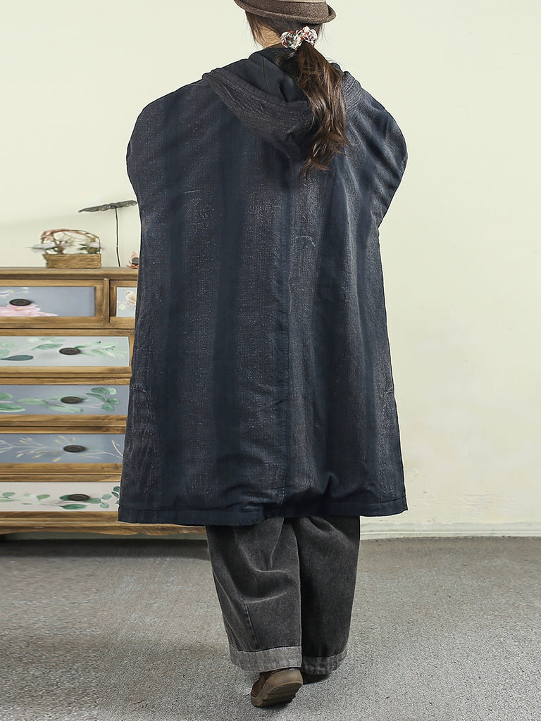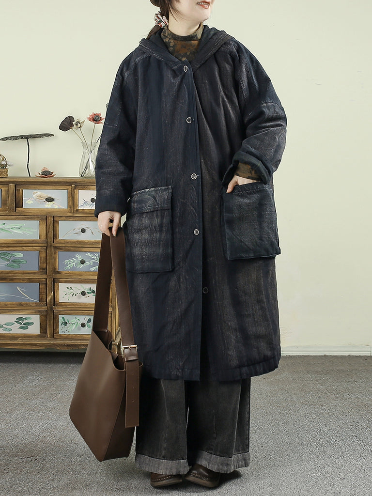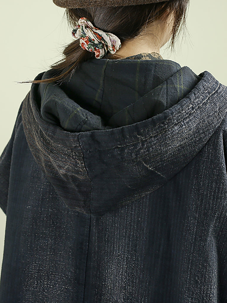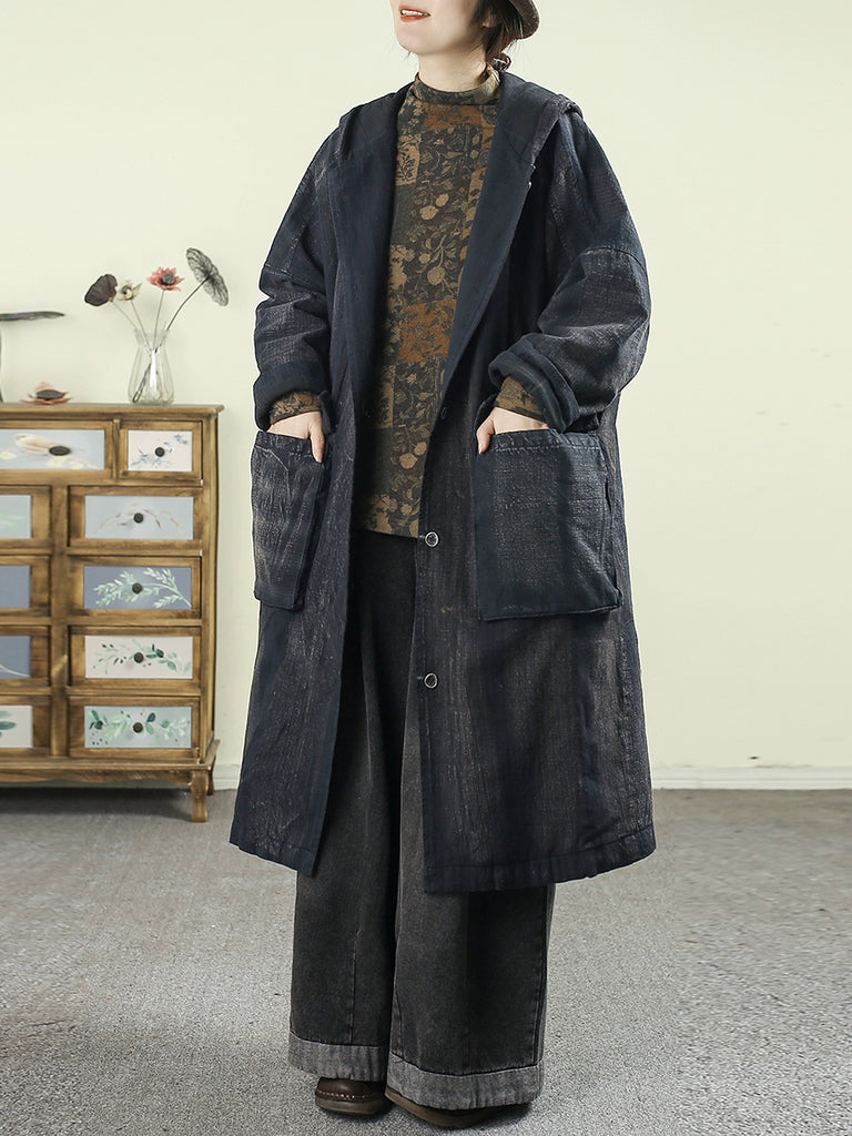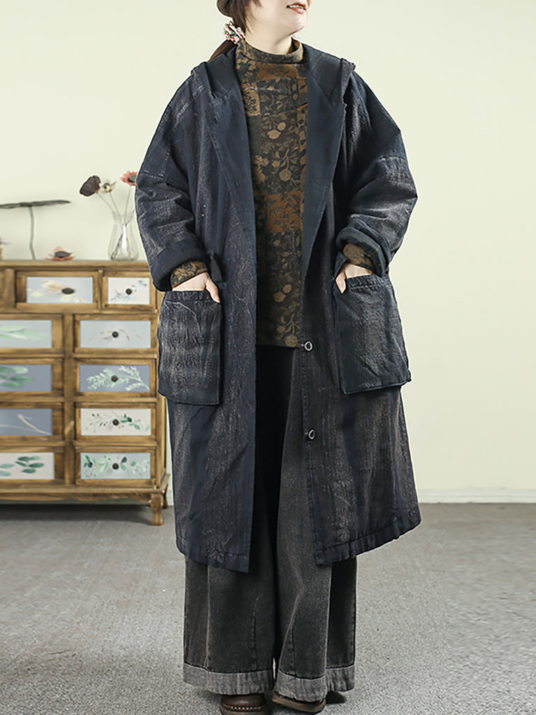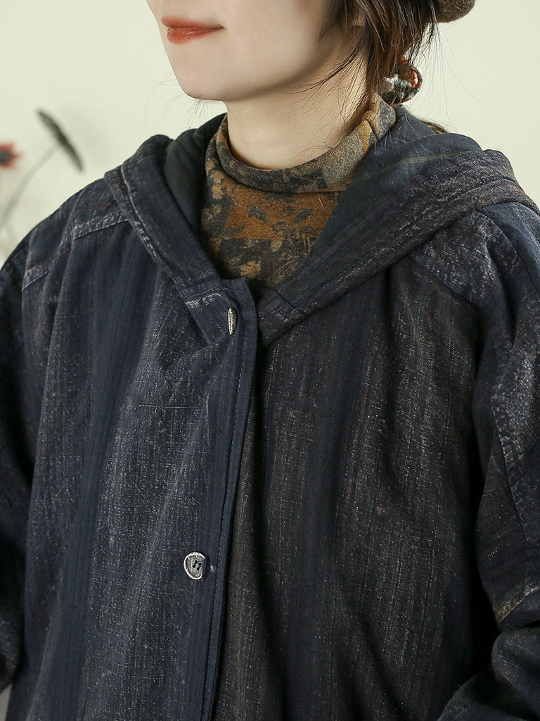 Este casaco é confeccionado em jeans de cor pura, com gola com capuz e mangas raglan amplas, combinando estilo vintage com acolchoamento prático. Projetado para uso no outono e inverno, oferece aquecimento e um visual atemporal.