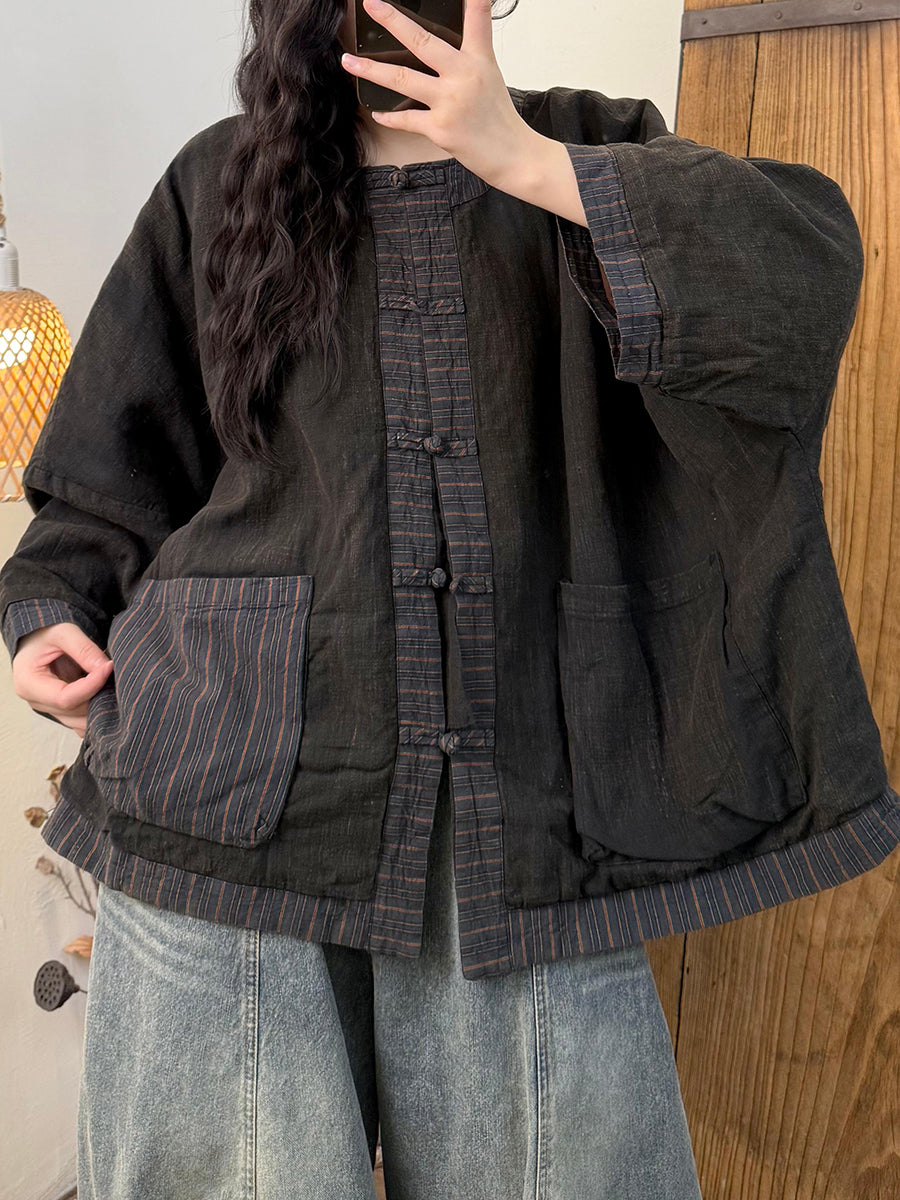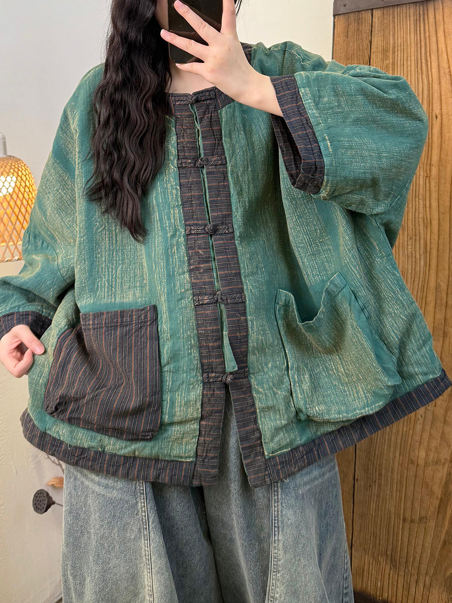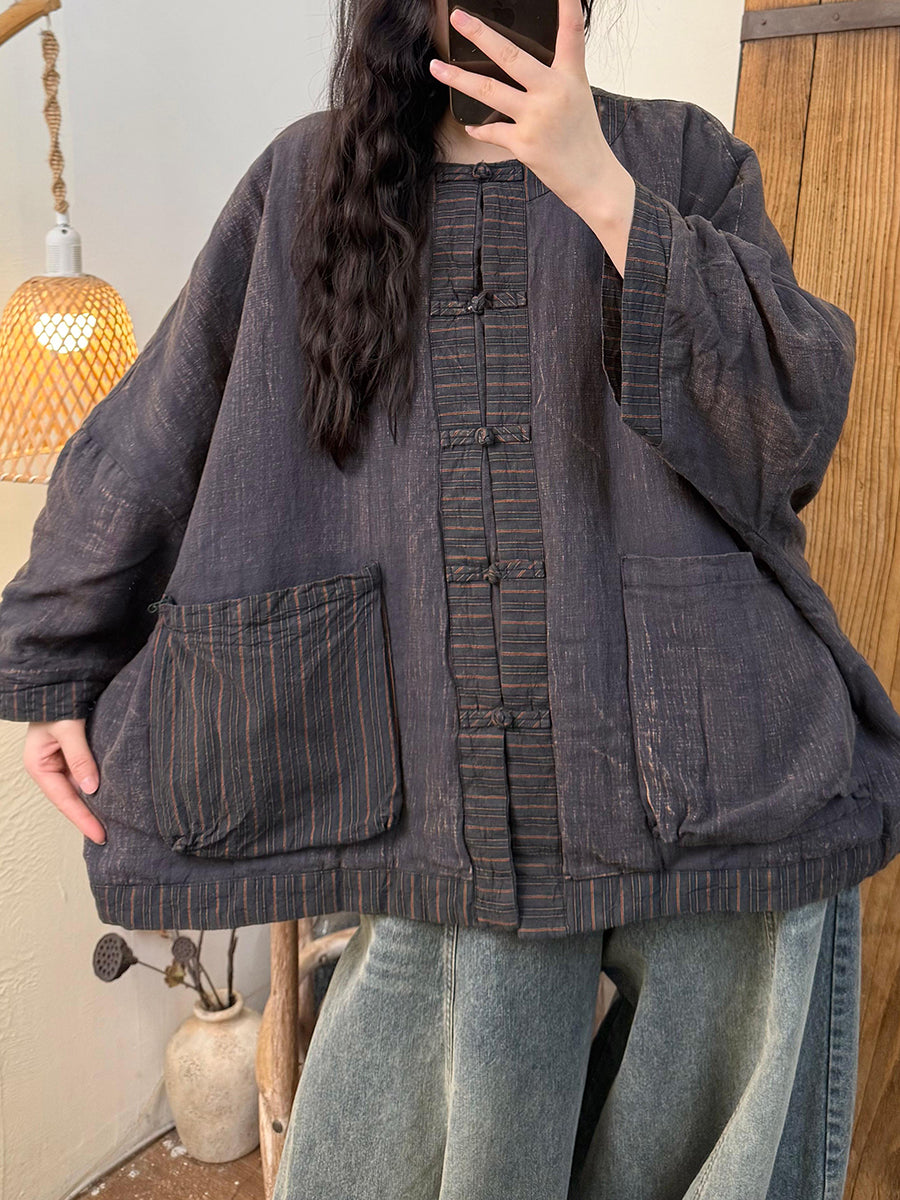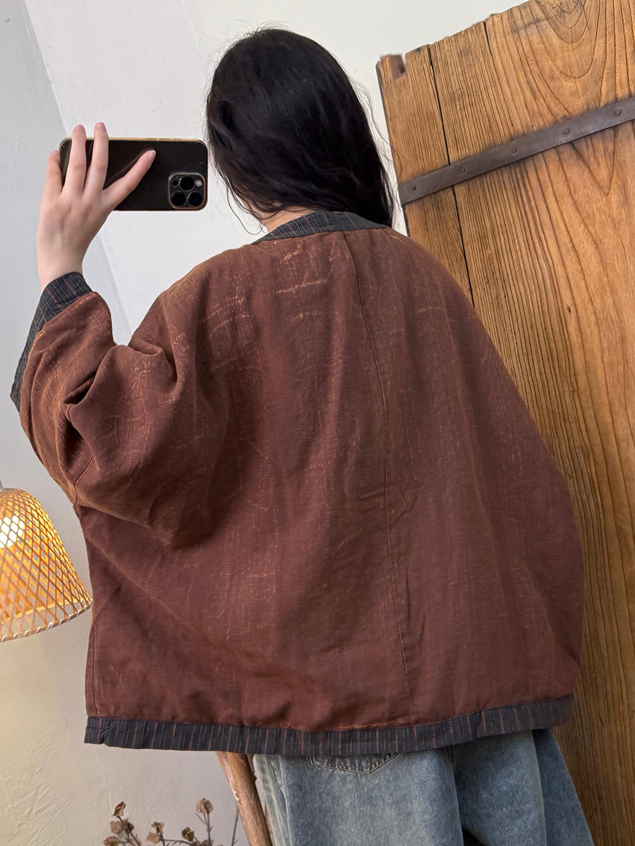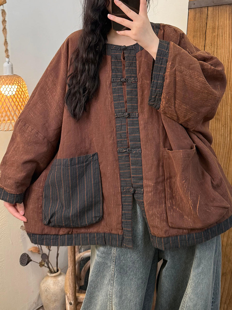 Casaco acolchoado feminino vintage de inverno com listras e detalhes em patchwork, gola redonda.