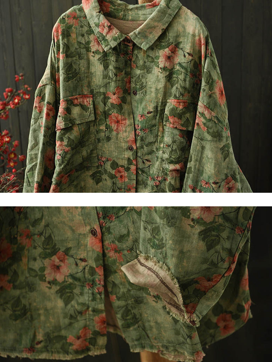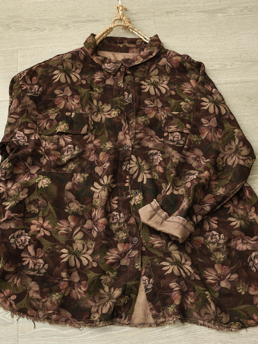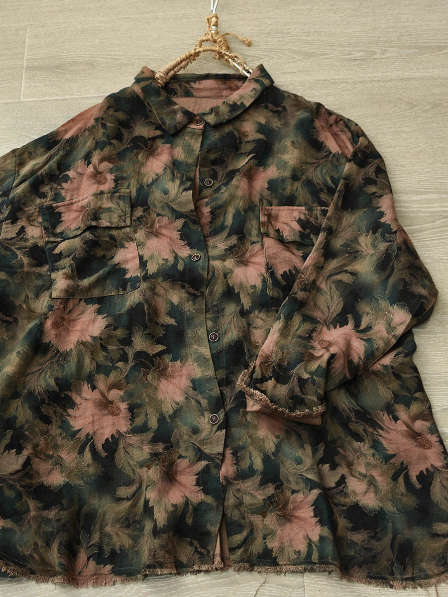 Camisa feminina de algodão com estampa floral artística para o inverno e gola dobrável.