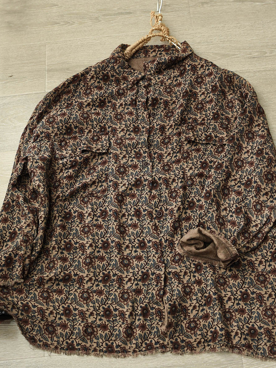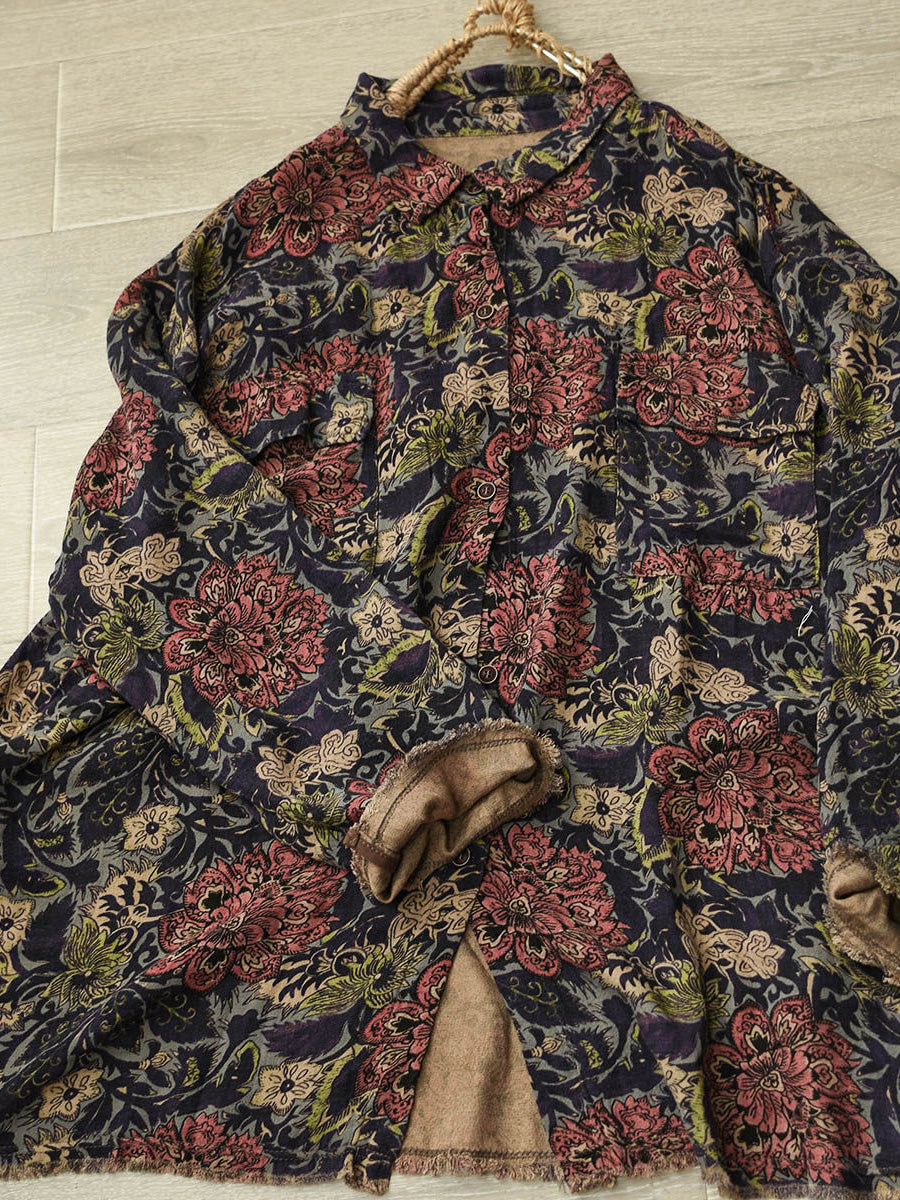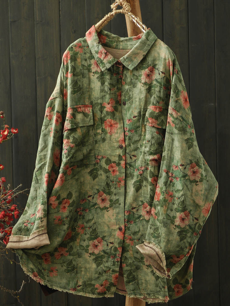Camisa feminina de algodão com estampa floral artística para o inverno e gola dobrável.