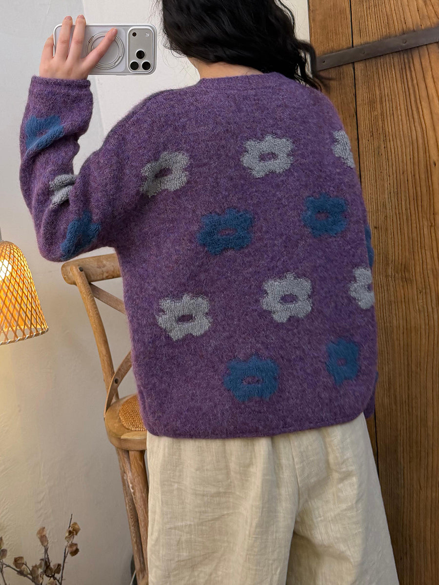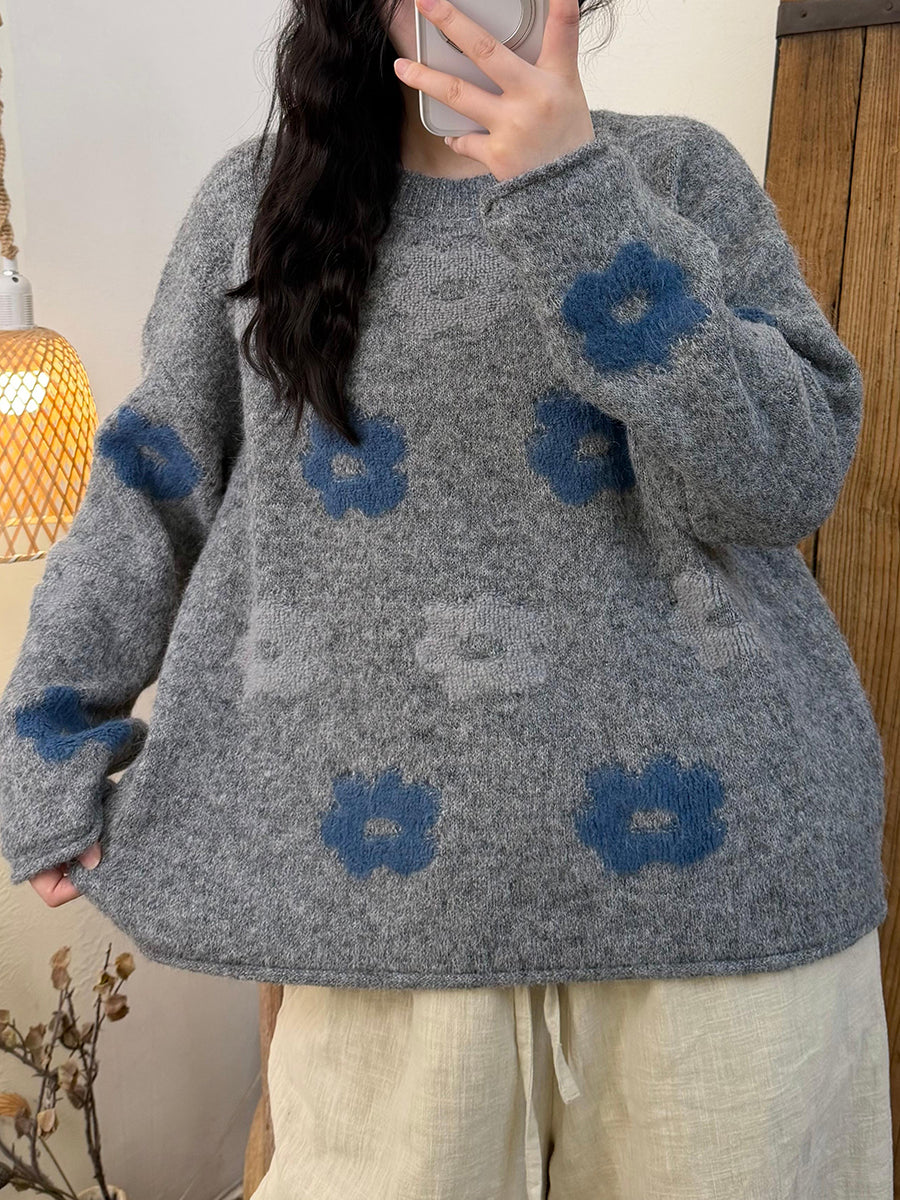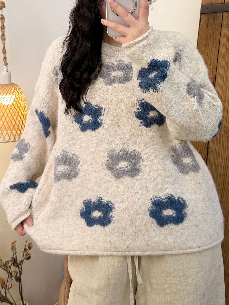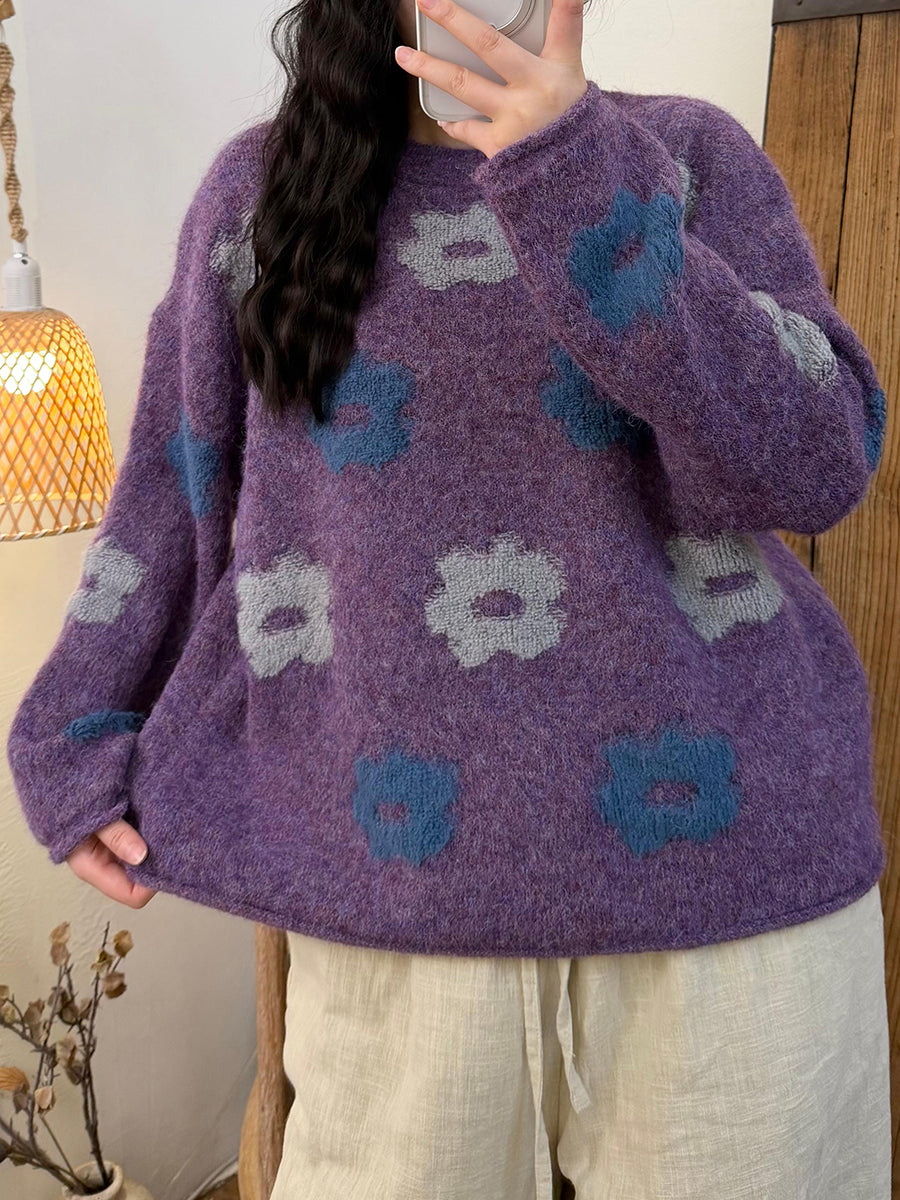 Suéter feminino de inverno com estampa floral artística e gola redonda em tricô.