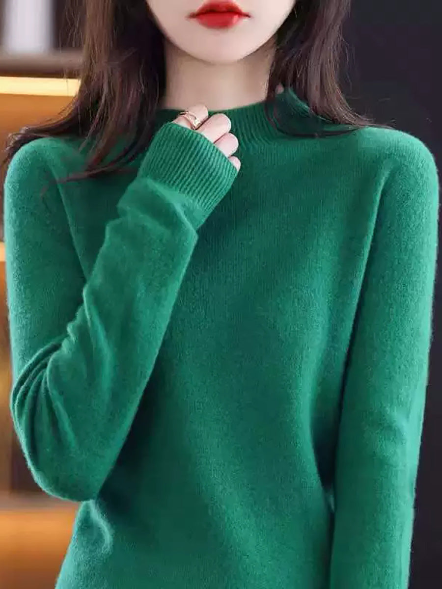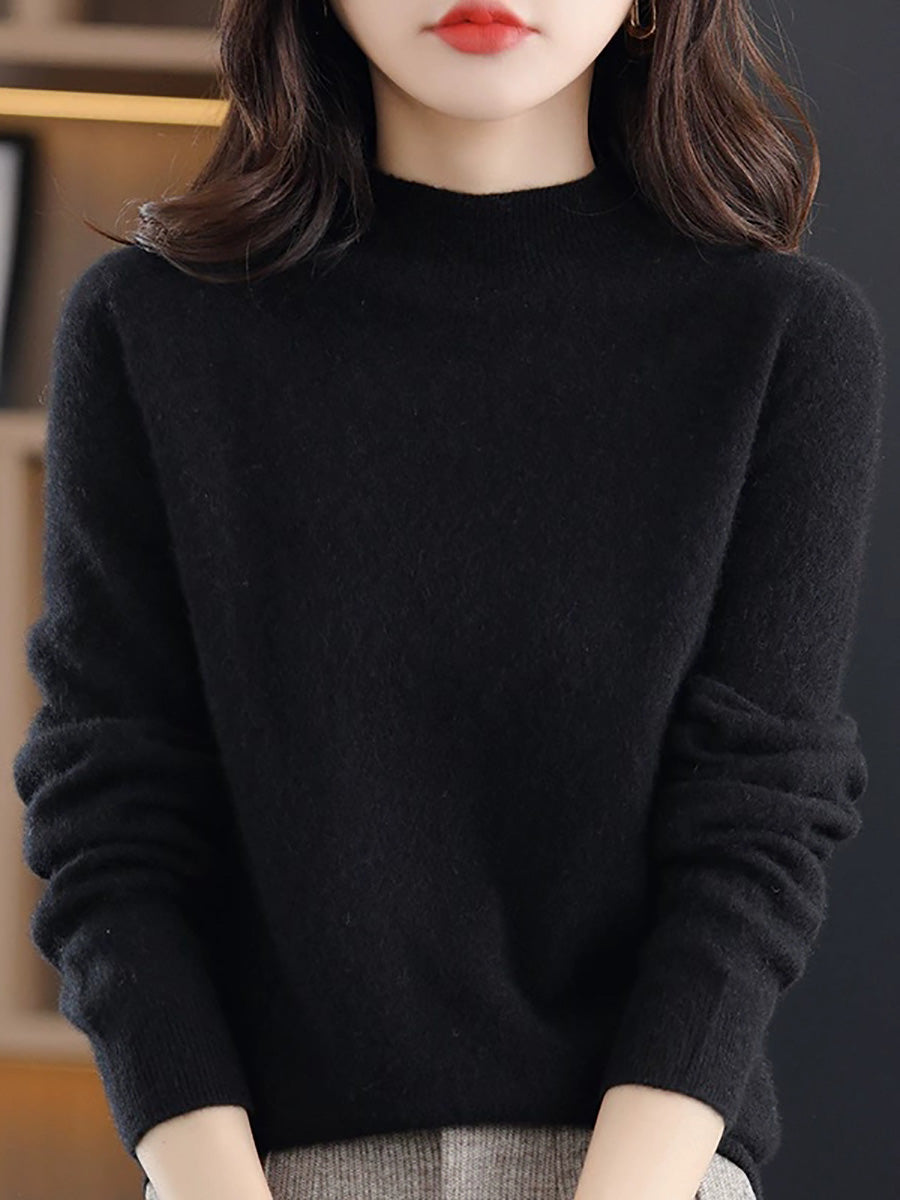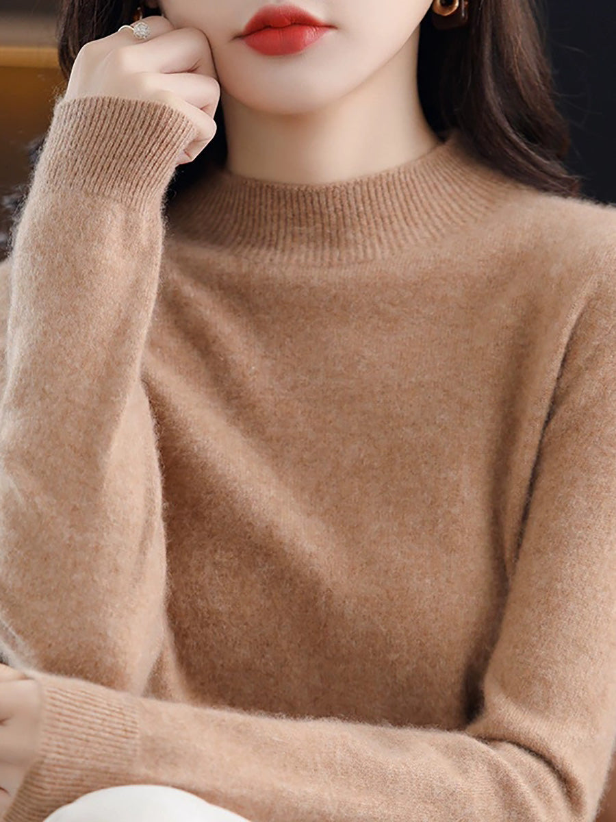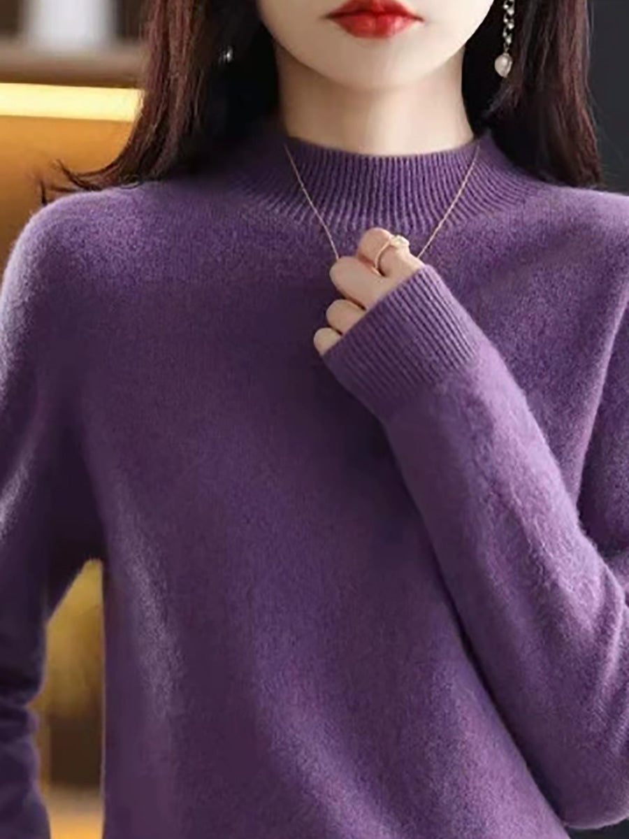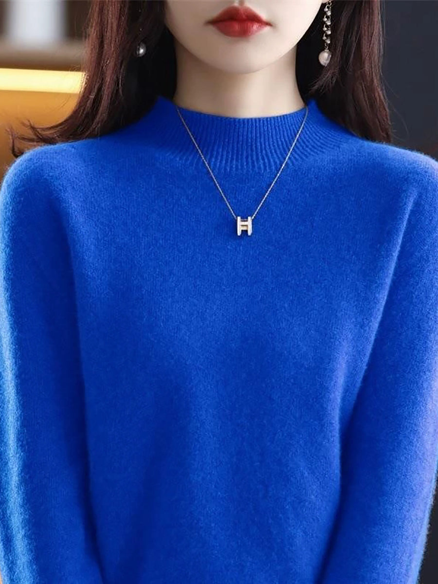 Suéter feminino de inverno com gola alta e estampa artística em cores lisas.