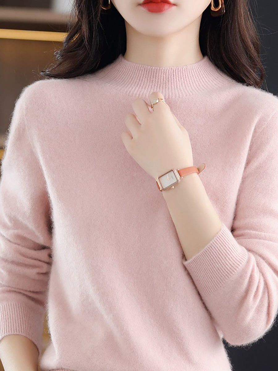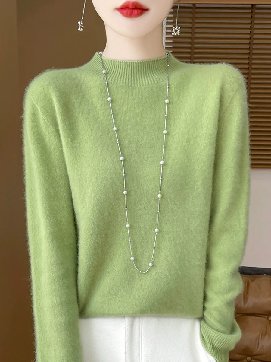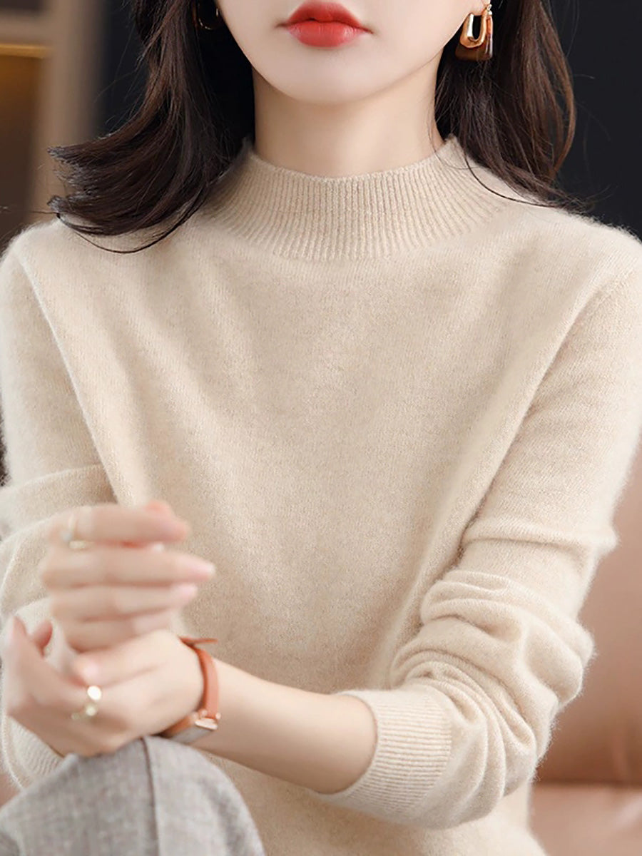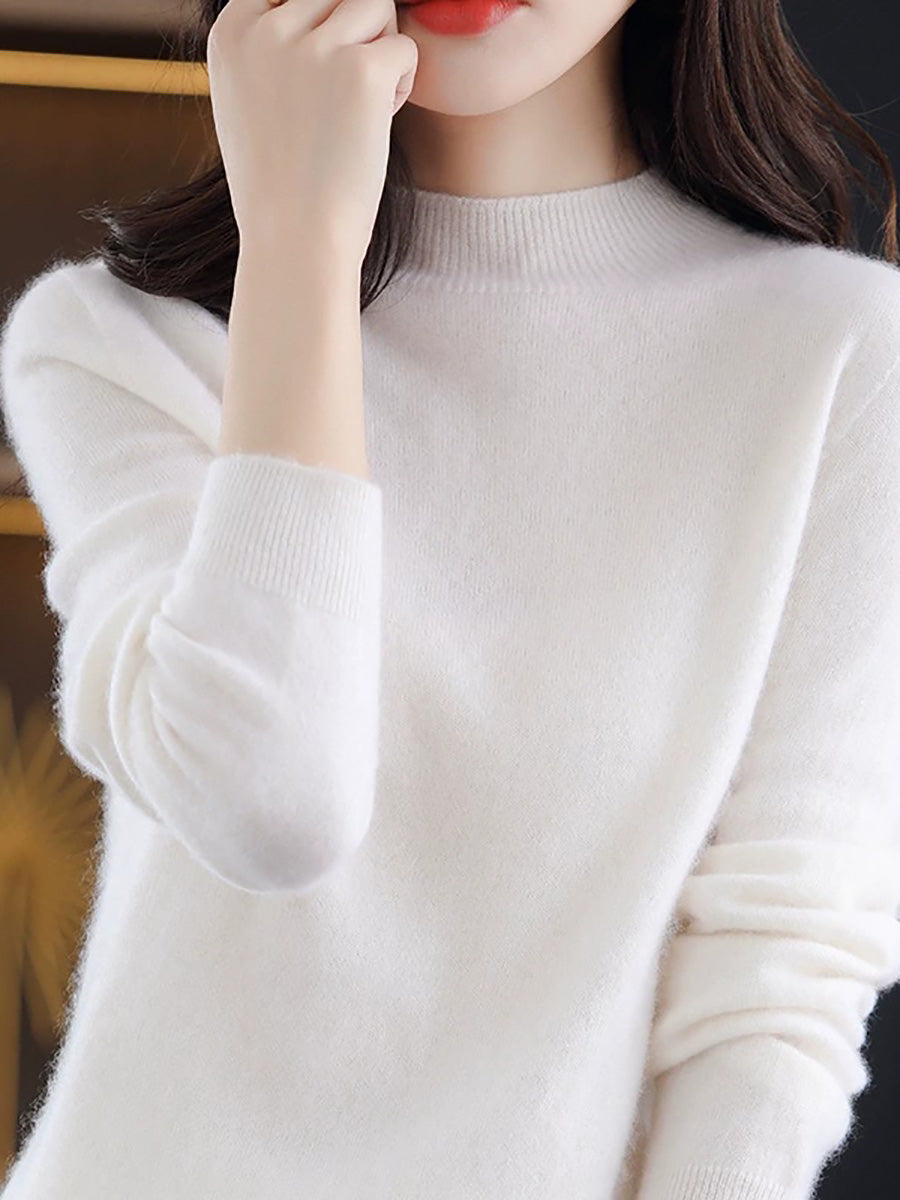 Suéter feminino de inverno com gola alta e estampa artística em cores lisas.