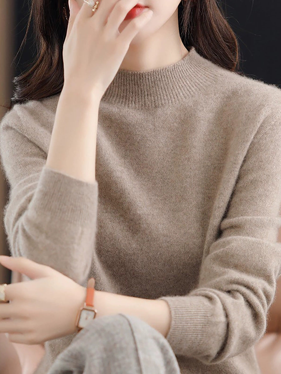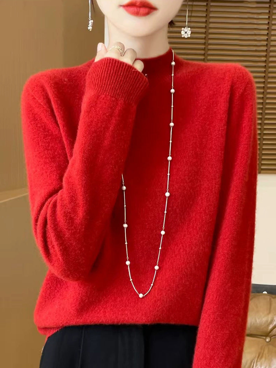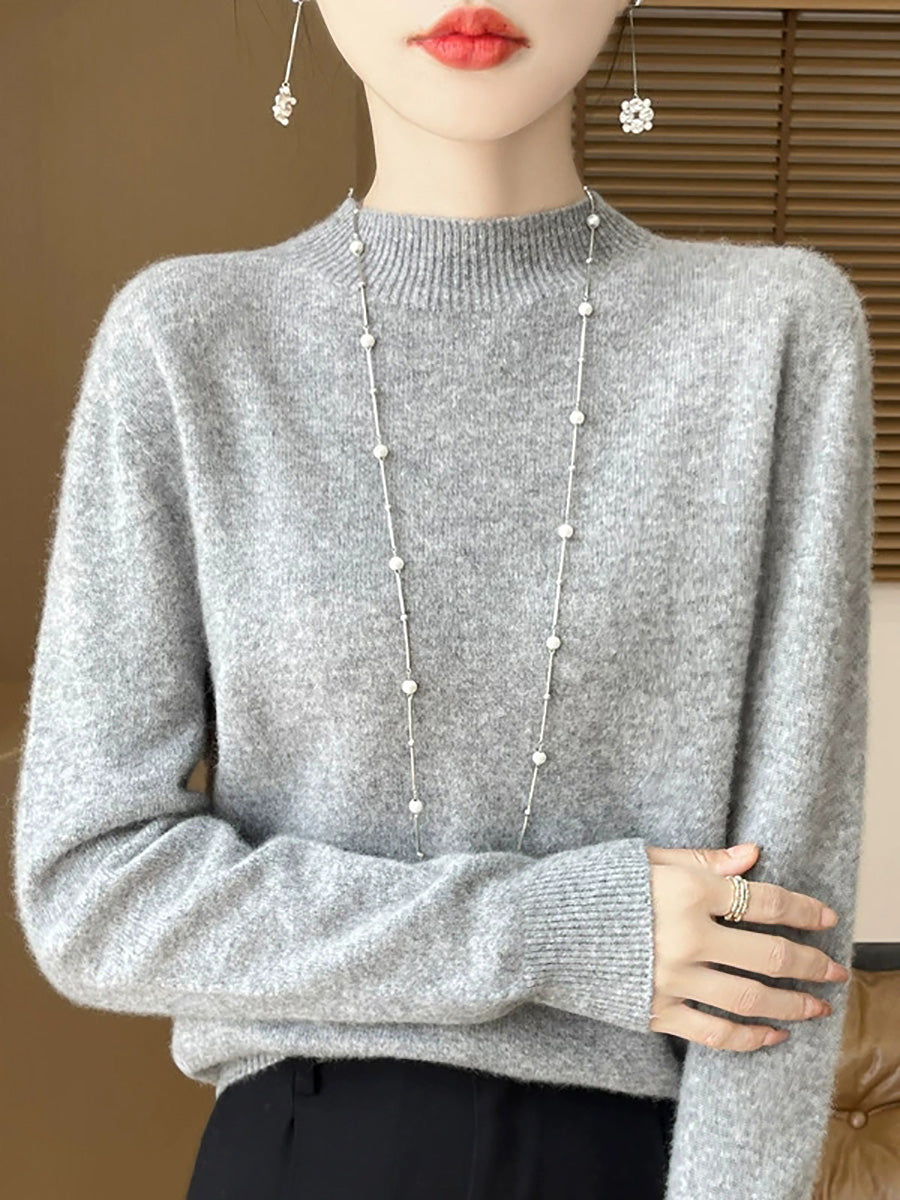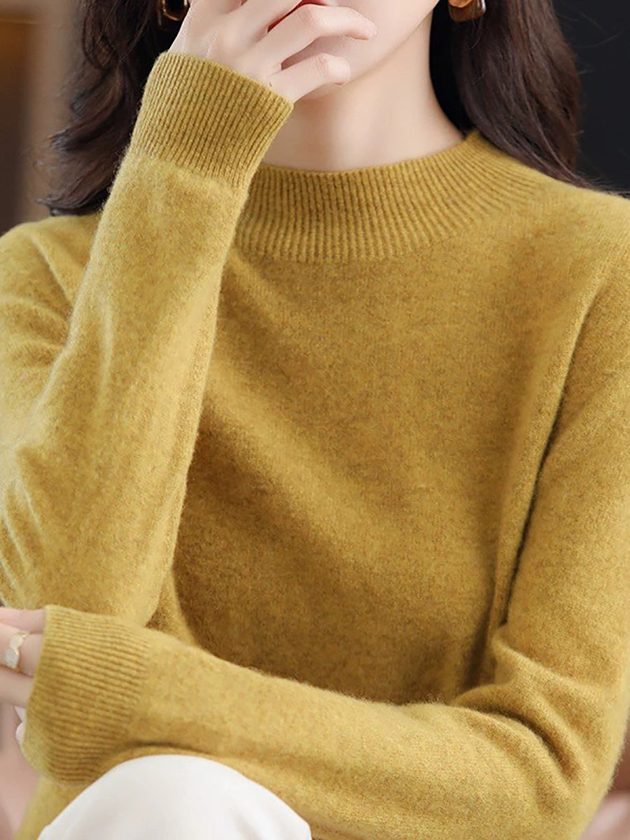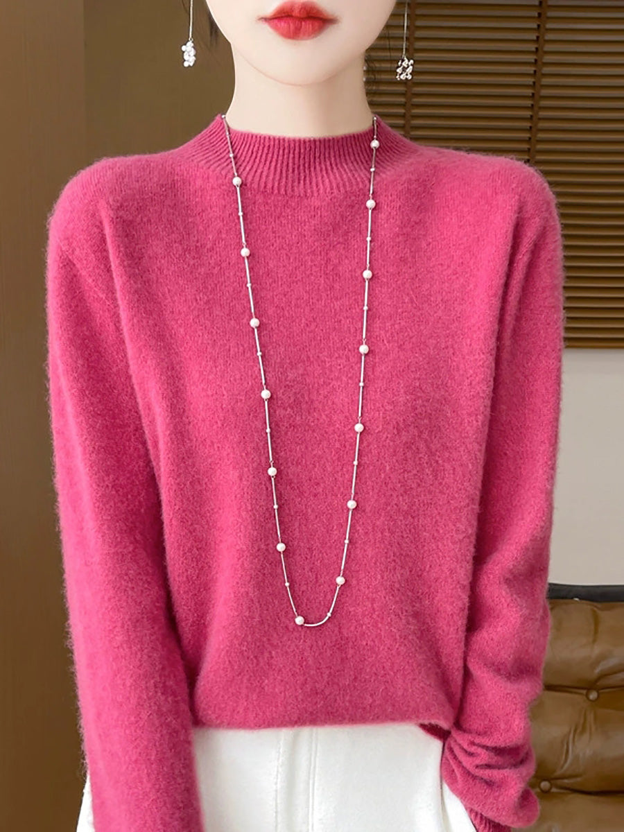 Suéter feminino de inverno com gola alta e estampa artística em cores lisas.