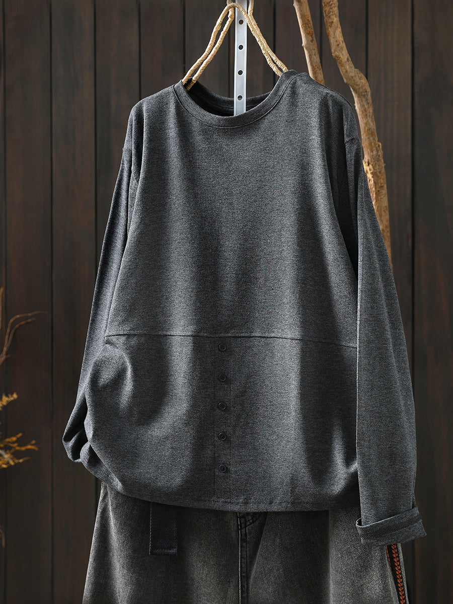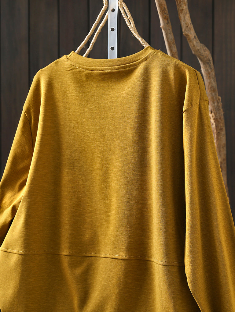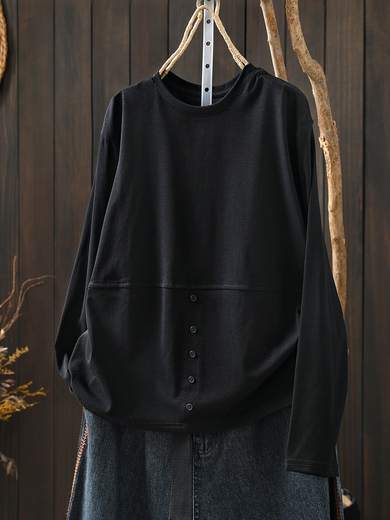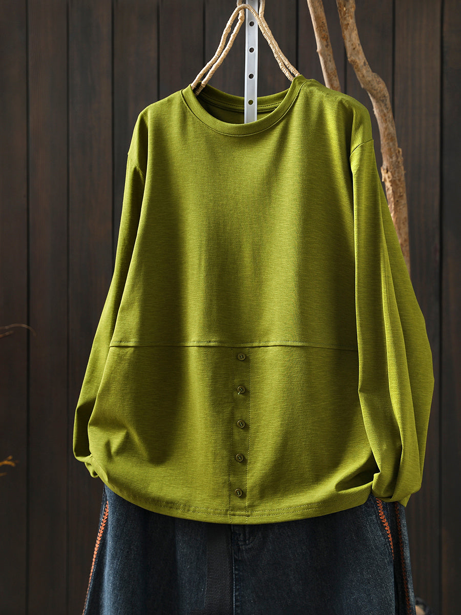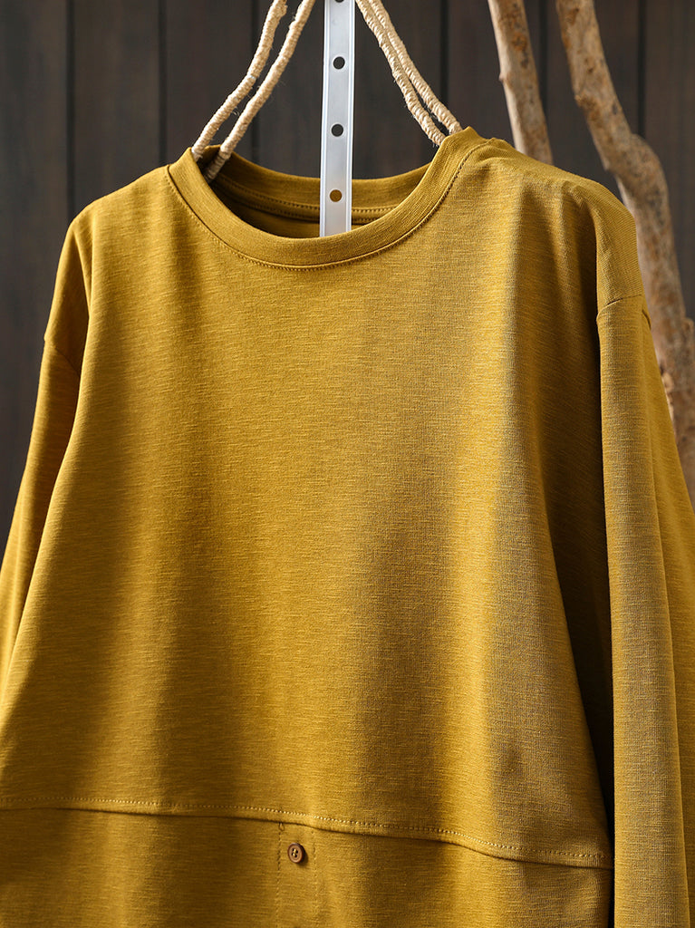 Blusa feminina de algodão com decote redondo, cor lisa e estilo artístico para o inverno.