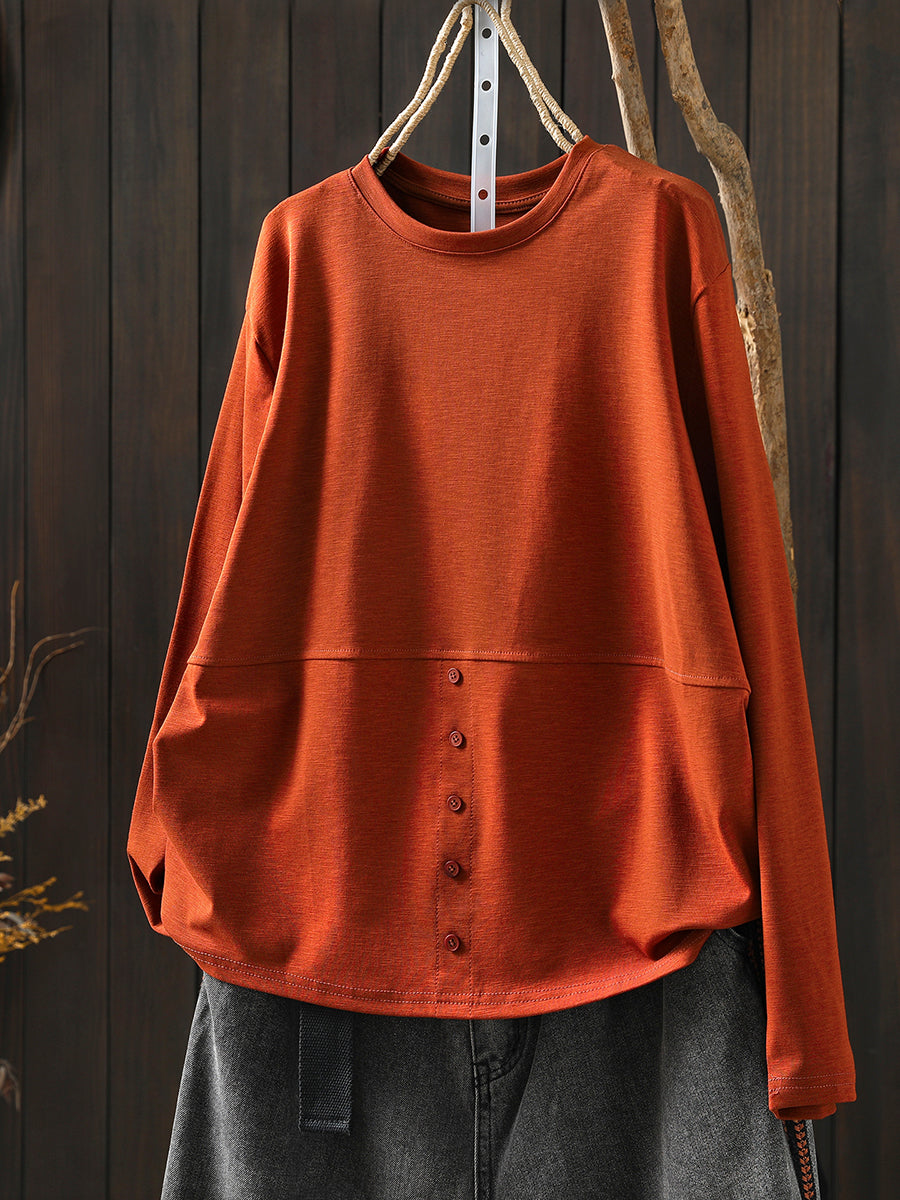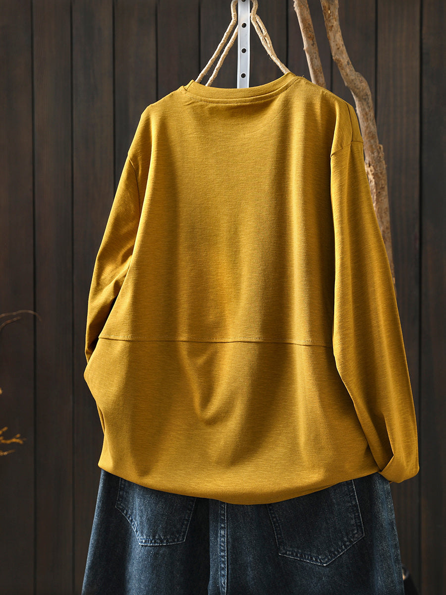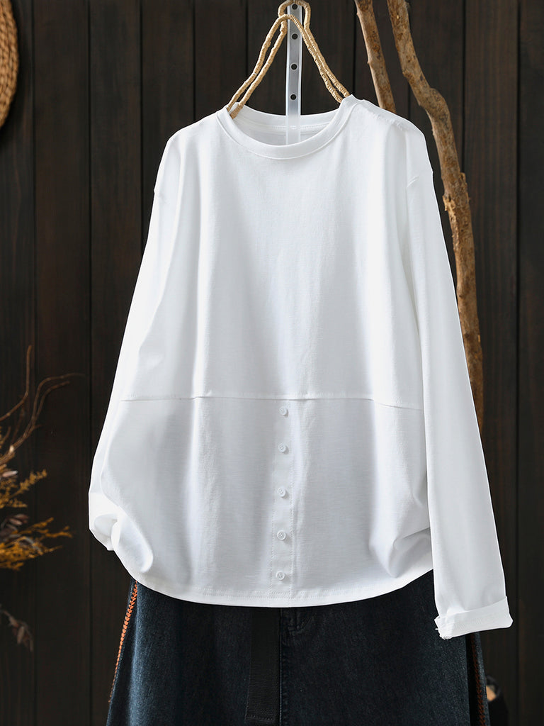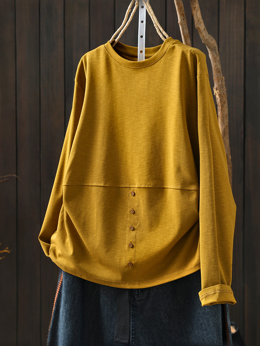 Blusa feminina de algodão com decote redondo, cor lisa e estilo artístico para o inverno.