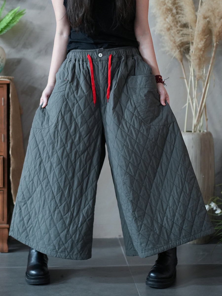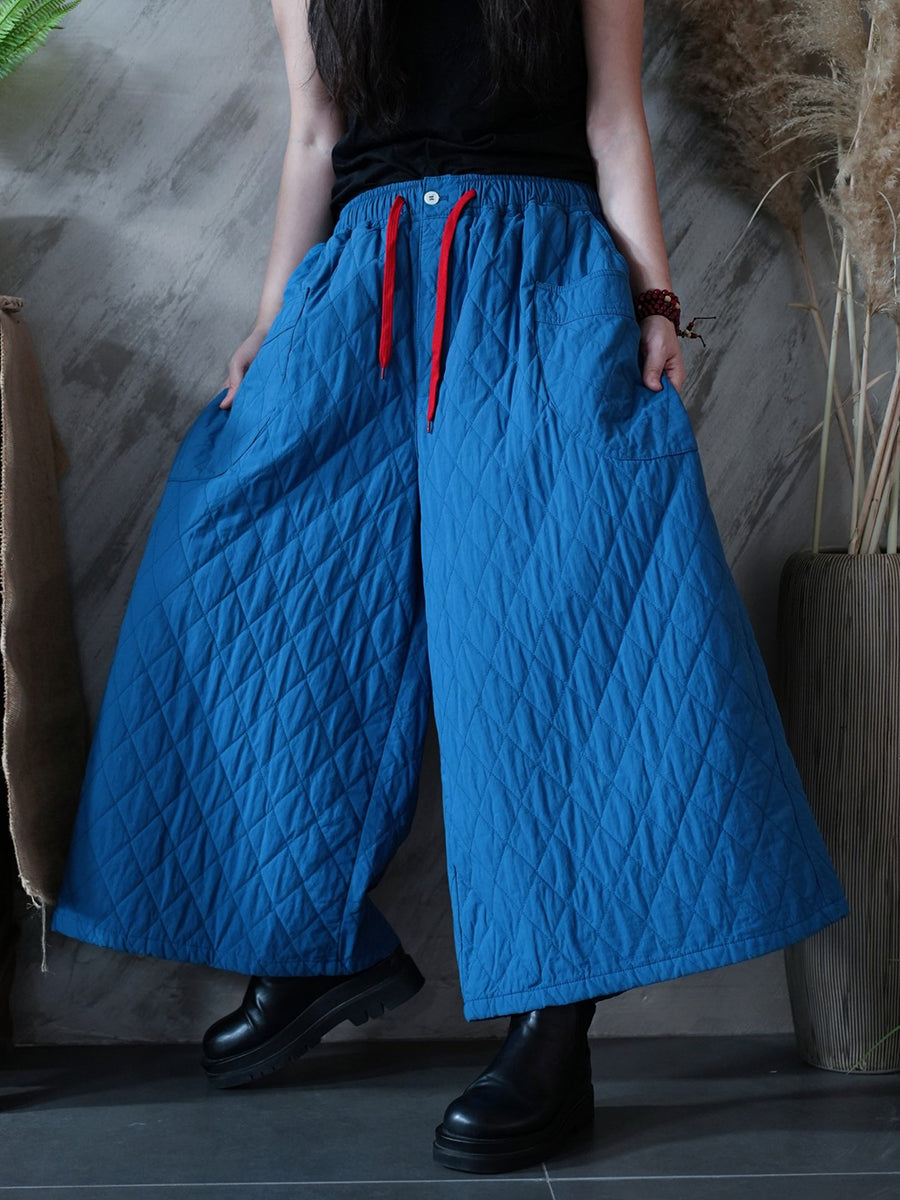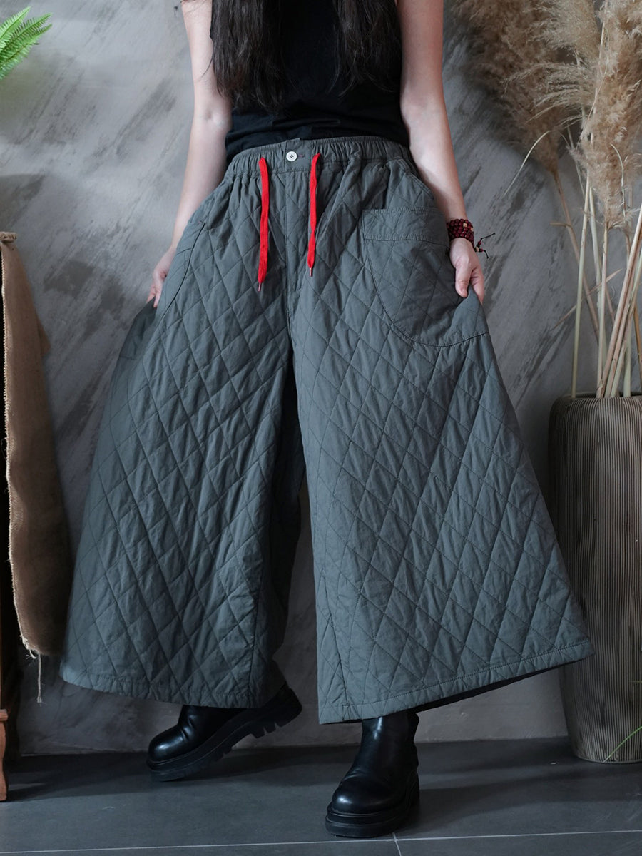 Calça feminina de inverno com modelagem artística, cor lisa e acolchoada, pernas largas.